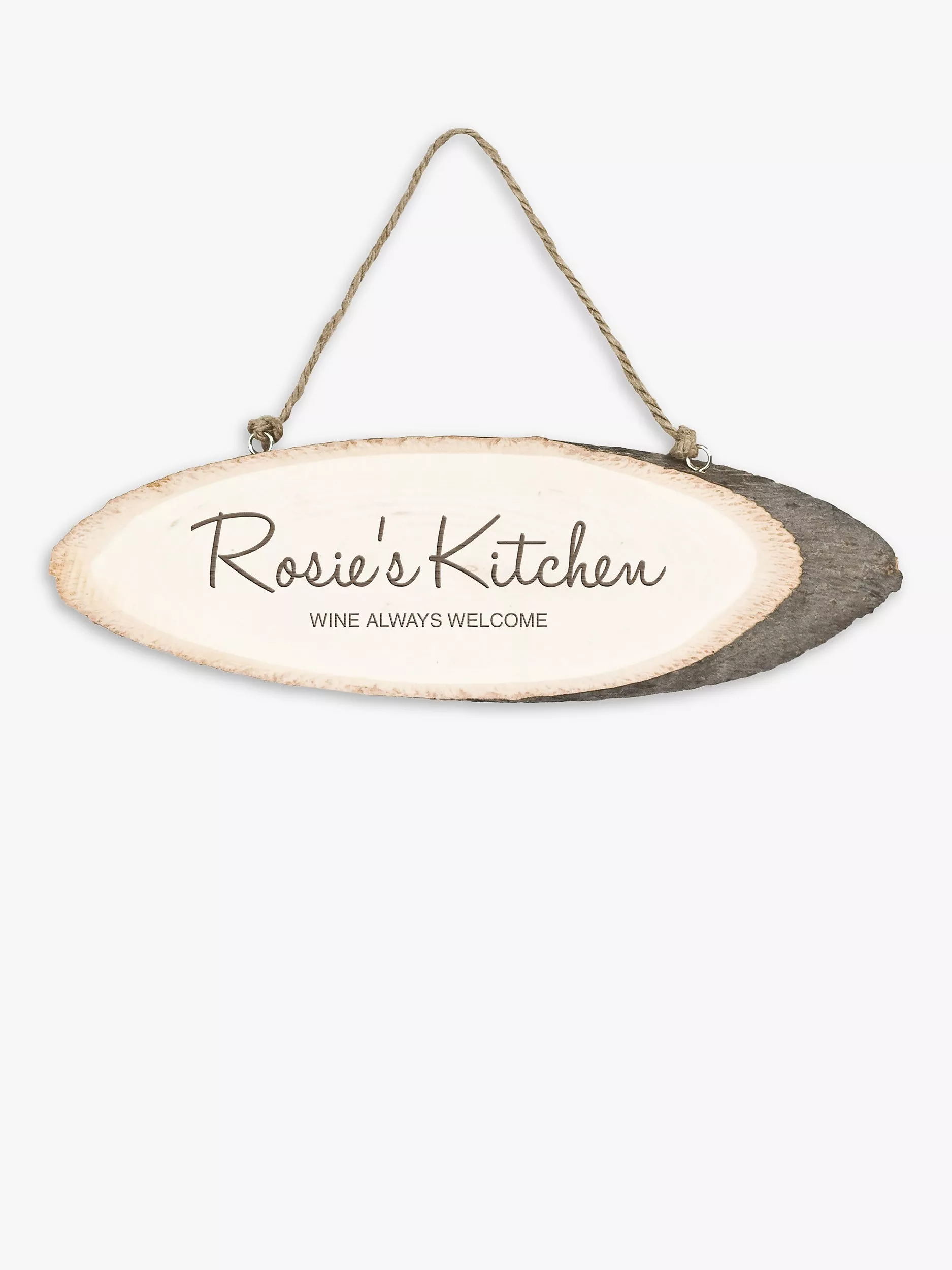 A lovely accessory to brighten up your kitchen, this sign is made from birch wood for a rustic feel and vintage look. Laser-engraved with a name and a message of your choice, it can be hung up with its rustic woven cord adding to the natural feel of the sign.