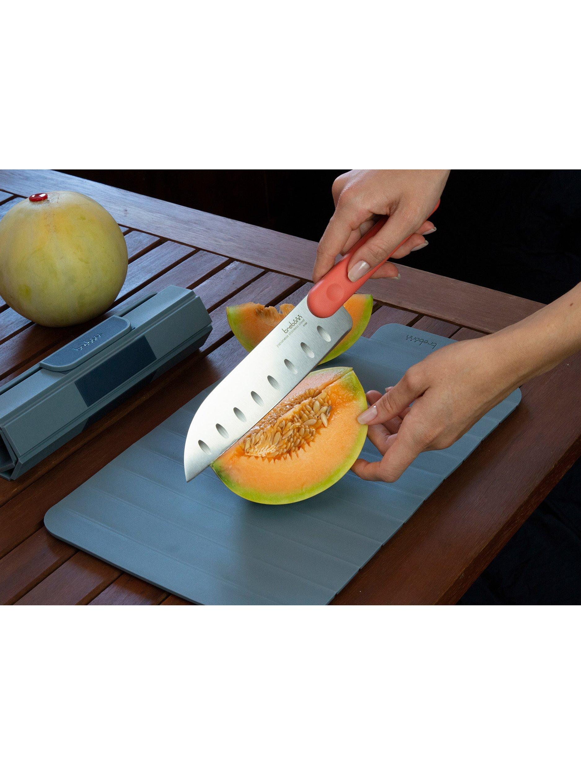 The cutting board base is non-slip material and the board rolls up and fastens with a magnetic closure clip. Space-saving and dishwasher-safe.