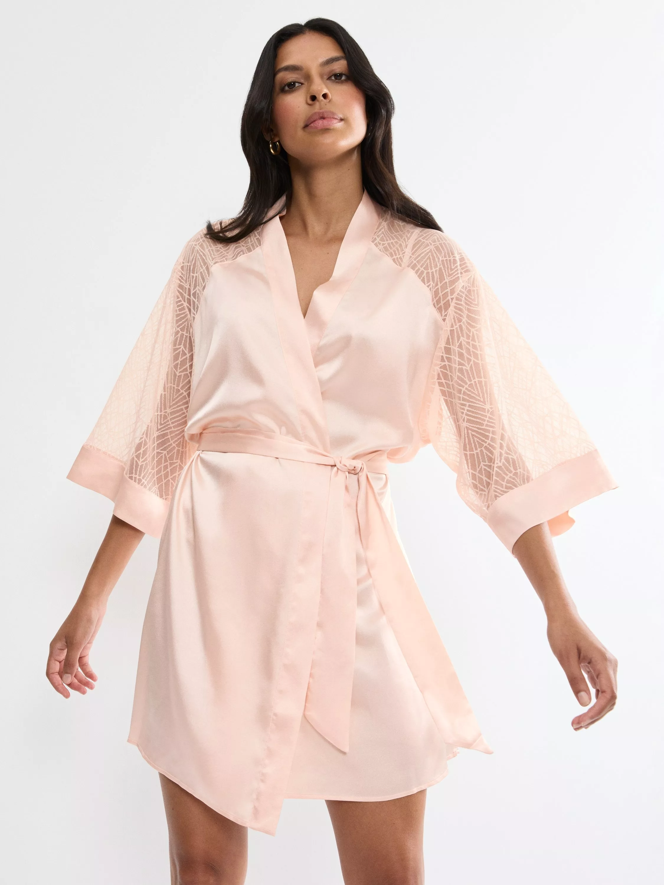A sensual robe, designed with 3/4-length wide sleeves and delicate lace back panels that add refined yet seductive detail. Crafted from shiny satin.