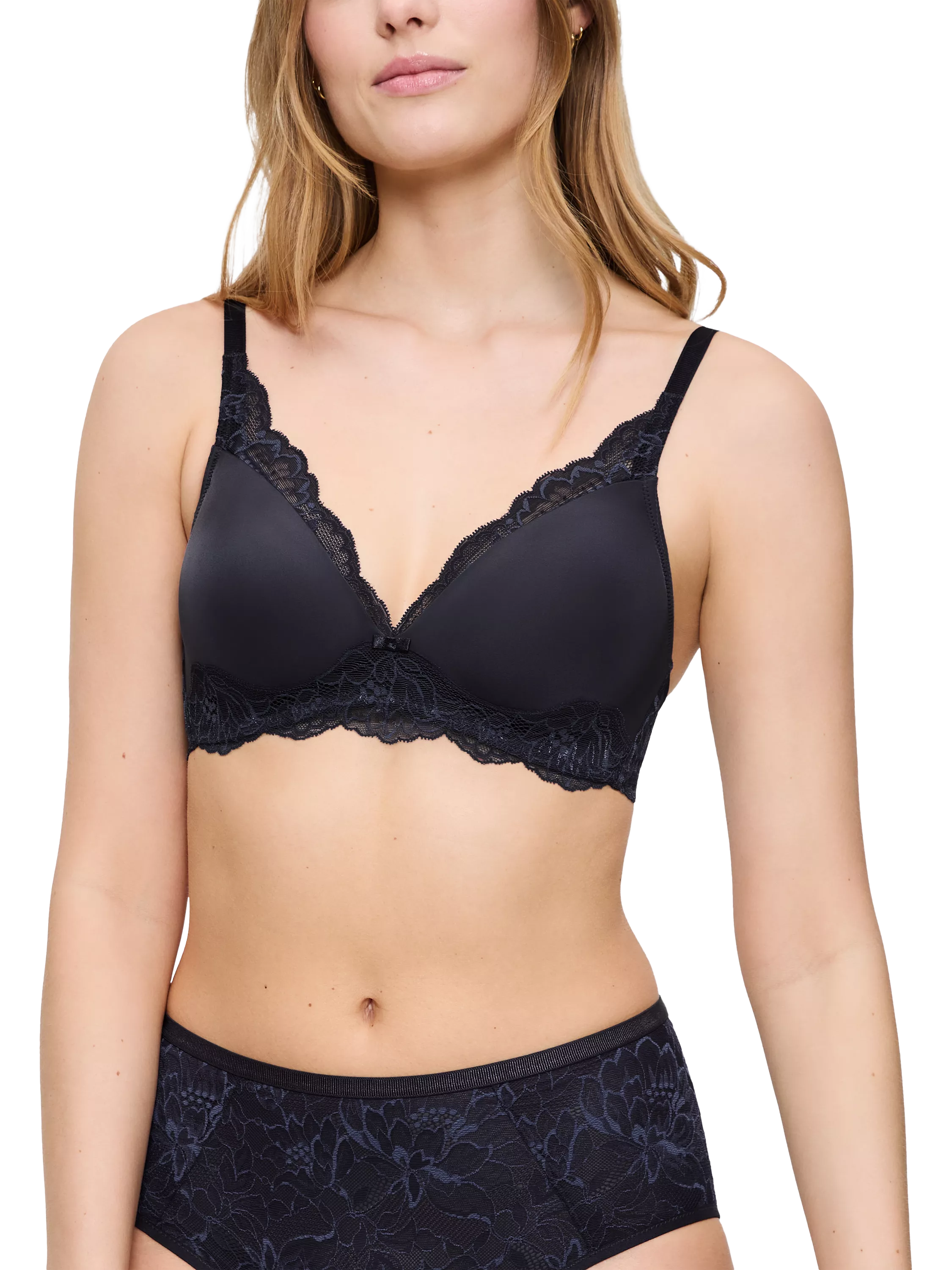 Triumph's Amourette Charm trendy bralette combines seductive style with optimal support, giving you a natural summer-inspired look in all-over iconic lace. Supportive side slings and lining available in bigger cups.
