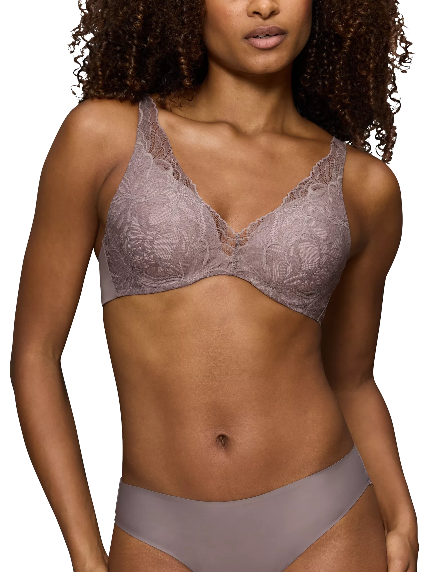 Made with smooth floral lace and creamy soft microfibre, this padded deep neck bra is designed with flexible wire and vanishing cup edges. It's made with a special cup which centralizes and lifts the breast. The integrated bust cushions adjust the lift stronger for smaller busts and gentler for larger ones. It is a bra women can trust but do not feel.