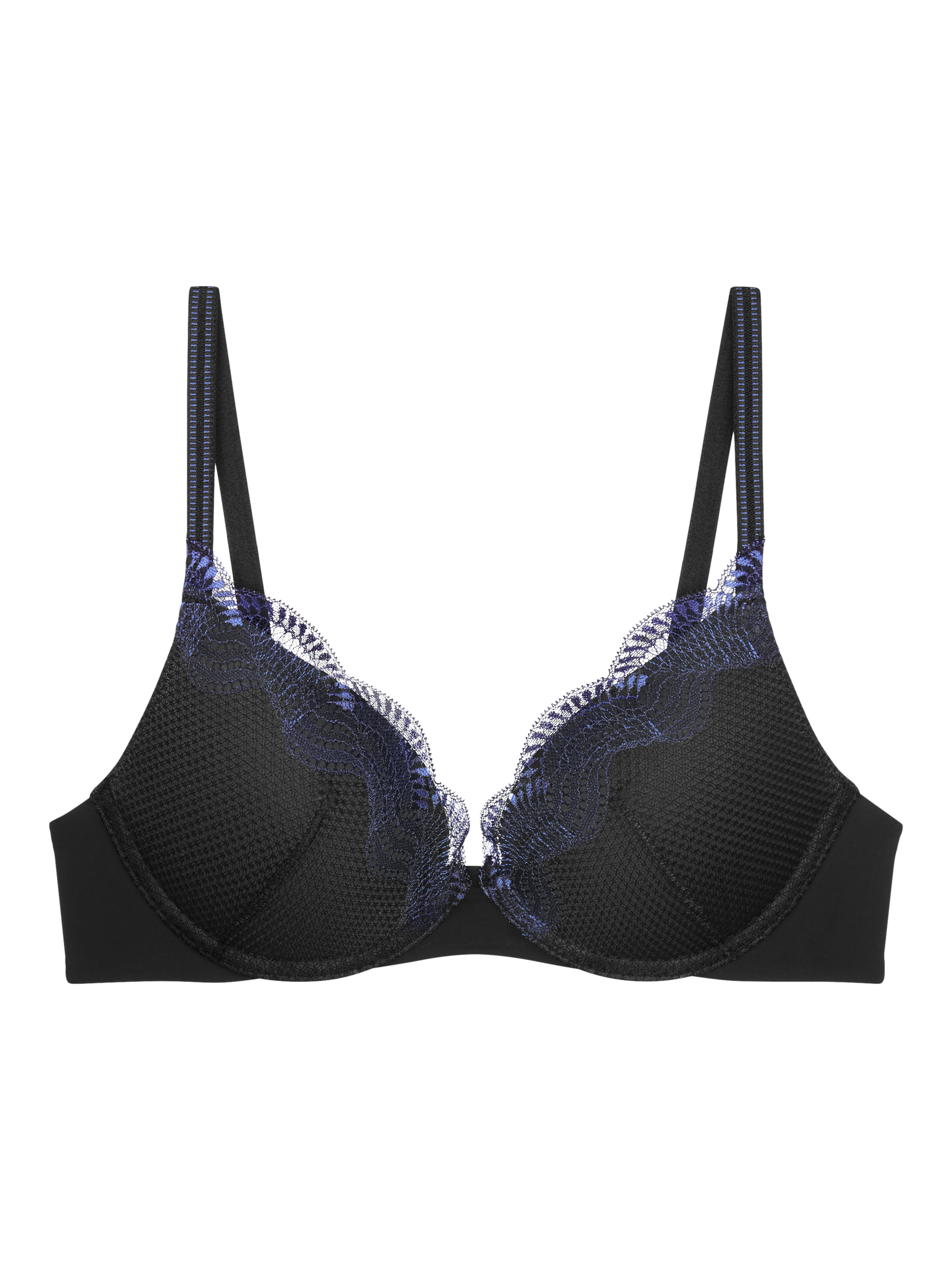 This wired push-up bra enhances your silhouette with its graded cookies that adjust for each size. Crafted from bi-coloured lace with blended graphic and floral patterns for a modern, elegant look. The Comfort wire ensures long-lasting comfort and support, while the decorative straps add a stylish flair.