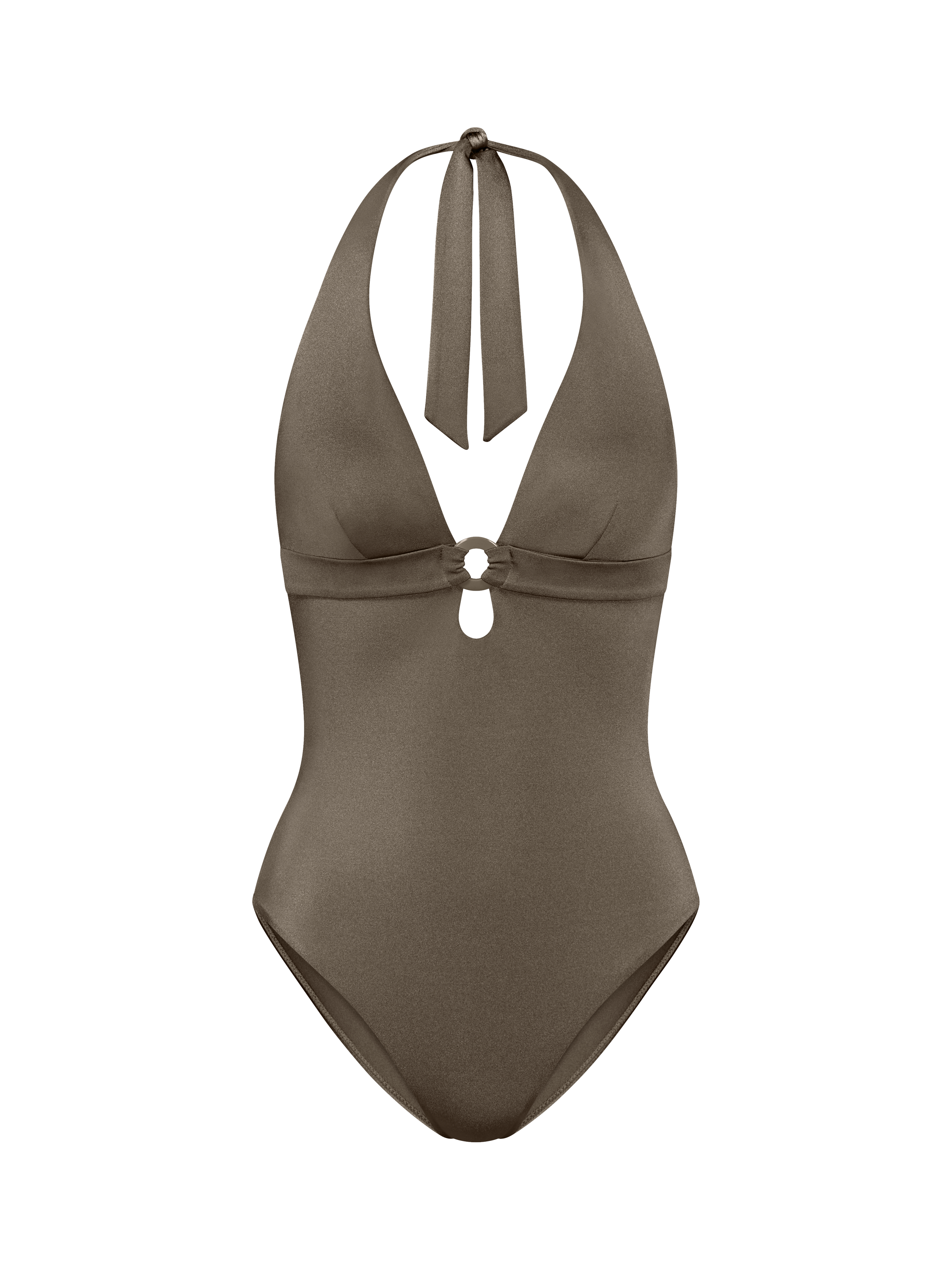 This padded one-piece swimsuit is designed to deliver a "wow" effect. Its deep plunge, decorated with a central ring, creates a daring and feminine silhouette. Crafted from shiny fabric made with partially recycled polyamide, it offers a soft feel and adds glamour to your look.