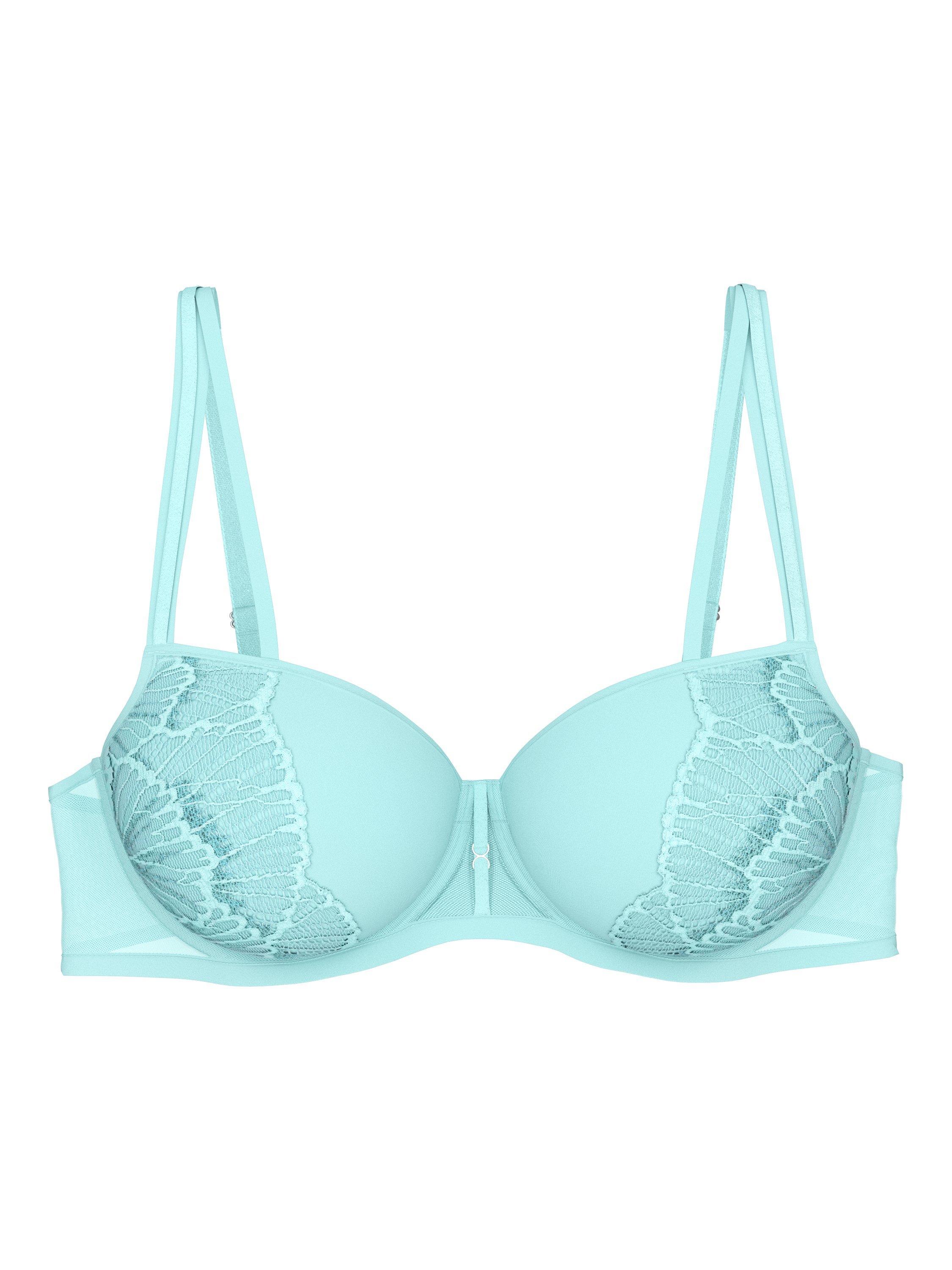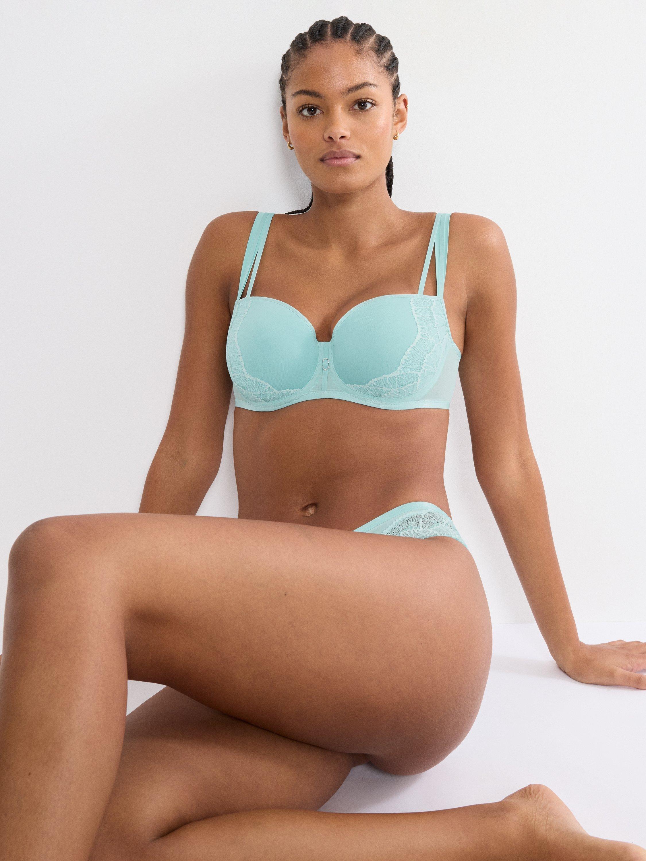 This wired, padded balconette bra is made of lace and fabric enhanced with iridescent lurex yarn. It offers light padding with spacer cups for lift and support, especially for larger bust sizes. Combined with ergonomic straps and decorative lurex trim, this piece offers a voluptuous look.
