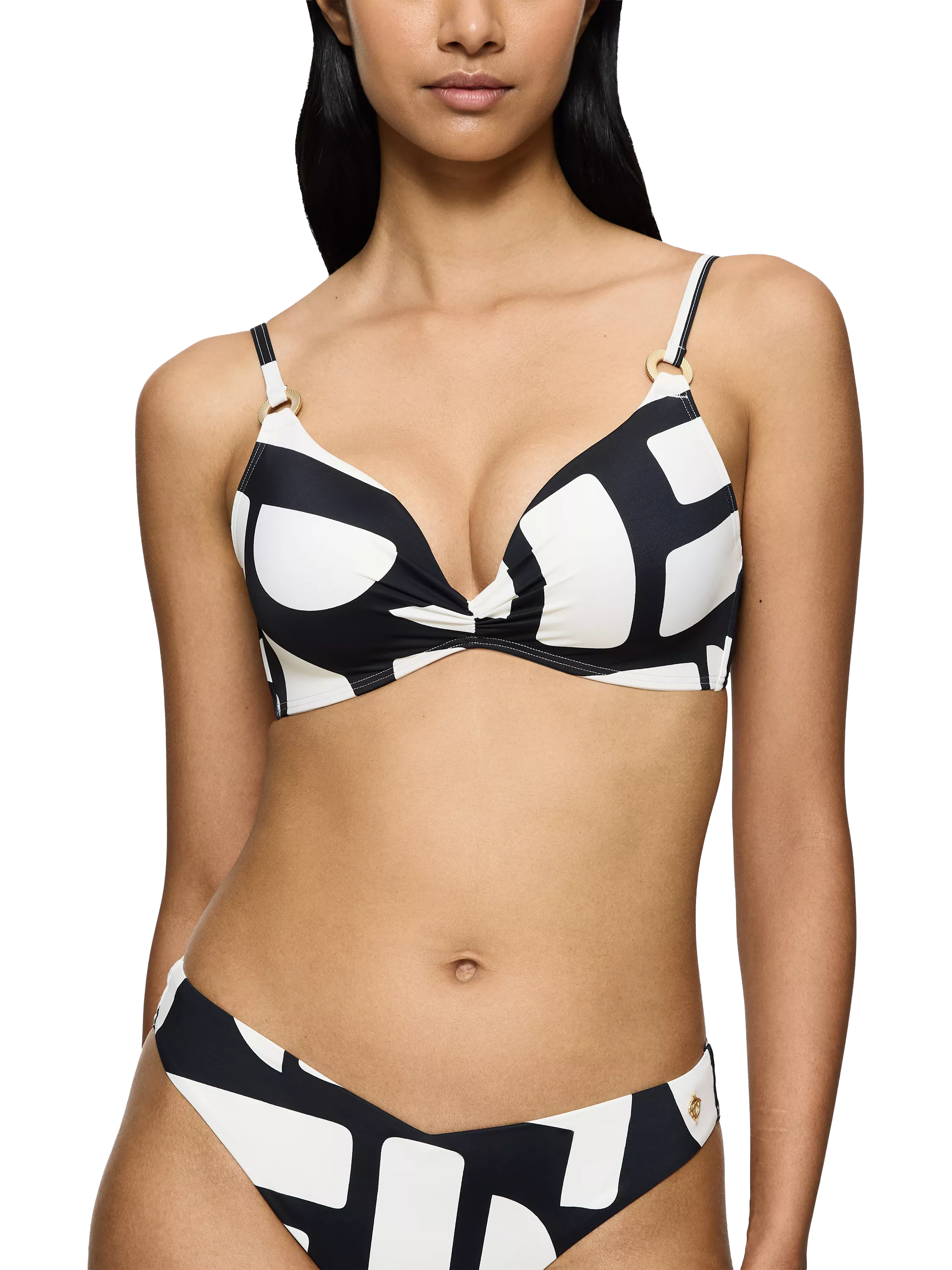 This sweetheart-shaped padded bikini top offers wireless comfort and flattering cleavage. It features adjustable straps embellished with metal rings.