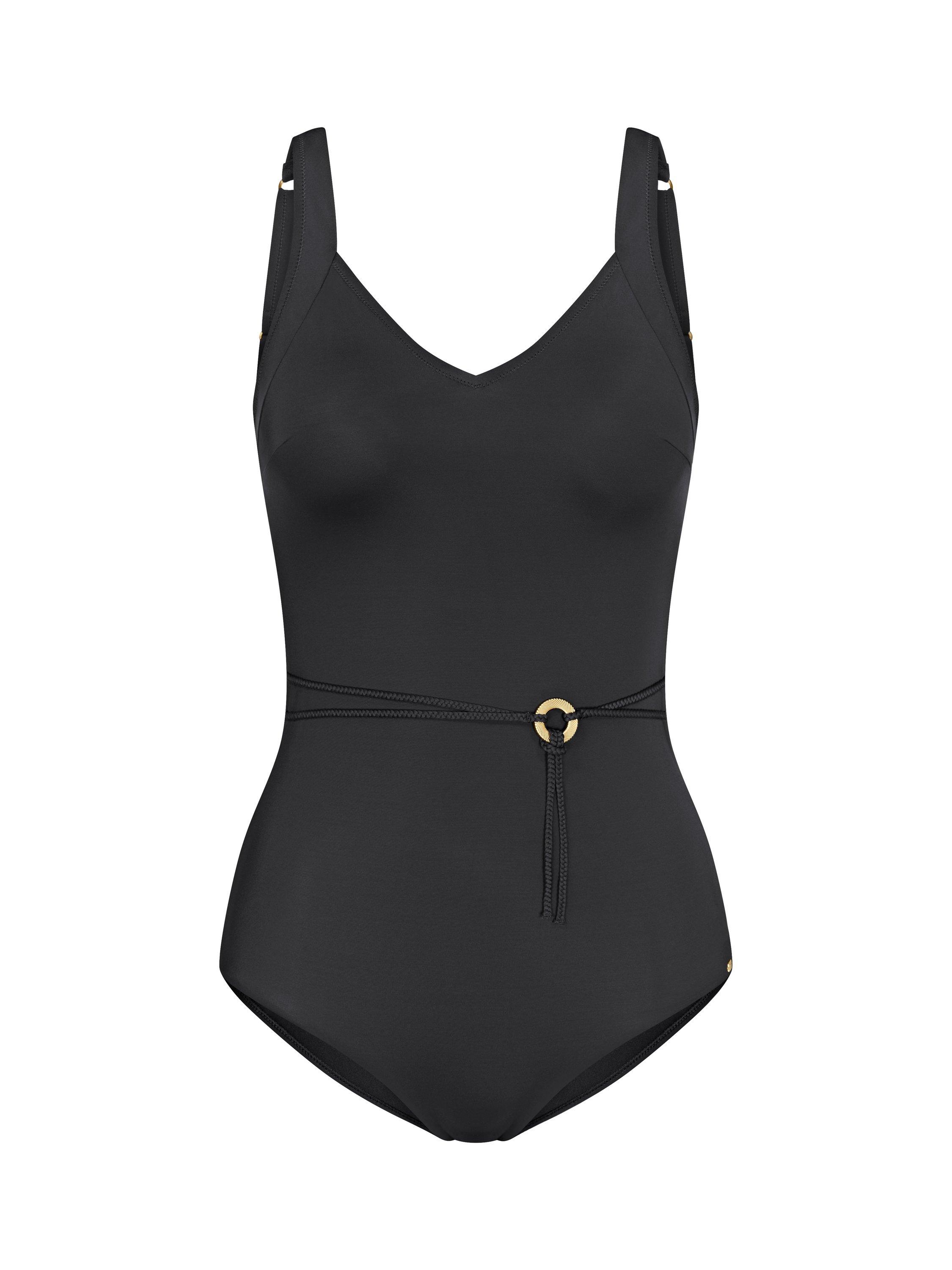 This non-wired, padded swimsuit features a delicate braided belt with a decorative metal ring and a flattering V-neckline. It is soft to the touch and built to last.