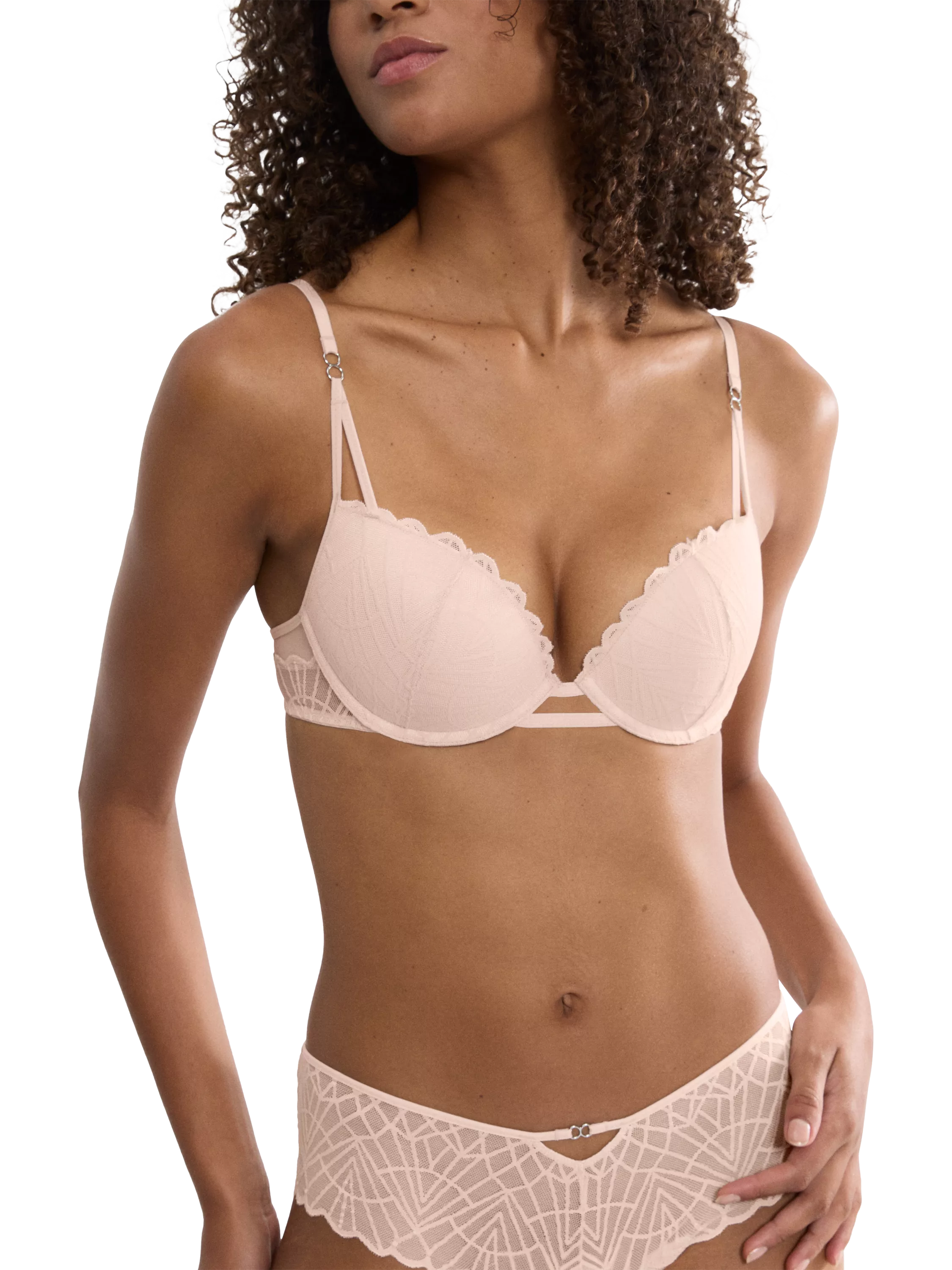 With a graphic lace design and a push-up neckline, this bra has lightweight cups and a comfort wire to ensure a comfortable fit. Its minimal-coverage design aligns with a younger, seductive concept, which includes signature double ring details on the straps.