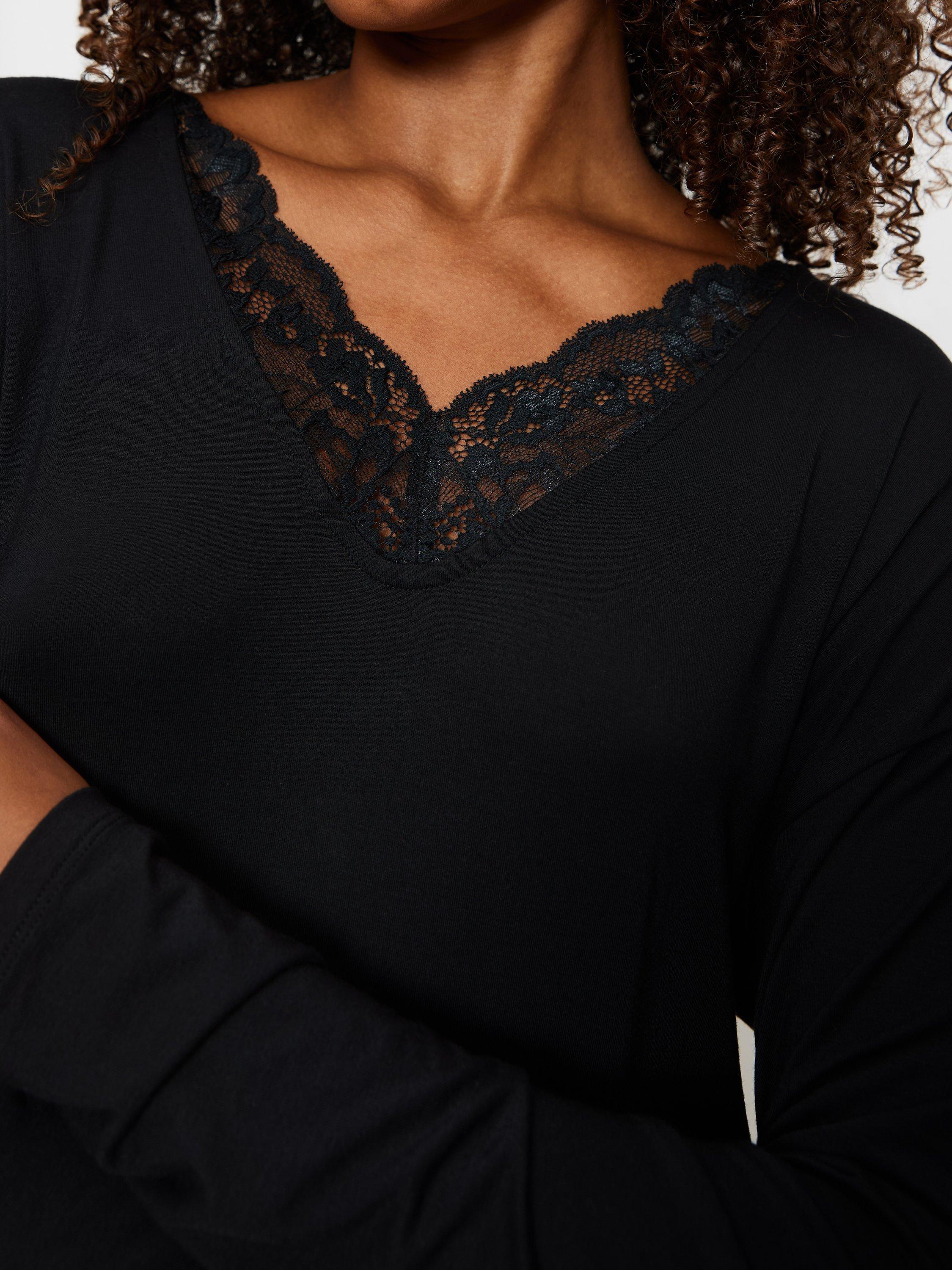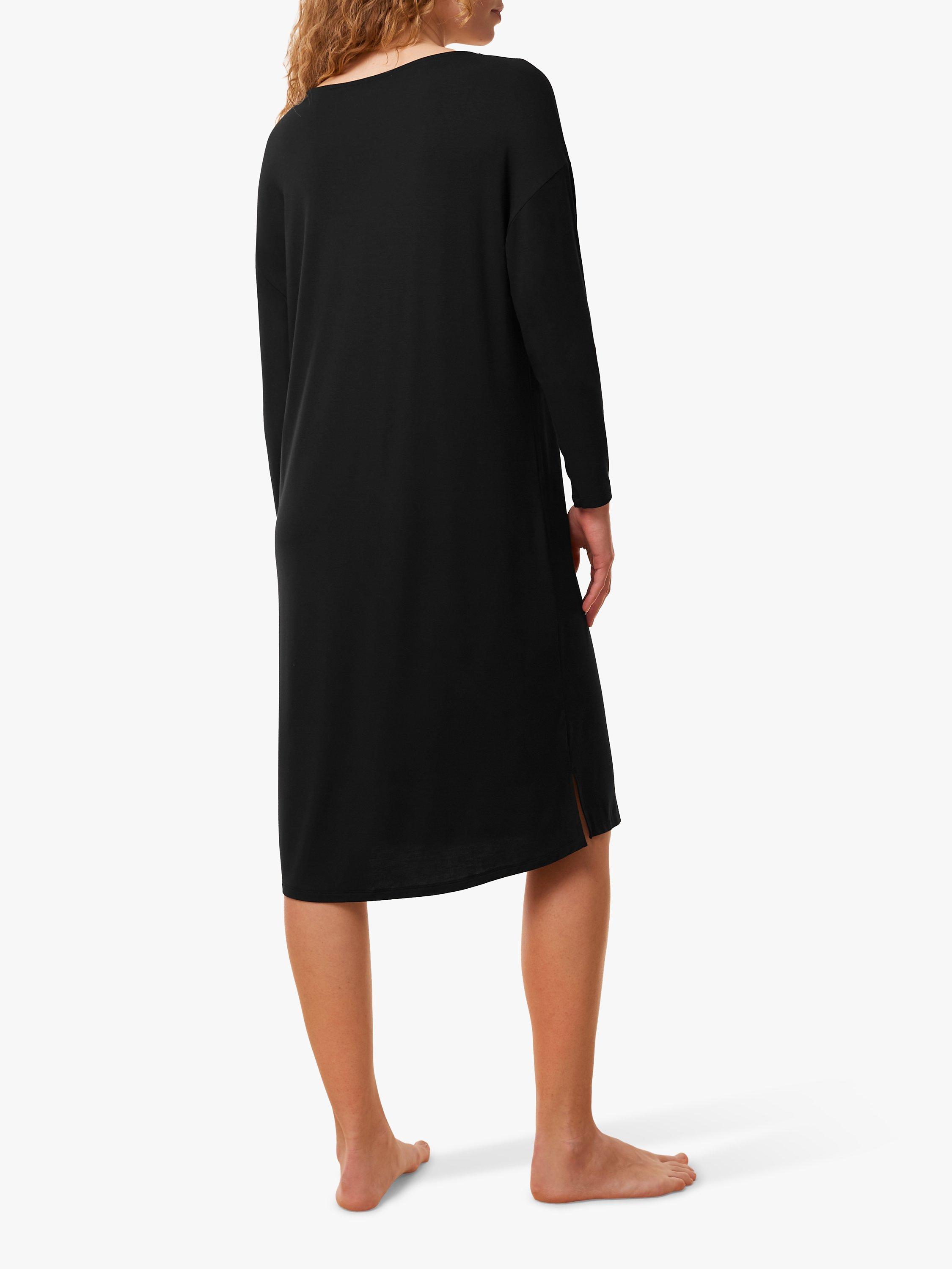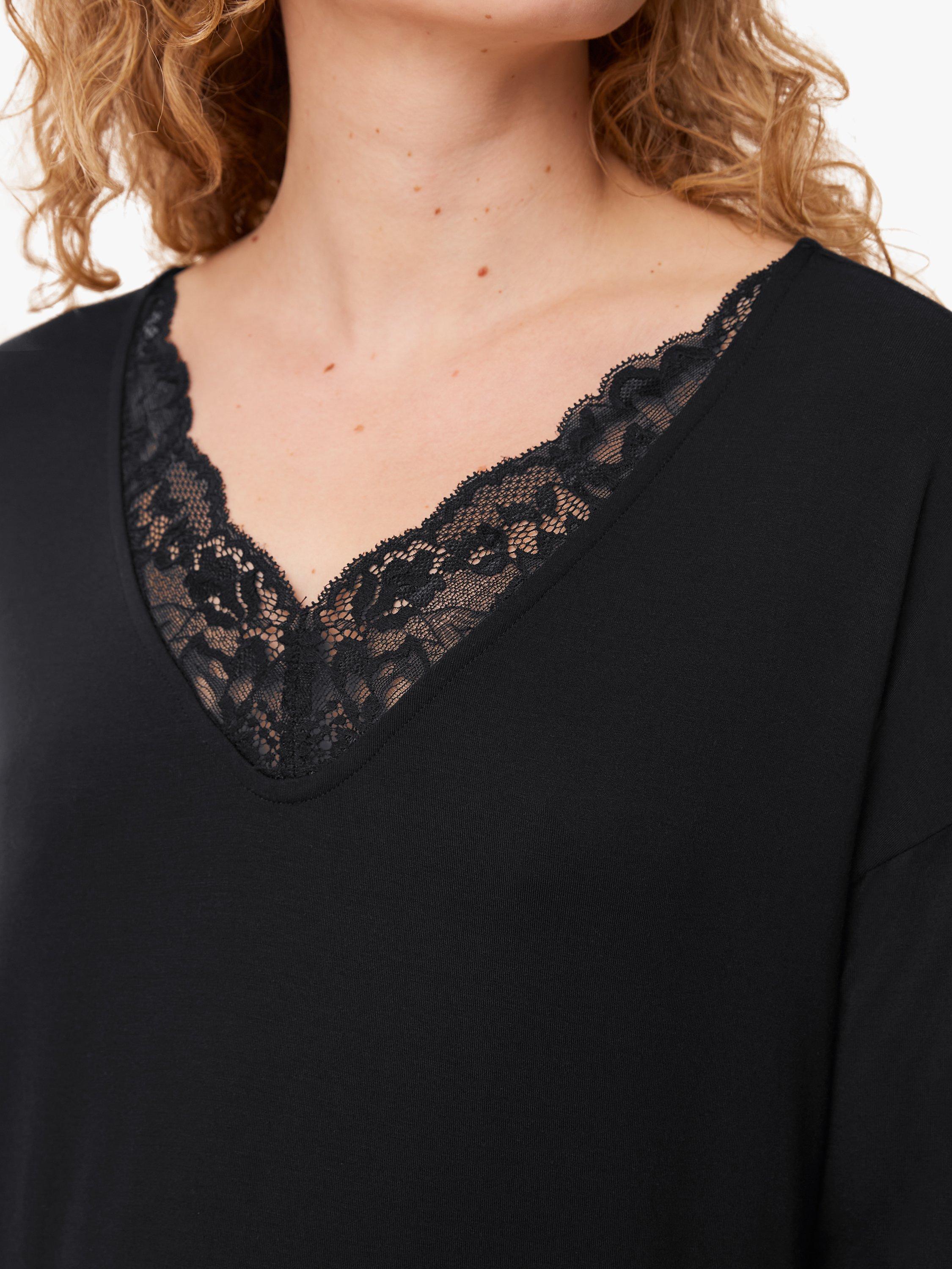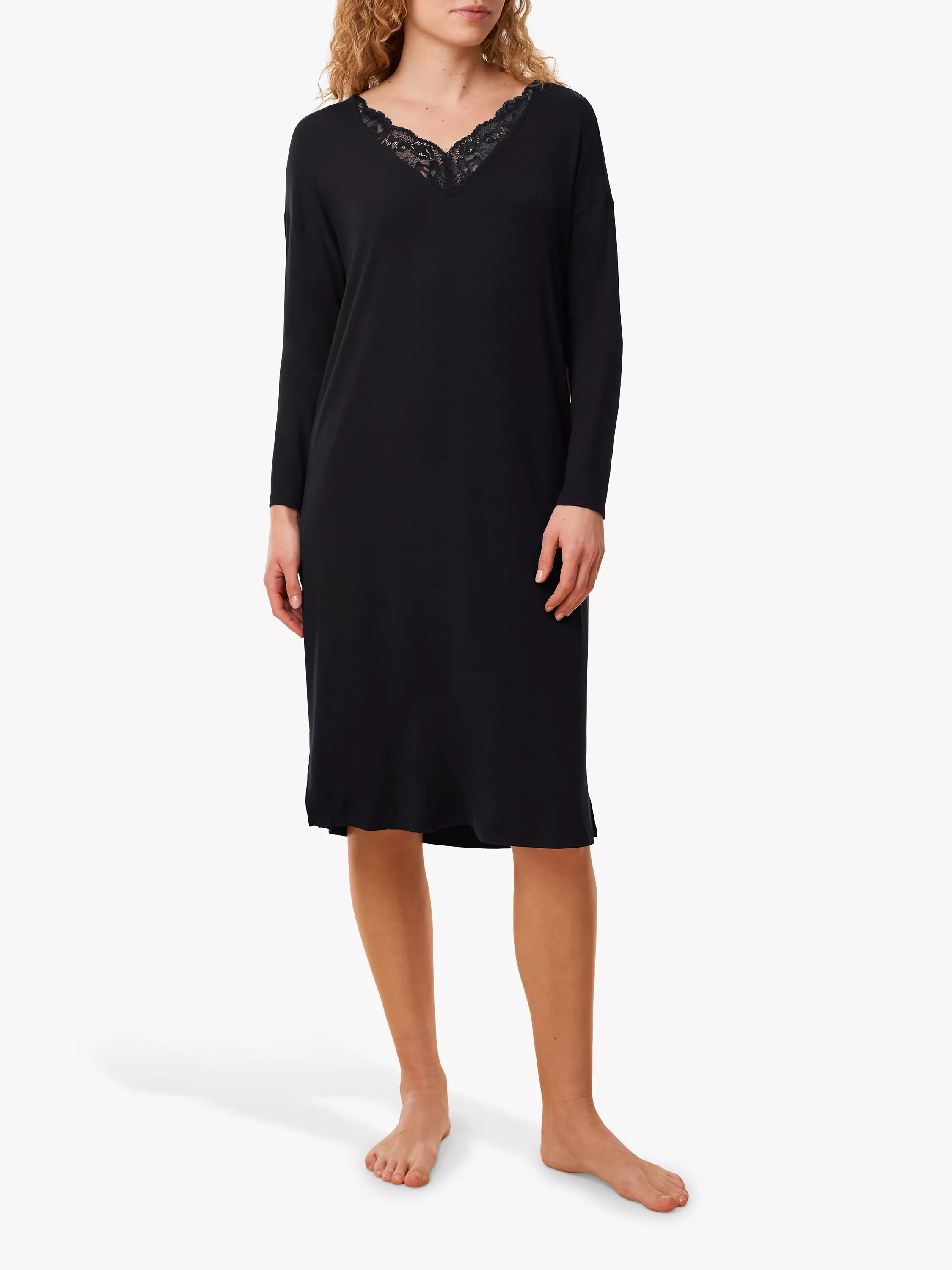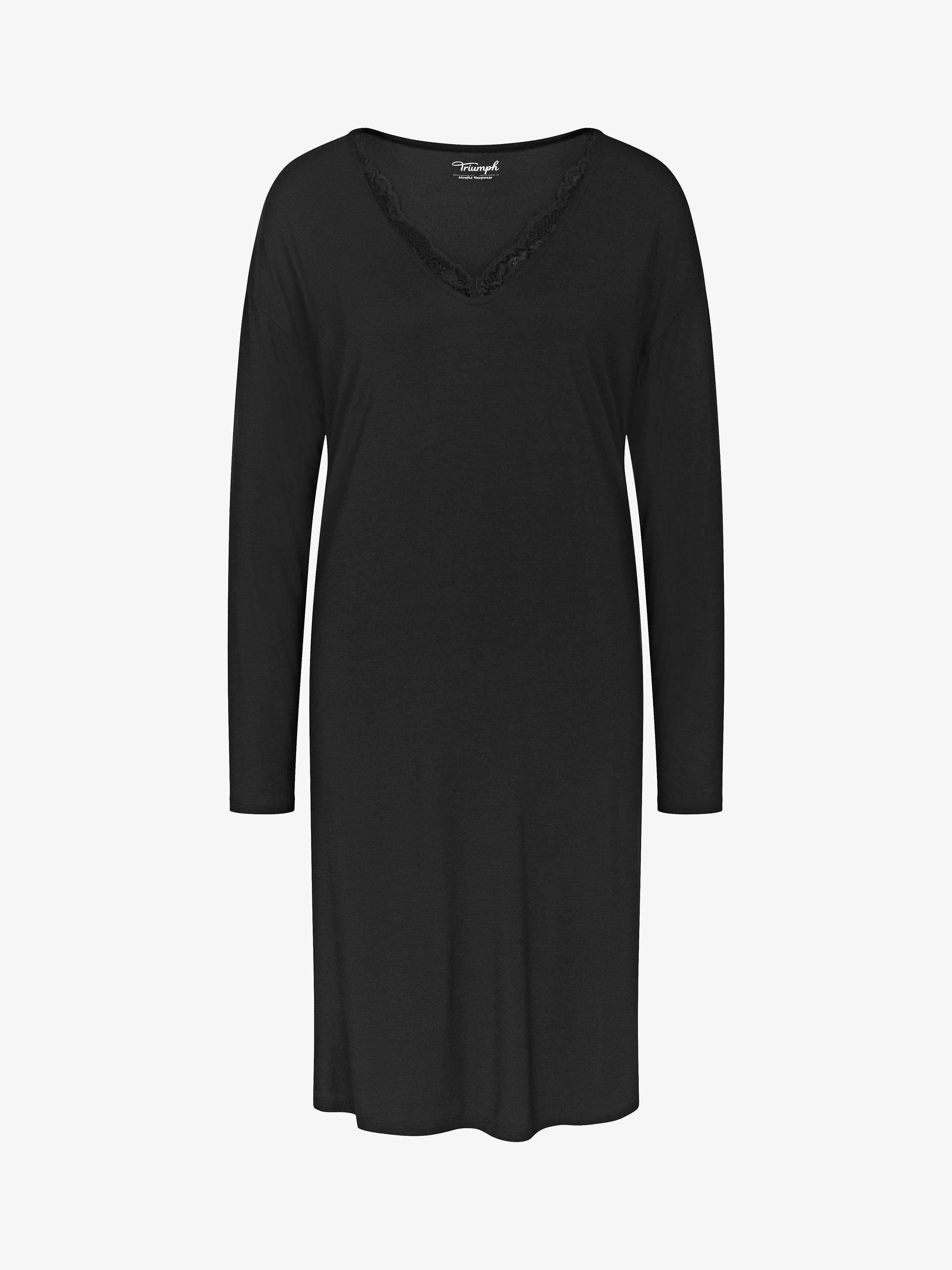 Crafted from 94% certified TENCEL modal fabric, this long-sleeved nightdress offers a gentle touch against your skin. The long sleeves and knee-covering hem are ideal for cooler nights, while the elastic fabric guarantees easy care and a flattering silhouette. Enriched with delicate lace inserts, it strikes the perfect balance between comfort and elegance.