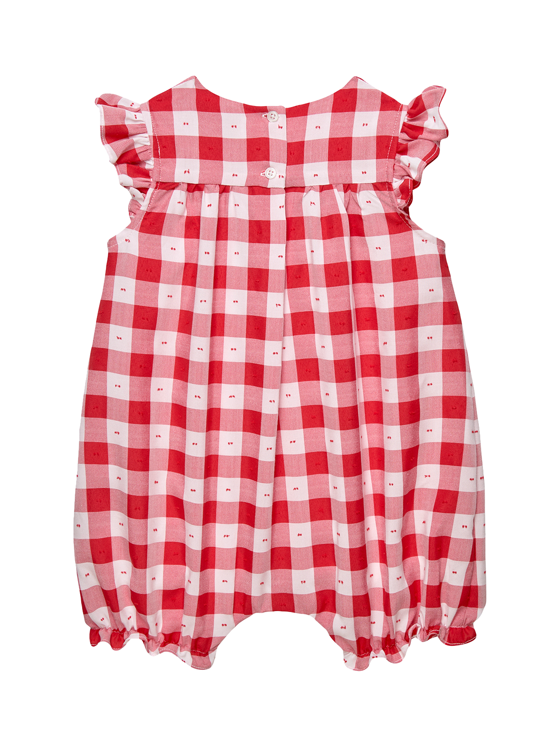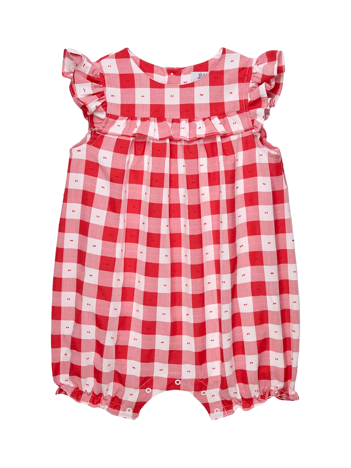 Coming in a classic red and white gingham fabric, this romper for baby girls features pretty, delicate frill cap sleeves and self-fabric ruffle detailing across the chest. The addition of elasticated ankle cuffs create a sweet silhouette, while popper fastening allow for easy dressing and changing.