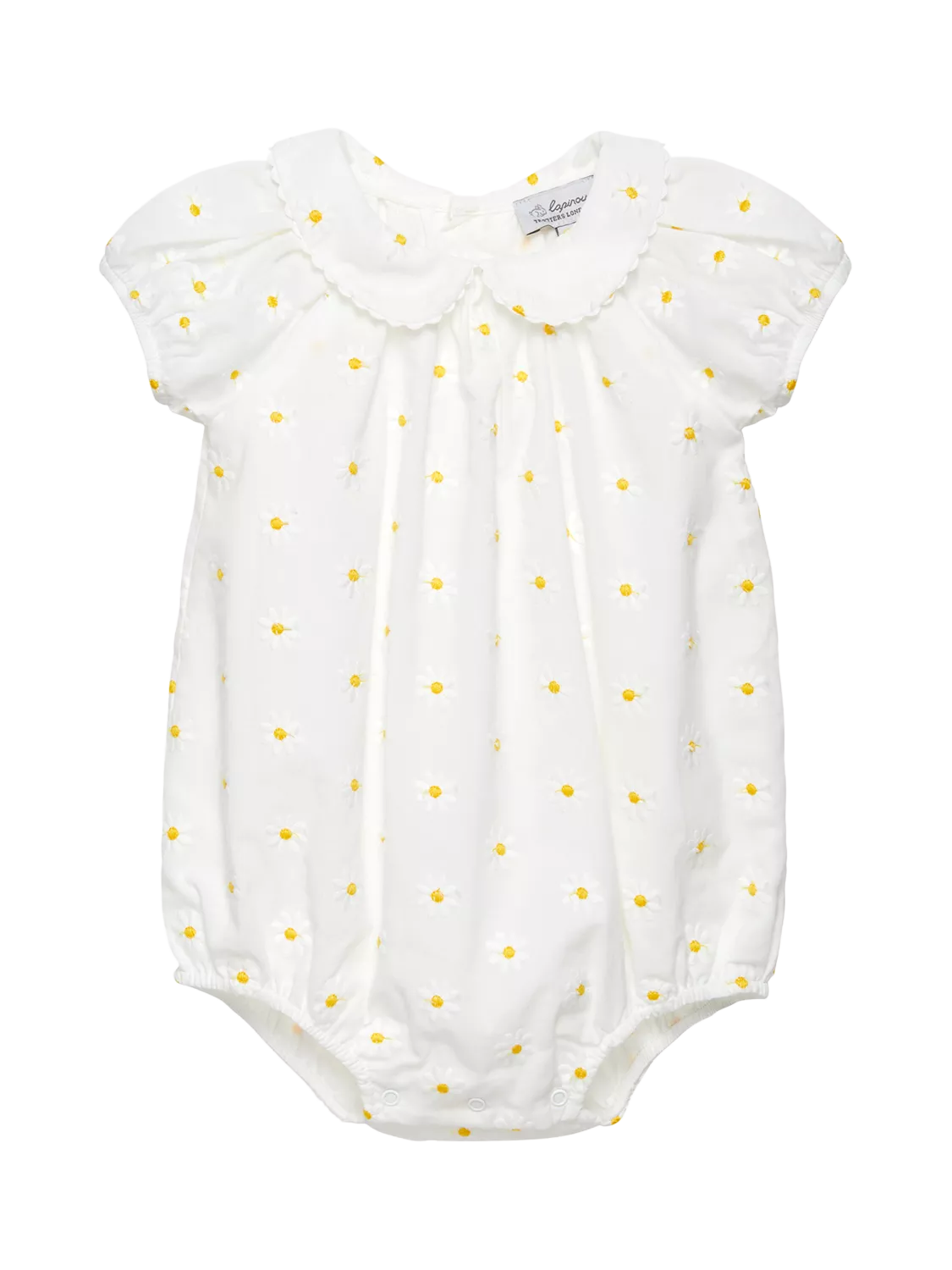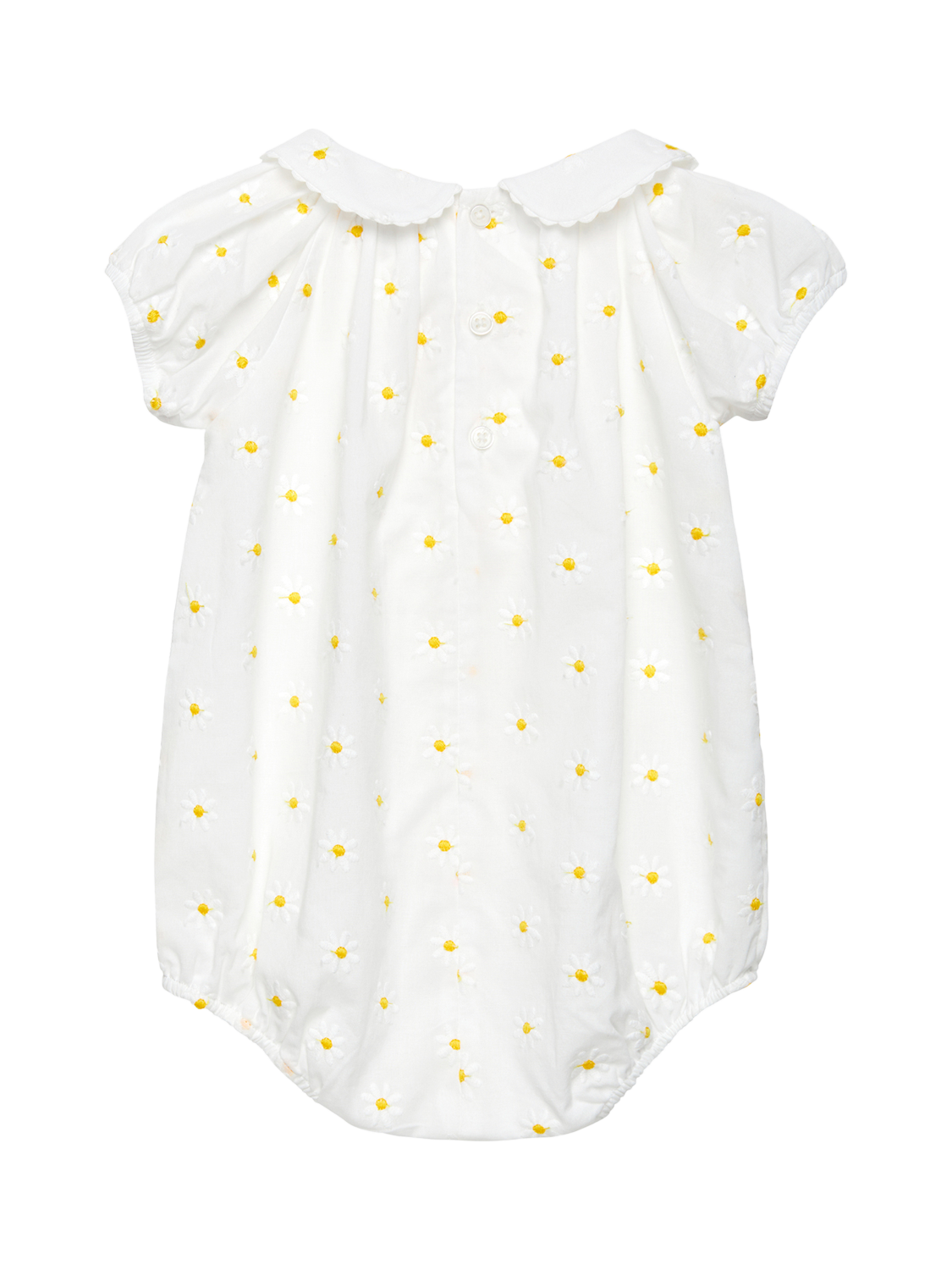 Made in a timeless white, and finished with delicate embroidered daisy detailing, this elegant romper makes a stylish and comfortable outfit. It's finished with puff sleeves, a smart Peter Pan collar, pearlised back button fastenings and leg poppers for easy changing.