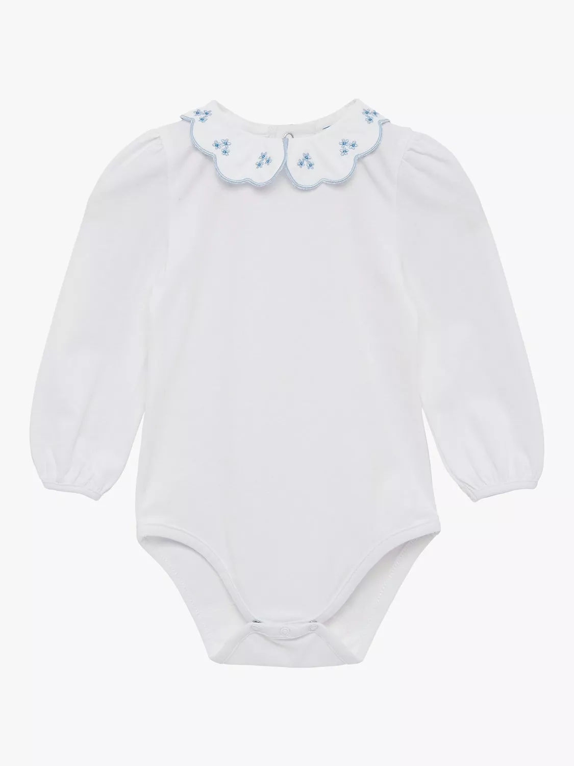 A super soft and stretchy all-in-one designed with a pretty scalloped collar that's embroidered with floral detailing. Ideal for layering under bloomers, rompers and pinafores, it's perfect for smarter occasions and has popper fastenings at the back and the leg for easy changing.