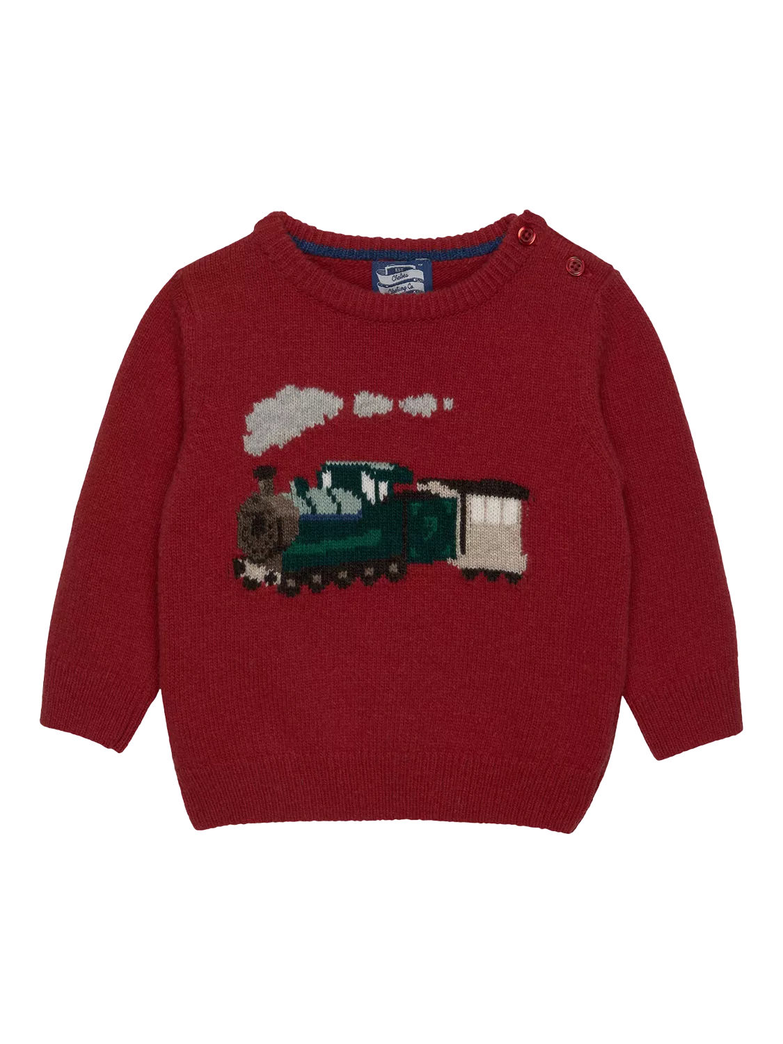 This warm, wool mix jumper comes in a rich red colourway that is sure to get them noticed! Featuring a classic intarsia steam train design on the front, it's just the ticket to keep your young one right on track for the perfect transitional outfit.
