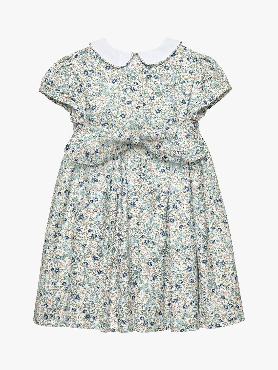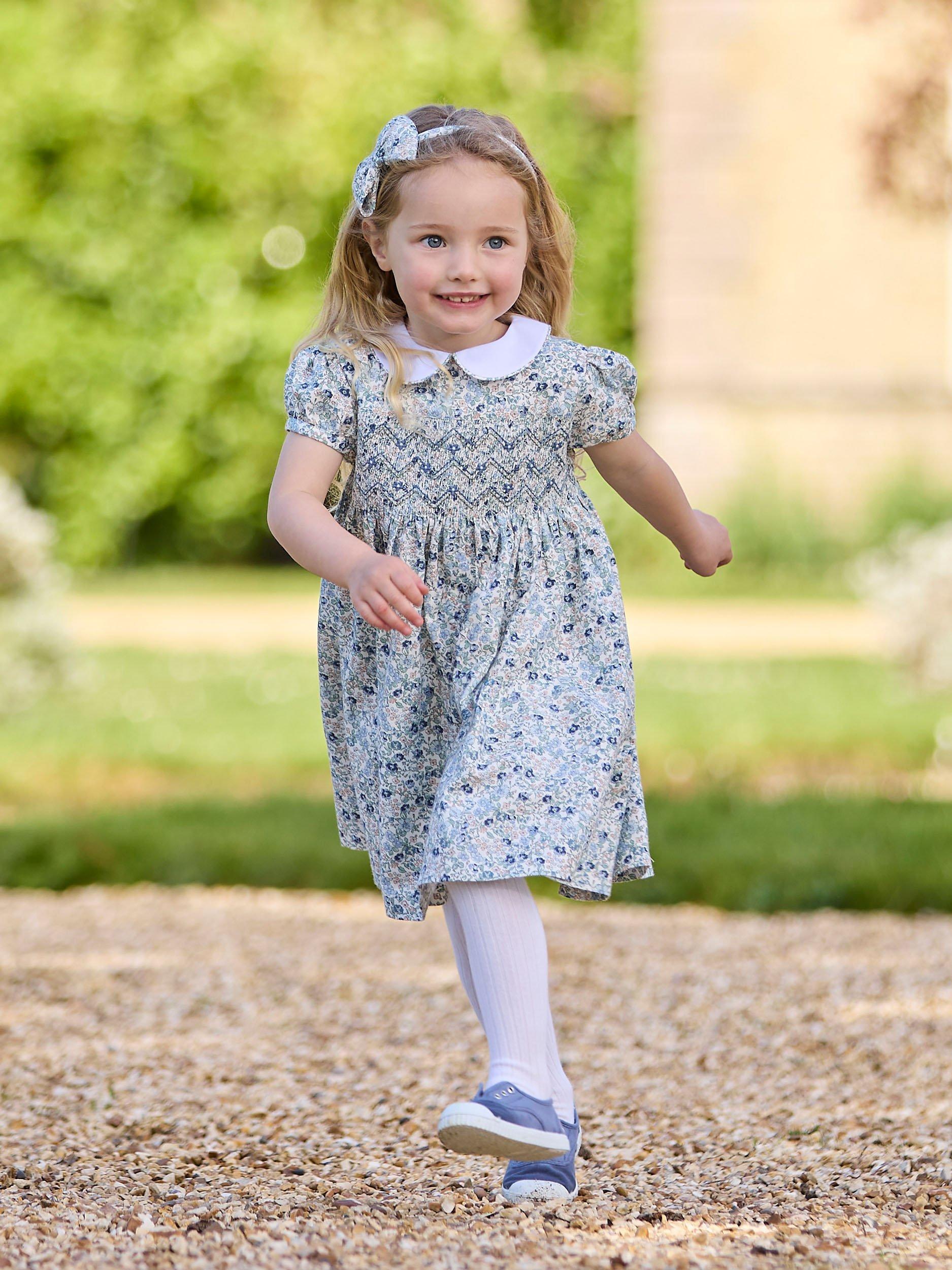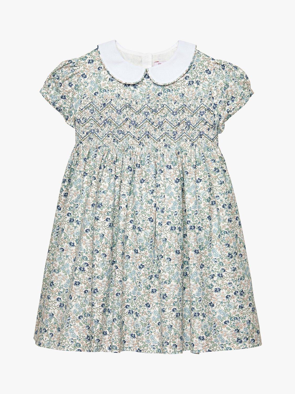 A Trotters classic, this traditional smocked dress comes in pretty floral bloom print and features a contrasting white Peter Pan collar with matching floral piping trim. Made from 100% cotton, it comes fully lined and features a matching tie at the back for the perfect finish.