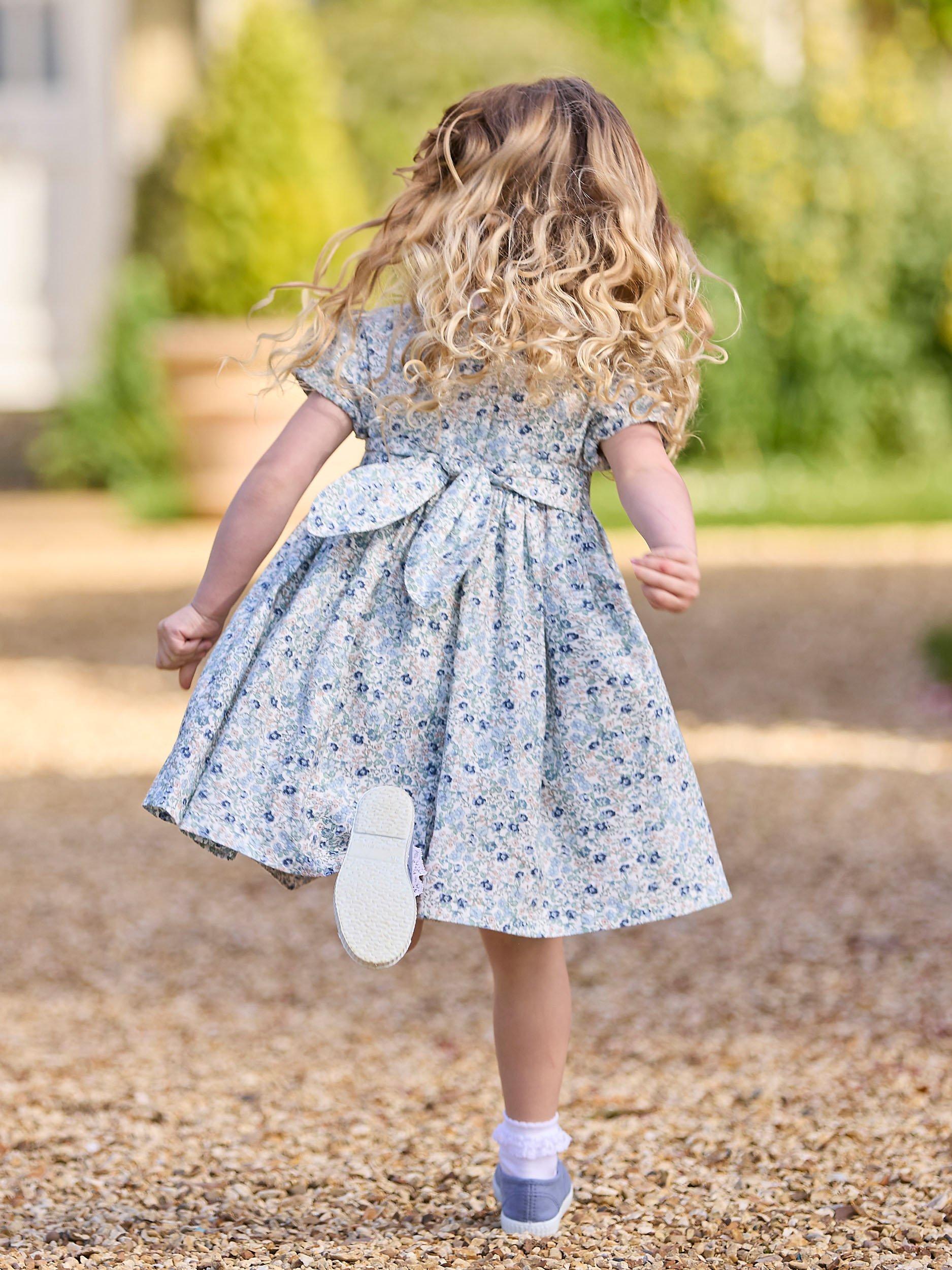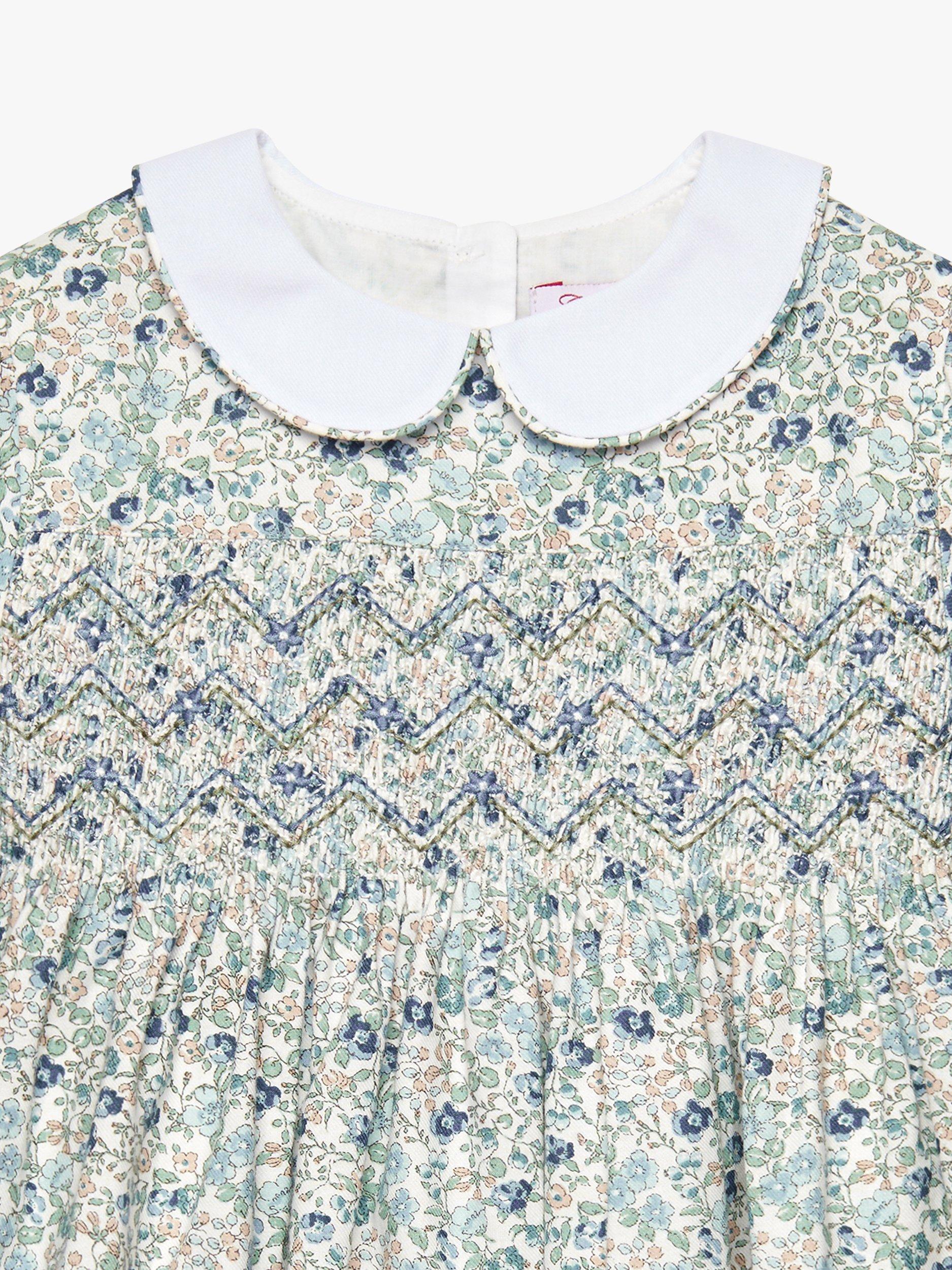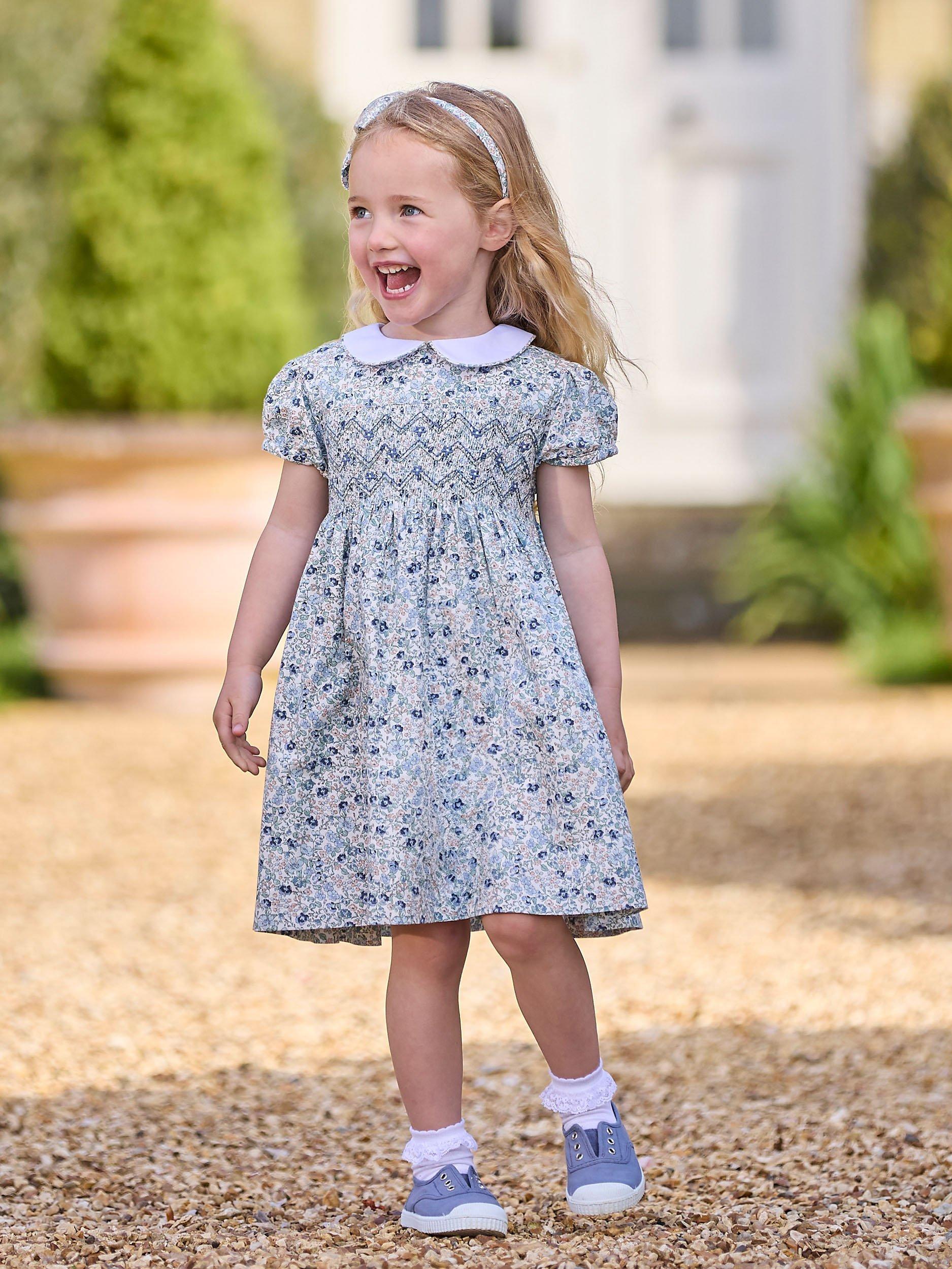 A Trotters classic, this traditional smocked dress comes in pretty floral bloom print and features a contrasting white Peter Pan collar with matching floral piping trim. Made from 100% cotton, it comes fully lined and features a matching tie at the back for the perfect finish.