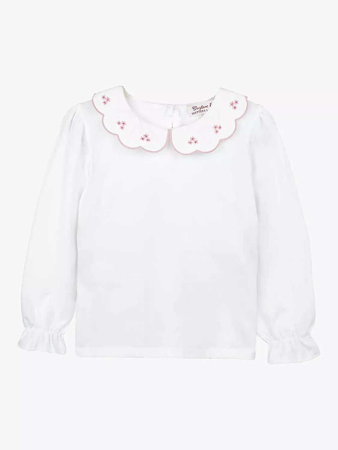 The classic jersey blouse has been given a pretty twist this season with the addition of a pretty embroidery along the collar with scalloped edges. This simple and elegant jersey top features a full length button fastening down the back and elasticated cuffs. It's perfect for layering under your favourite knitwear for a smart finish.