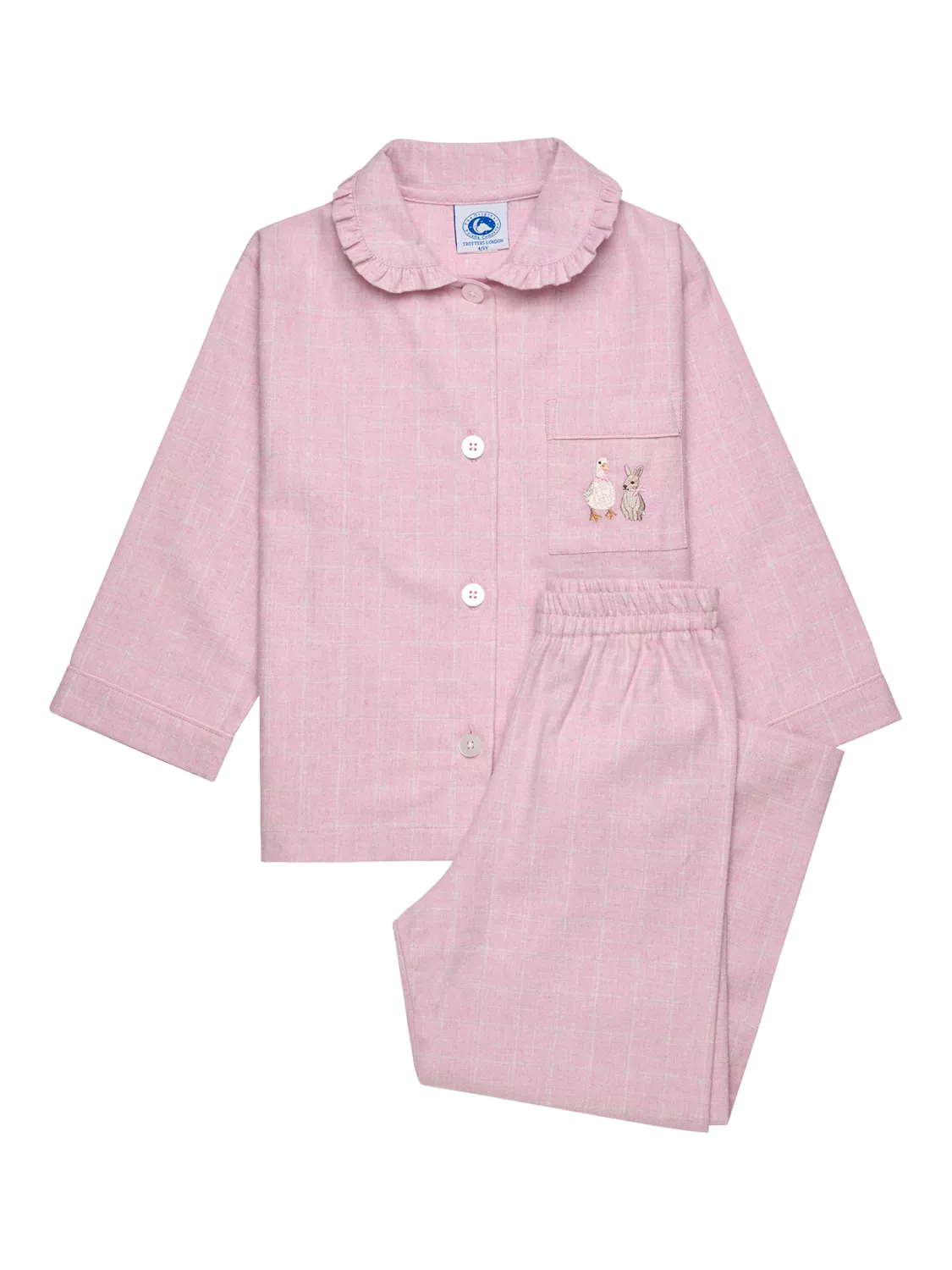 Made in a subtle pink check print fabric, these classic cotton pyjamas feature a pretty ruffled collar and pearlised button down front, while the front patch pocket showcases our sweet duck and bunny embroidered motif. The trousers have a fully elasticated waist and are just the thing for sweet dreams and a comfortable night's sleep.