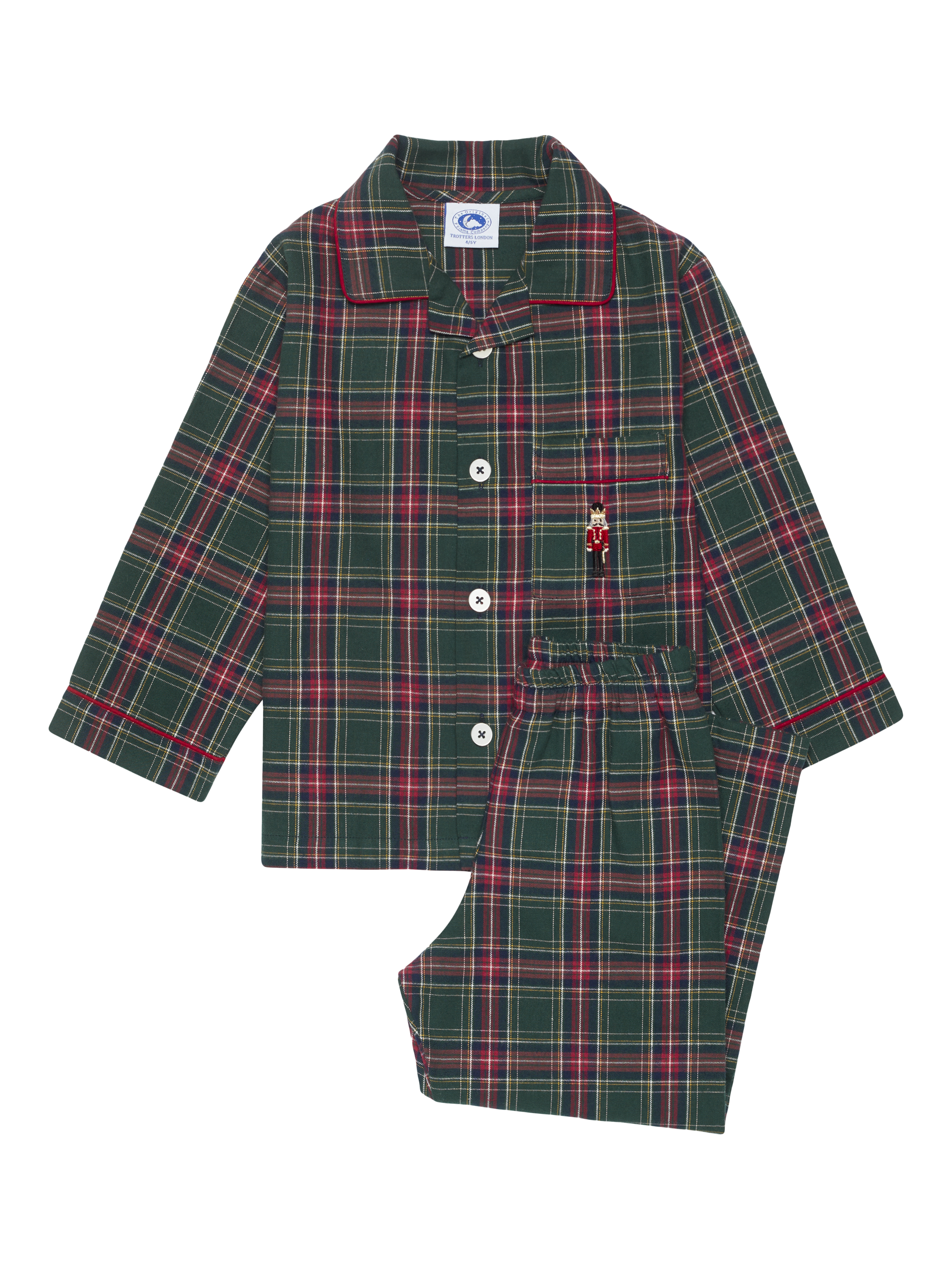 These pyjamas are crafted from super-soft brushed cotton in a festive tartan check. The bottoms have an elasticated waist for a comfortable fit and the matching shirt top has a full button-down front, with a pocket on the chest and a festive Nutcracker soldier embroidered on the front pocket.