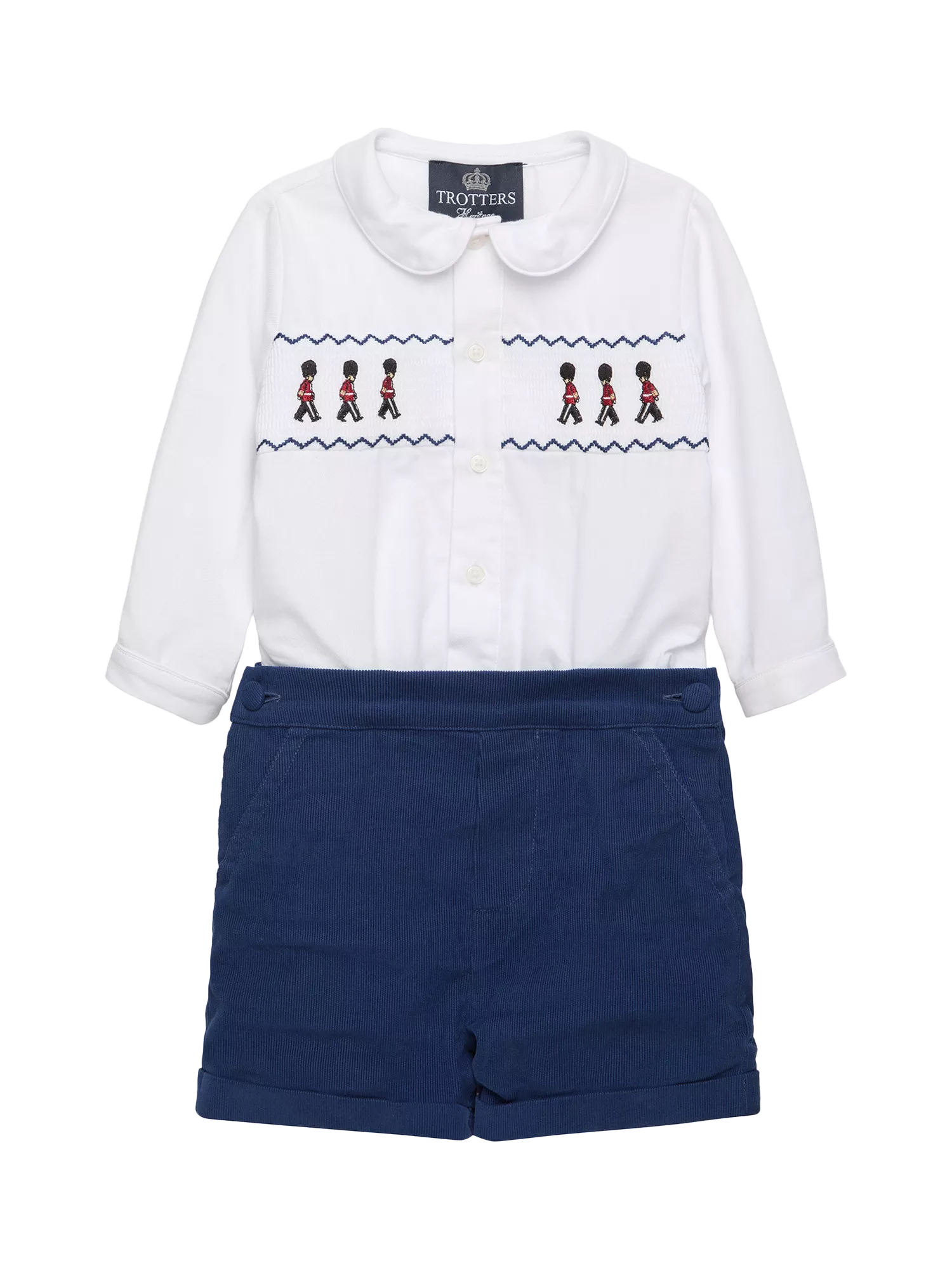 Trotters' best-selling Rupert set has been updated for autumn/winter, and now comes with a smart white cotton long-sleeved shirt, complete smocked panel across the front featuring the brand's marching guardsman embroidery. Neatly fastens via concealed buttons to a classic pair of soft, fine needlecord shorts this makes a great, all-in-one outfit for babies and young boys that will keep little tummies under wraps during those smarter occasions.