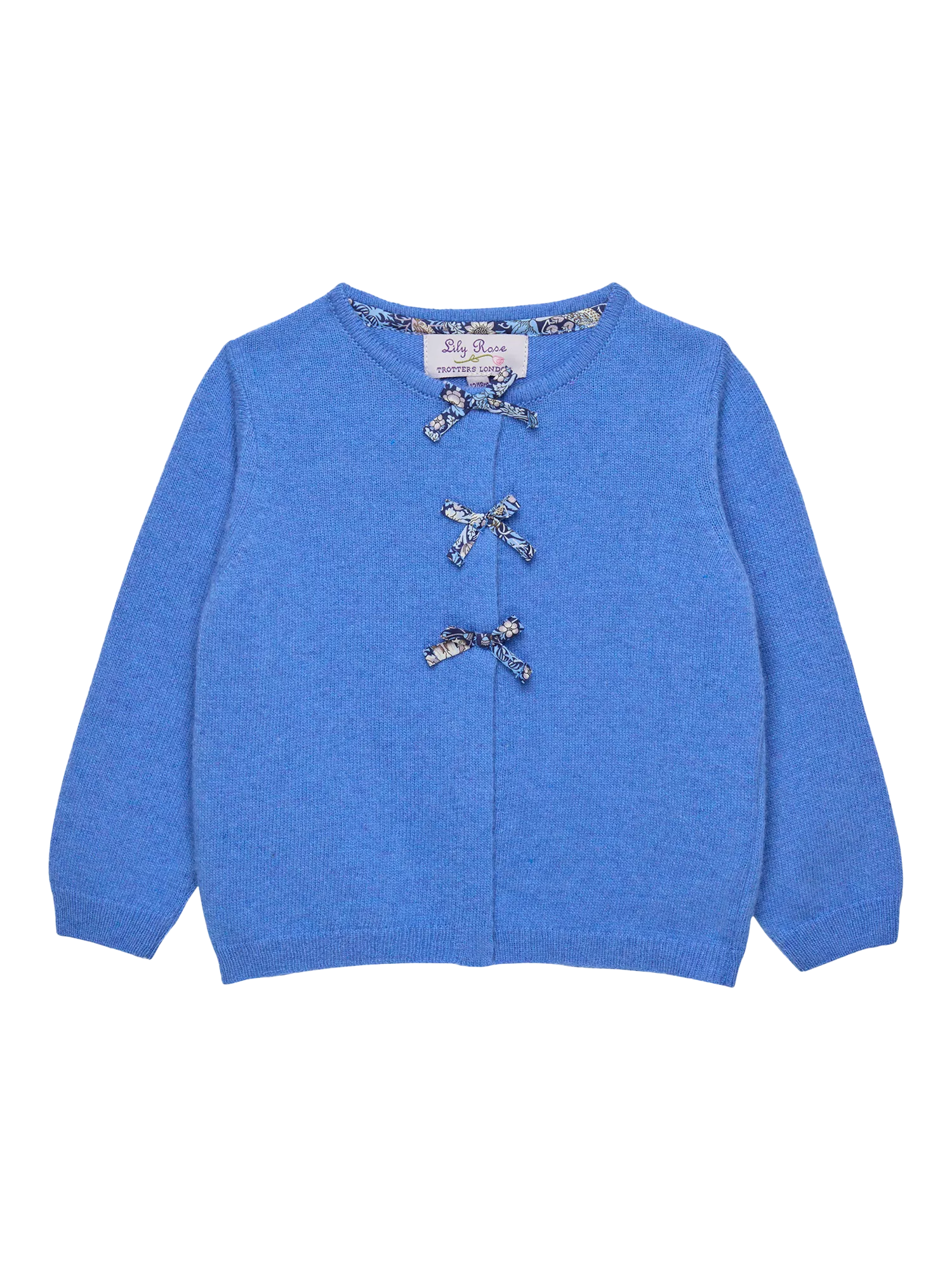 This blue knitted cardigan will add a burst of colour to their autumn/winter wardrobe. For a bit of extra 'wow-factor' it features a large statement bow made in Liberty's Strawberry Thief fabric, originally designed by William Morris in 1883. Perfect for layering over our coordinating pieces for a show stopping outfit.
