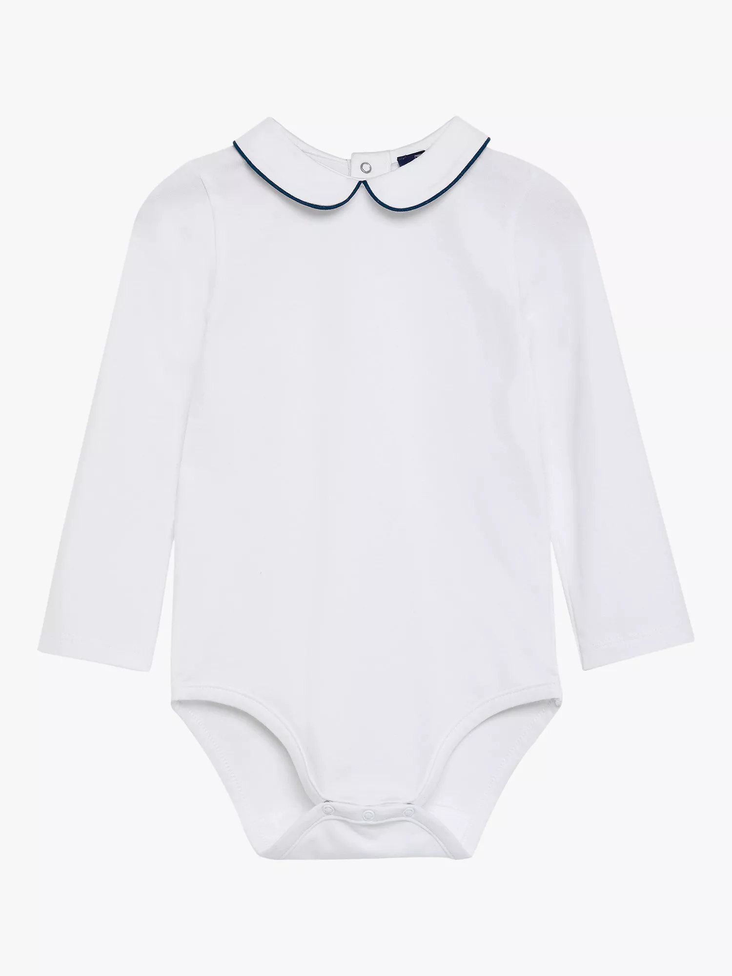 Made from soft jersey, this Milo bodysuit by Thomas Brown has a classic Peter Pan collar trimmed with piping detail. They fasten with poppers at the centre back and along the leg seams for easy dressing and changing.