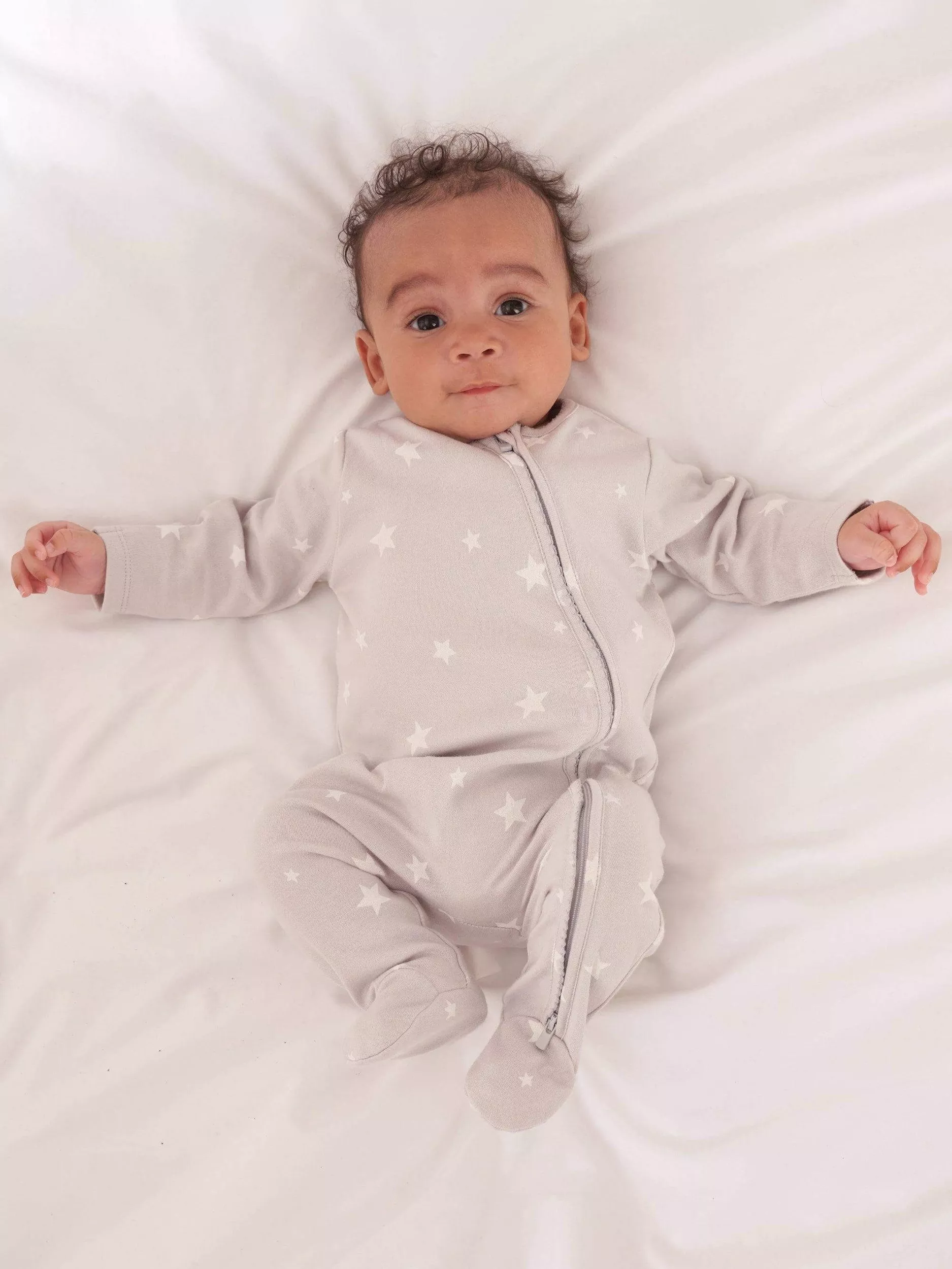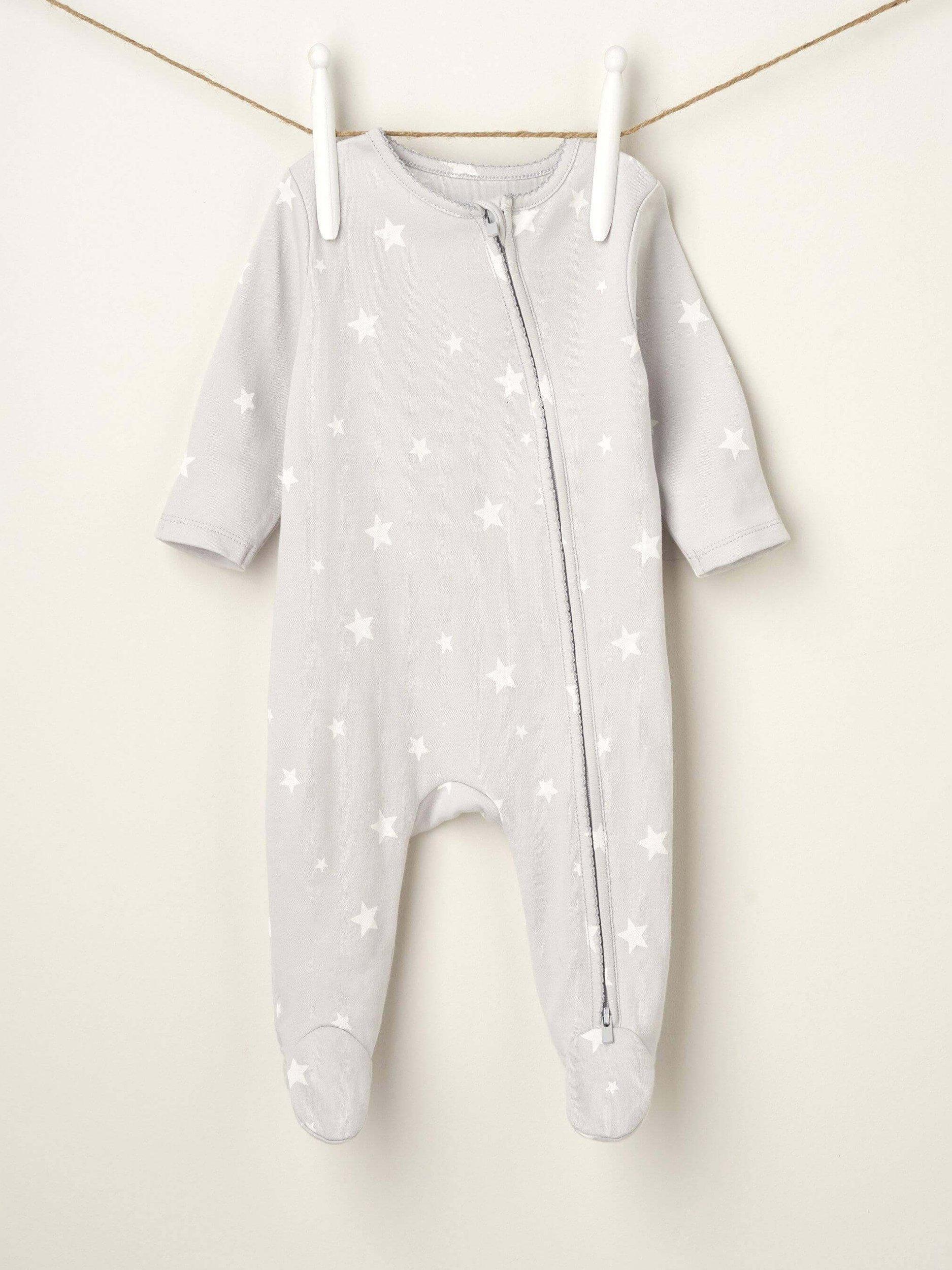 Made from sublimely soft cotton with in-built feet and in a collarless design. The handy two-way zip makes even the most catastrophic nappies easy to change. Fill their very first wardrobe with these sleepsuits, comfortable to wear all day and stays soft wash after wash. Part of the star baby range, the star print baby grow is designed to inspire the sweetest of dreams.