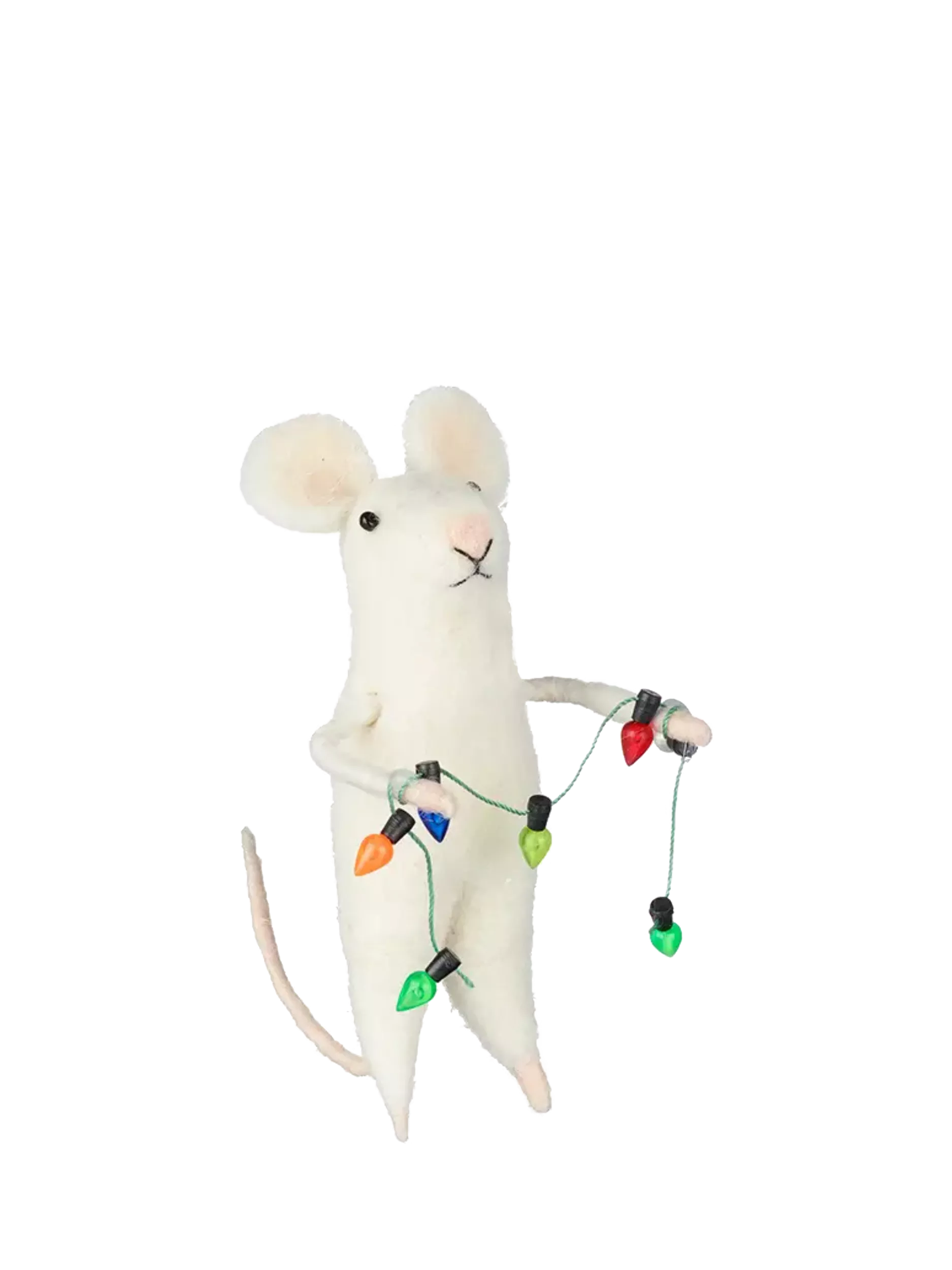 Crafted from natural cotton, wool and faux fur, this sweet little mouse is ready to help decorate the home for festive season, complete with a string of lights in hand.