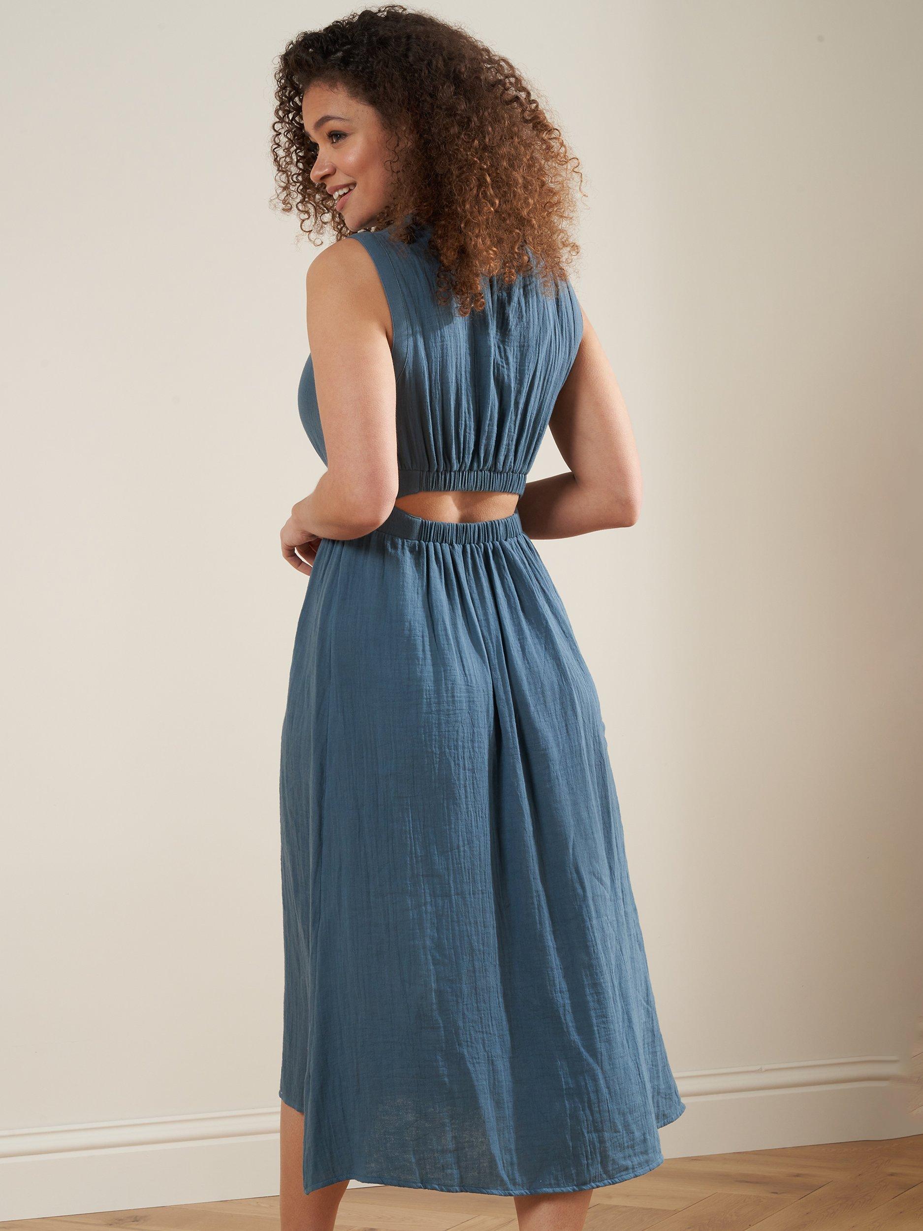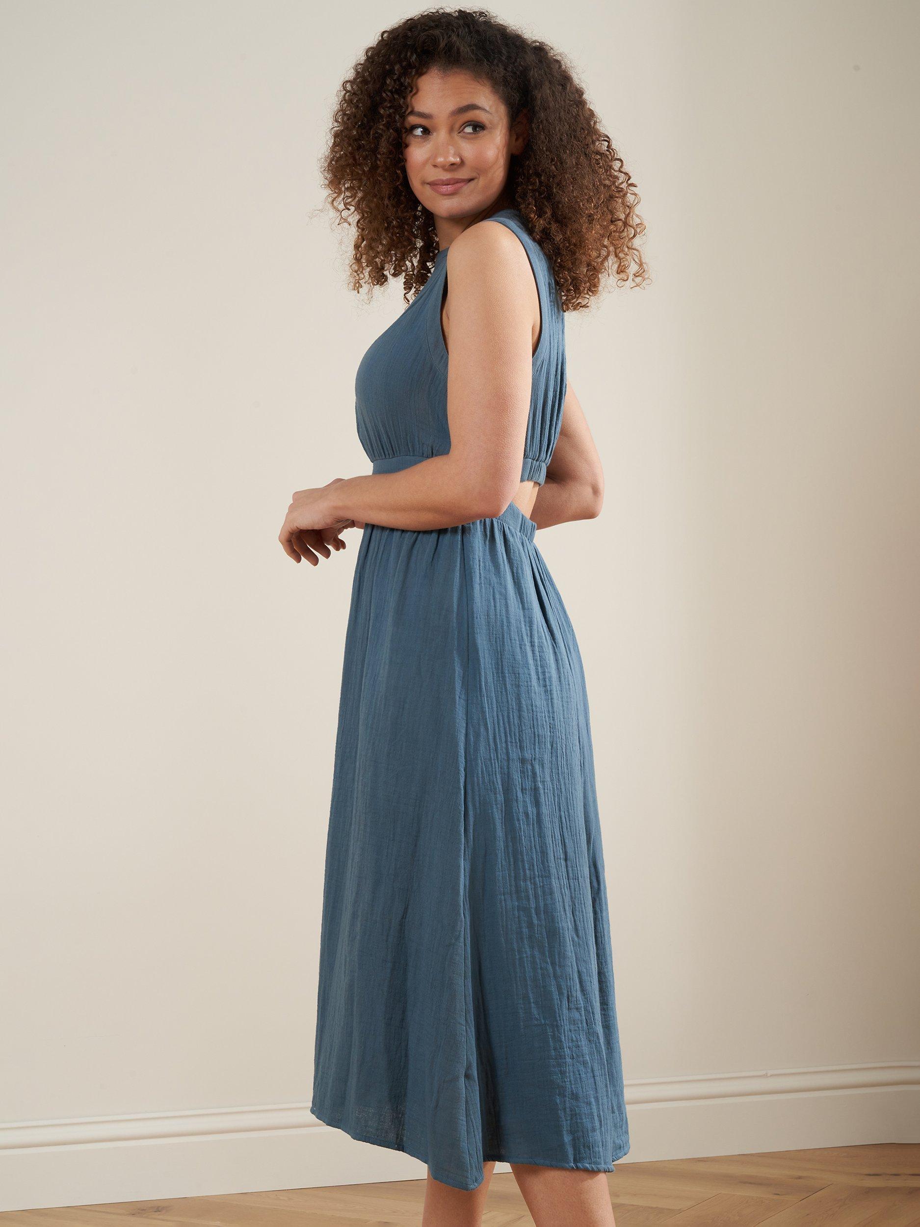 A tried-and-tested classic, this mid-length dress from Truly is crafted in lightweight, breathable cotton. Topped with a round neck, this sleeveless style transforms a simple design into a stand out.