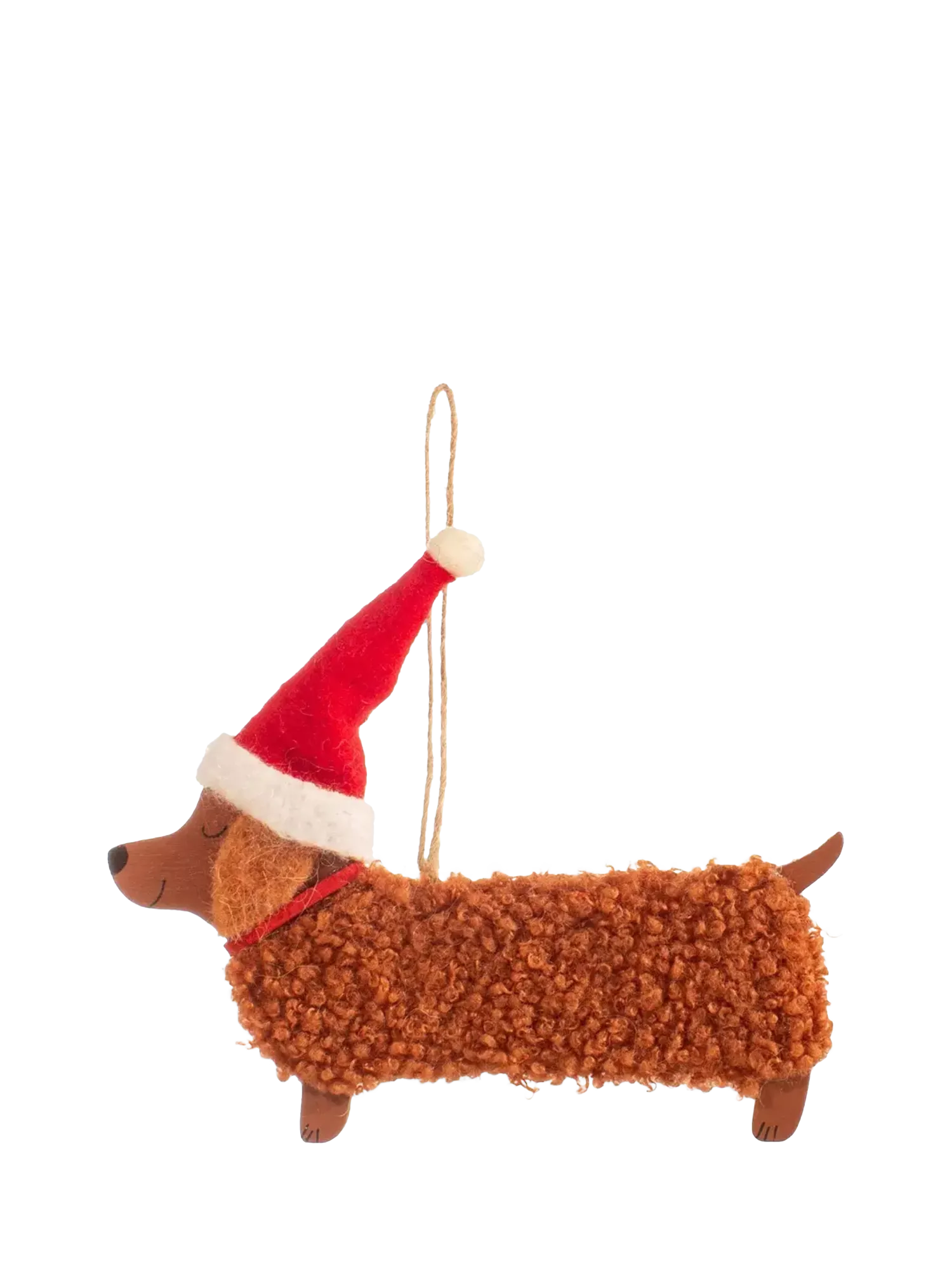 This delightful felt sausage dog decoration is dressed and ready for Christmas in a cheerful red Santa hat. Crafted from natural cotton, wool and faux fur, this charming dachshund features a wonderfully textured boucle-style coat that you'll want to reach out and touch.
