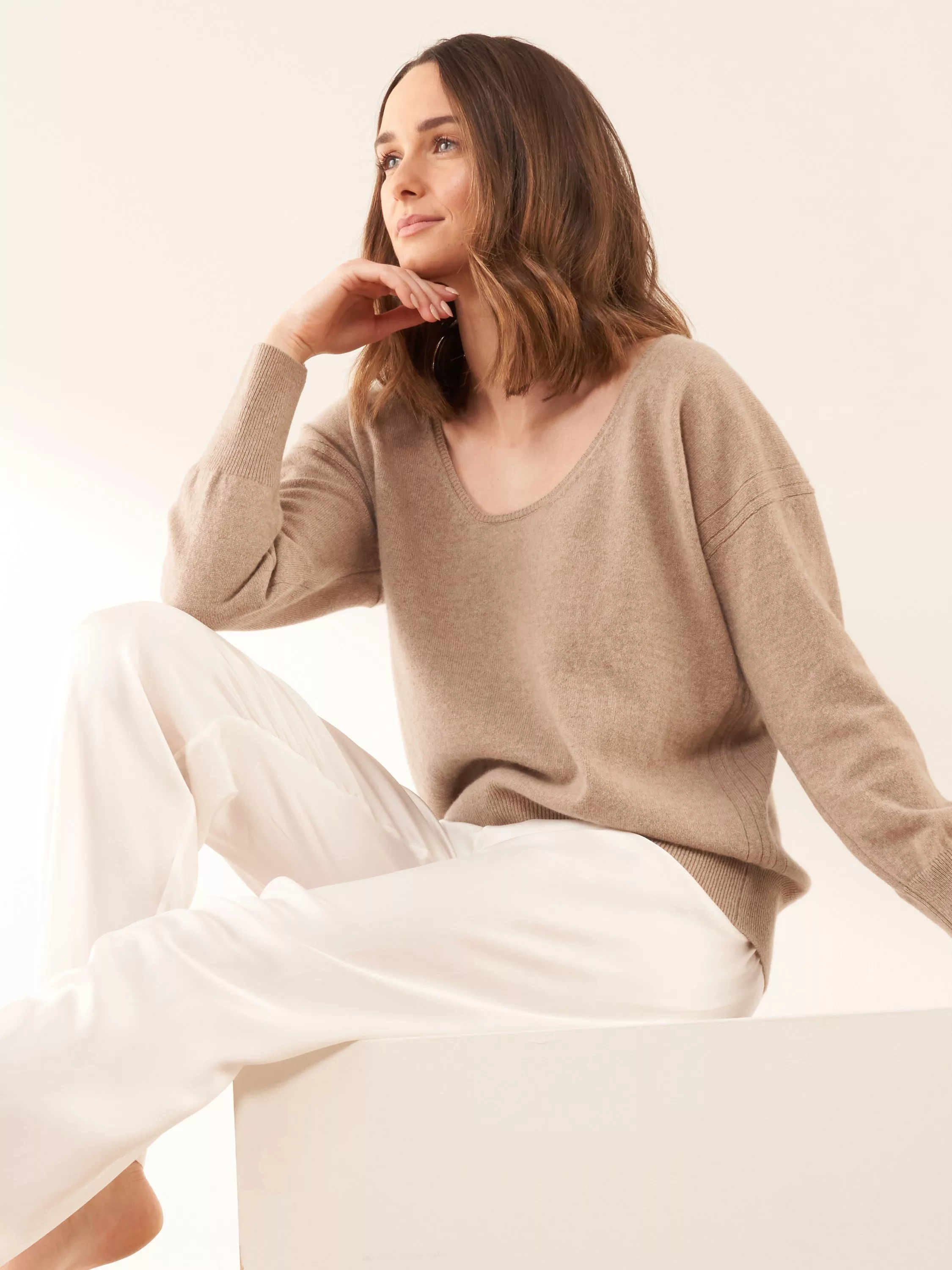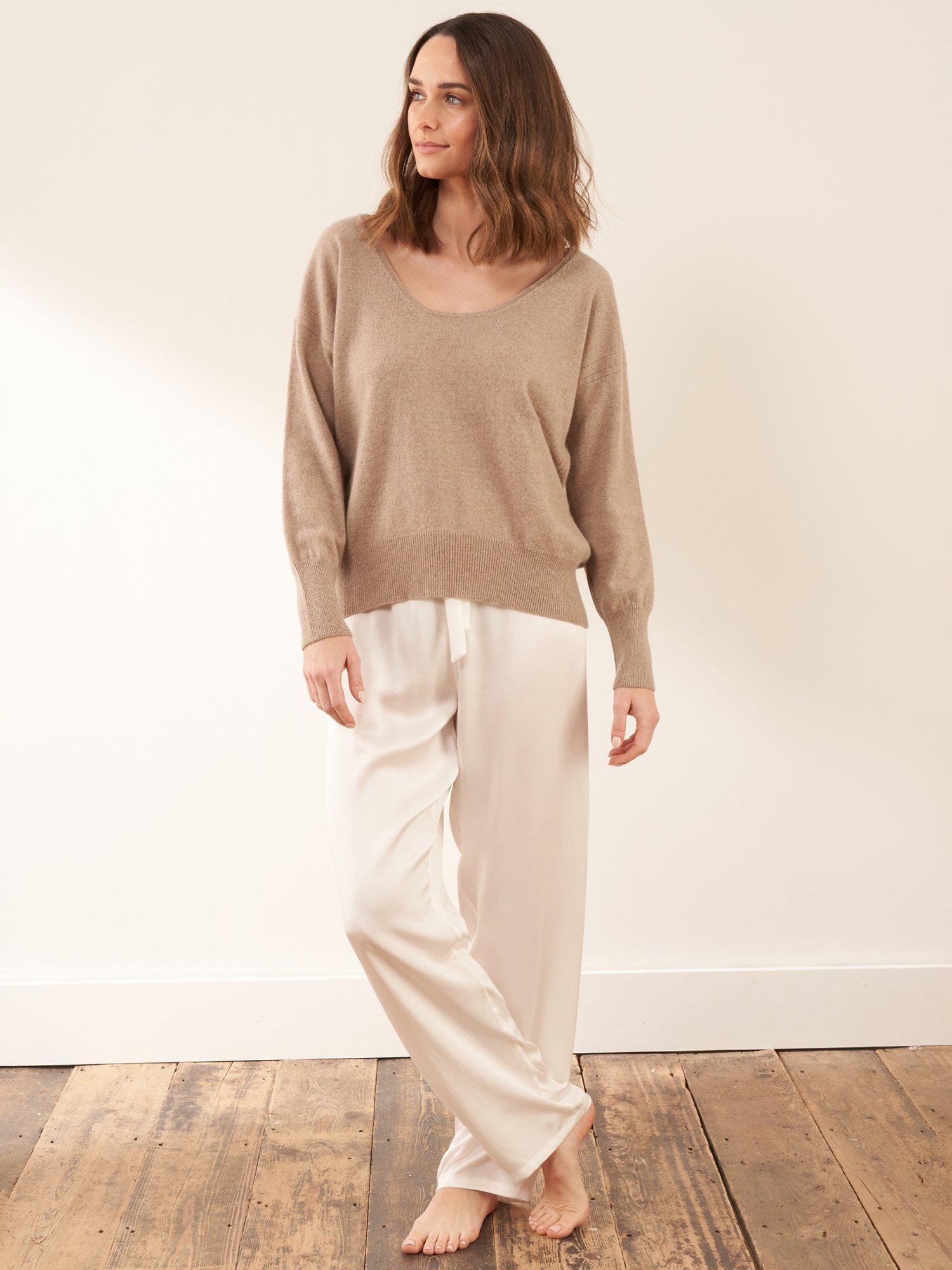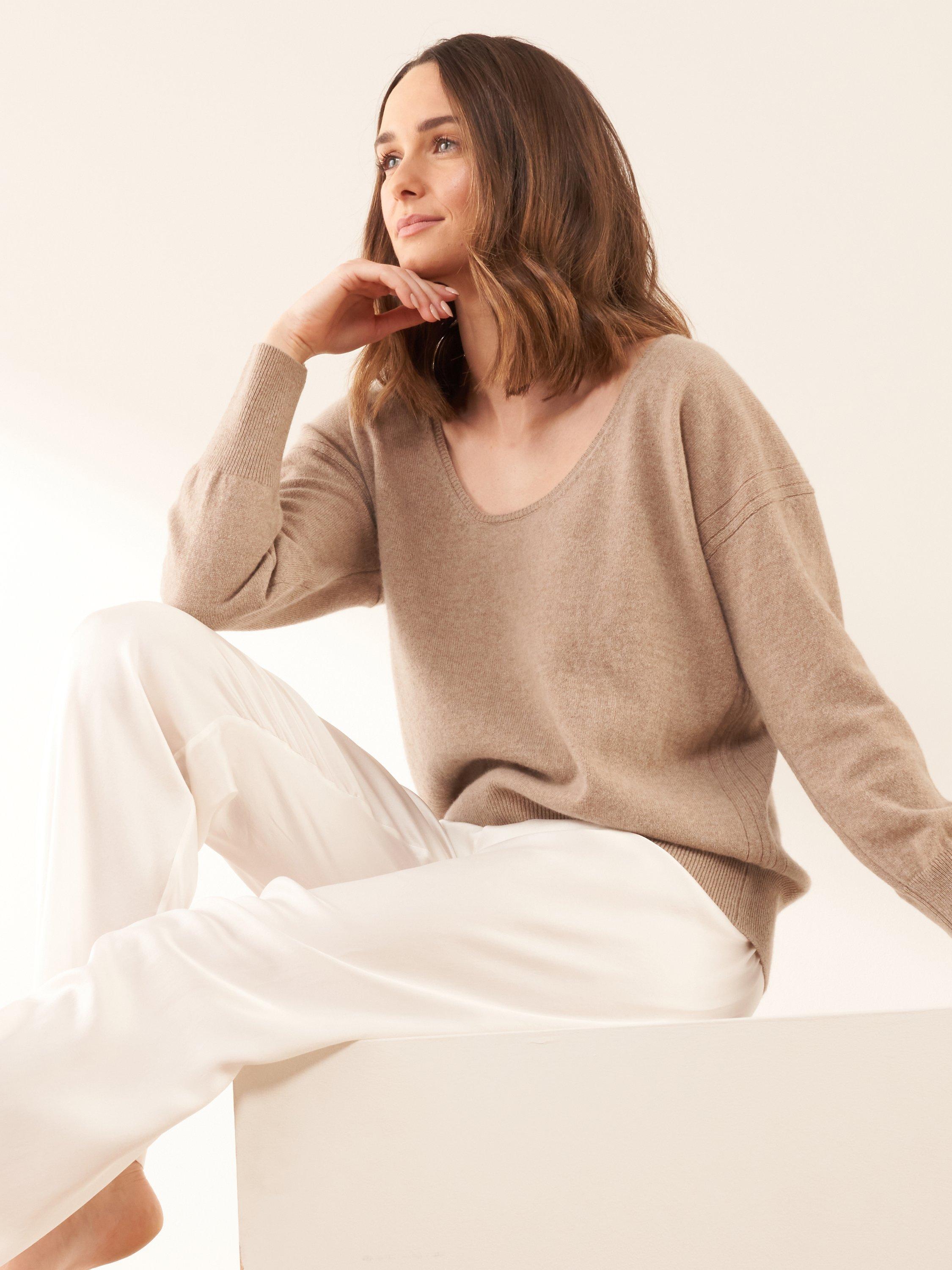 Knitted from 100% recycled cashmere, this super soft and warm Richmond boyfriend jumper is not something that should be missing from your wardrobe! Featuring a delicate neck trim and centre back cable knit detail, this jumper has been designed with ultimate comfort and style in mind for any occasion. Our neutral nutmeg sweater looks great when paired with joggers for cosy days or jeans and boots for a brisk winter walk.