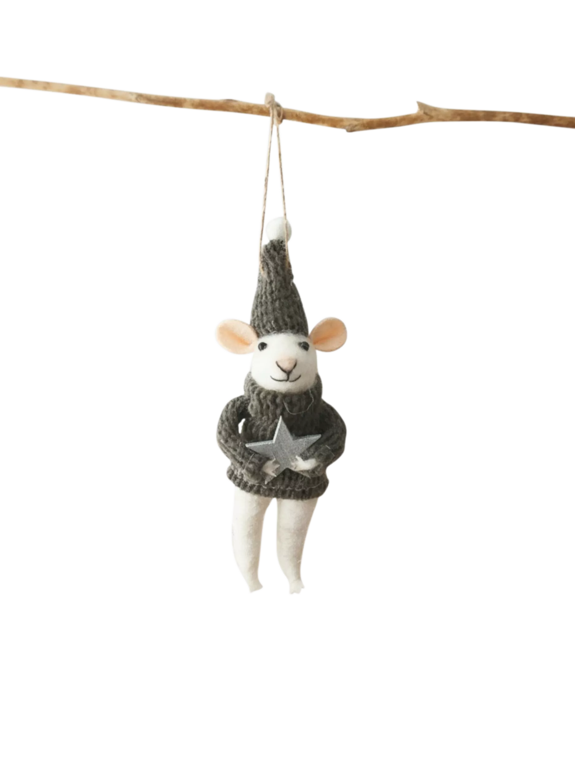 An elegant felt hanging ornament featuring a charming mouse dressed in a grey knitted jumper and hat, holding a silver glitzy star.
