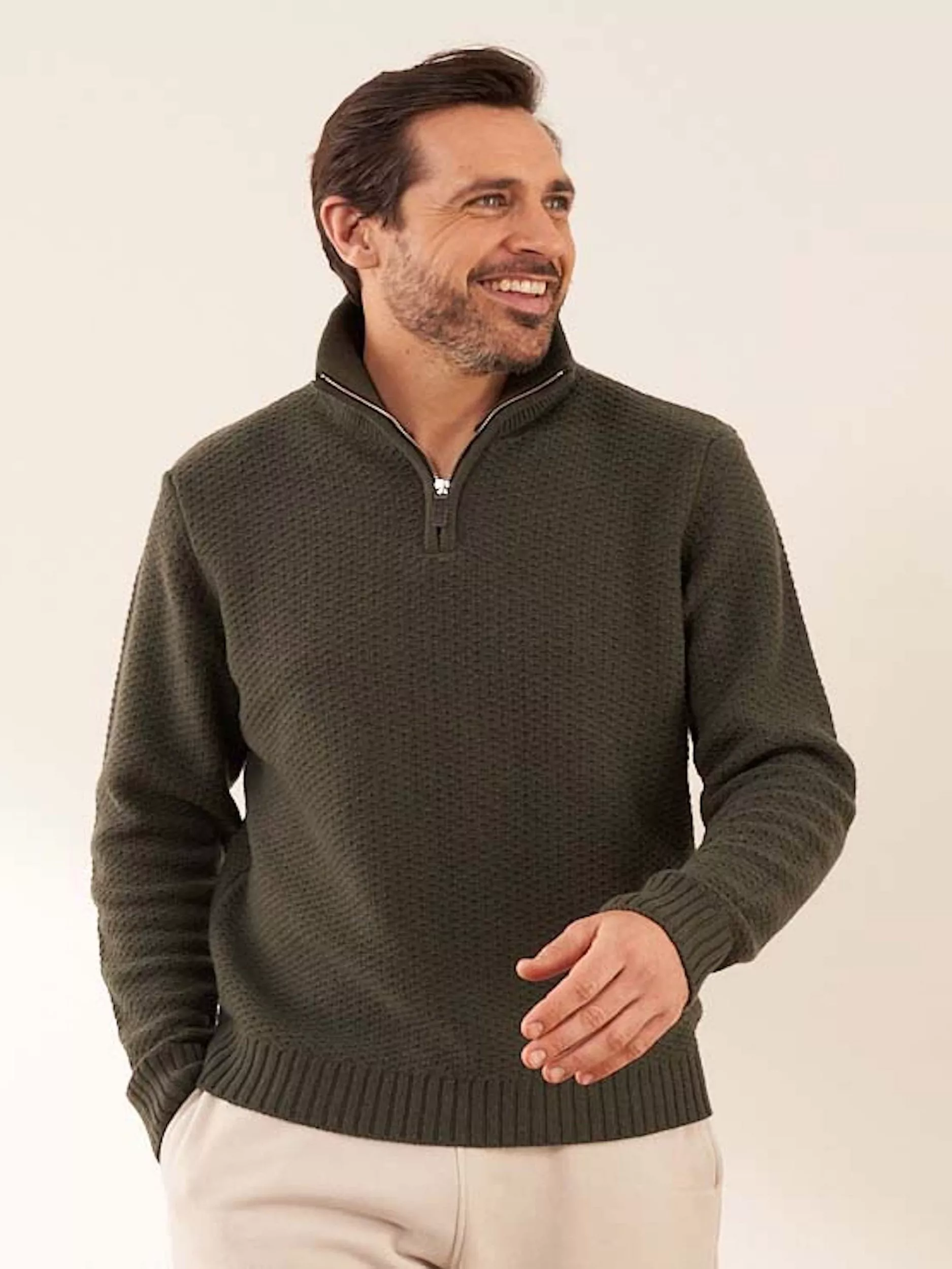 The Windsor Khaki 3/4 Zip Jumper, crafted from wool and cashmere, offers a luxuriously soft feel and lightweight wear. This sophisticated, versatile style is one you'll come back to time and time again.