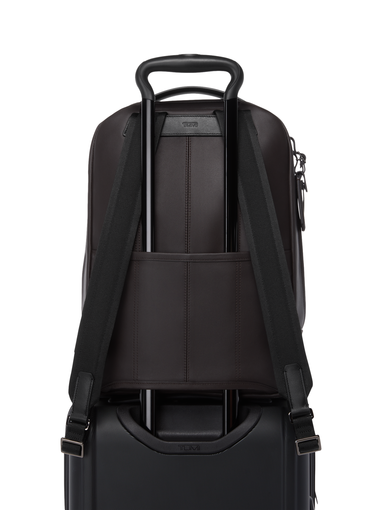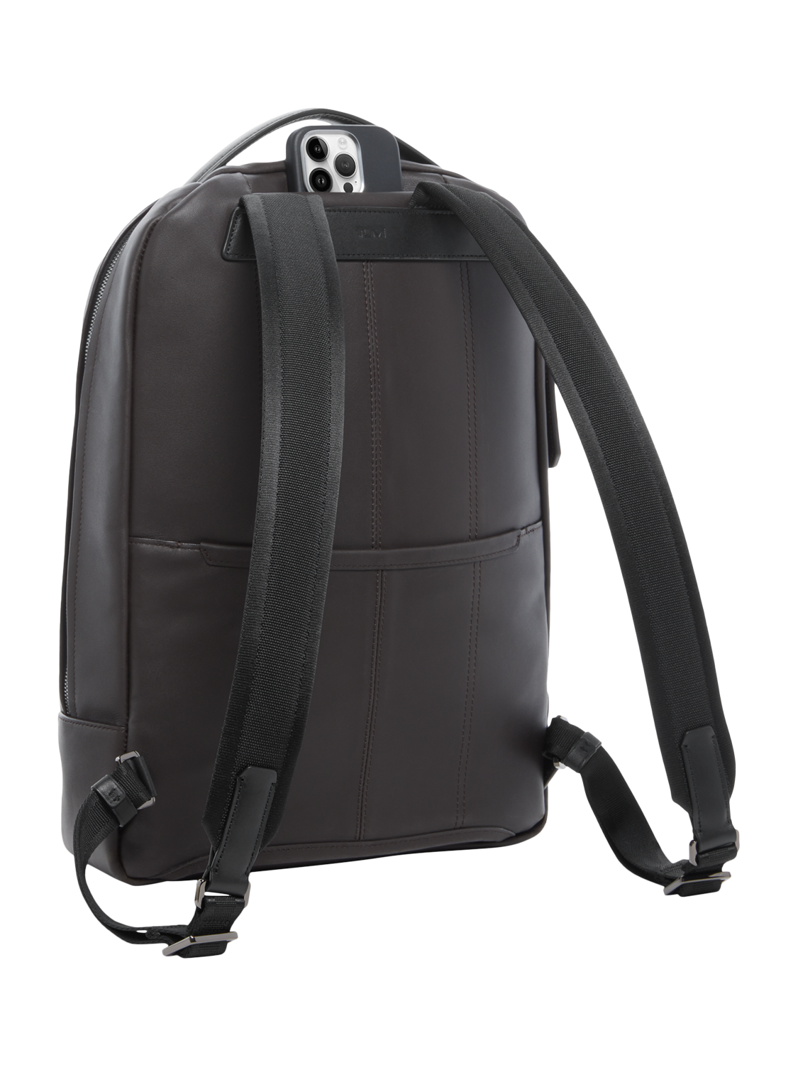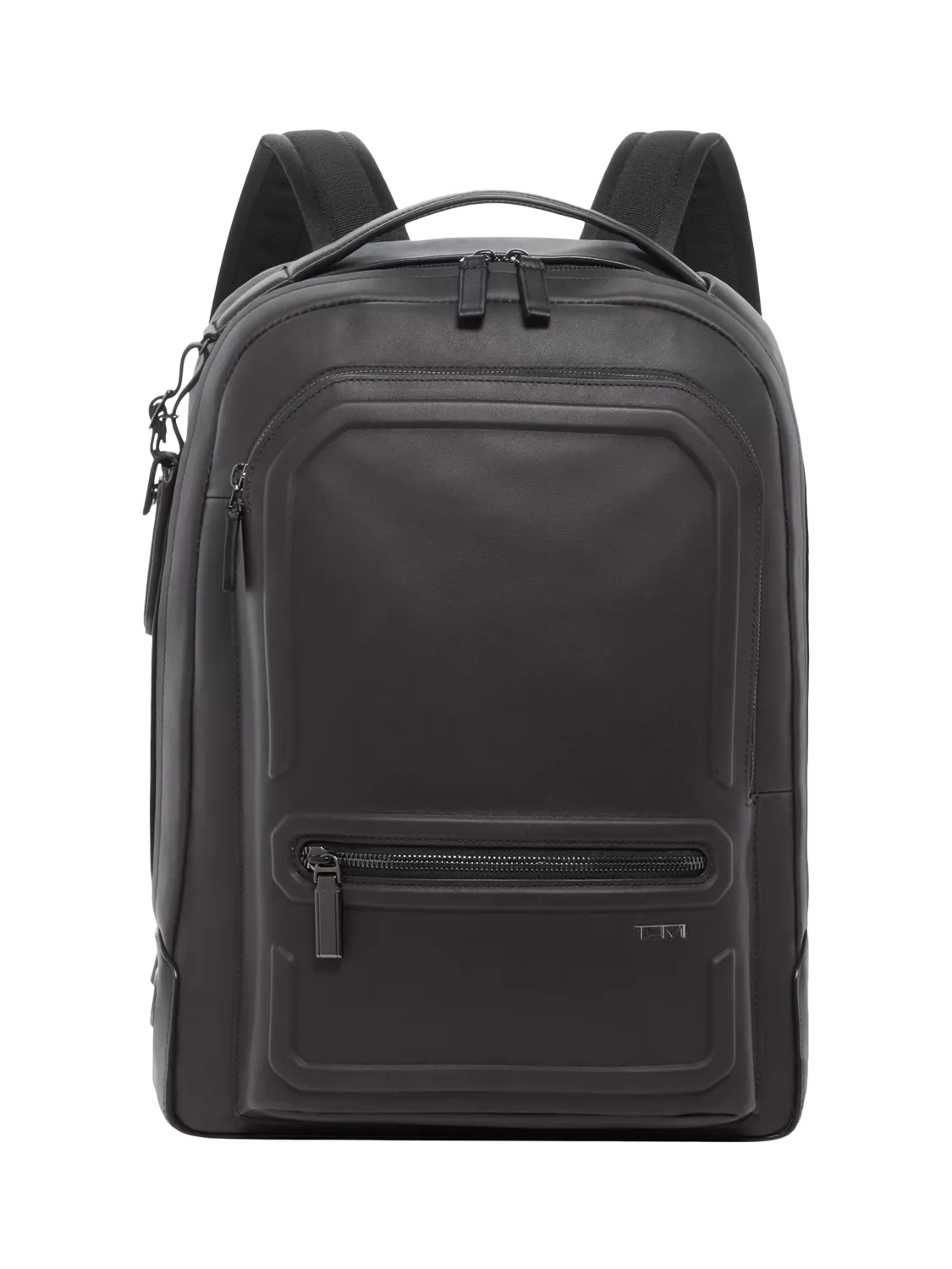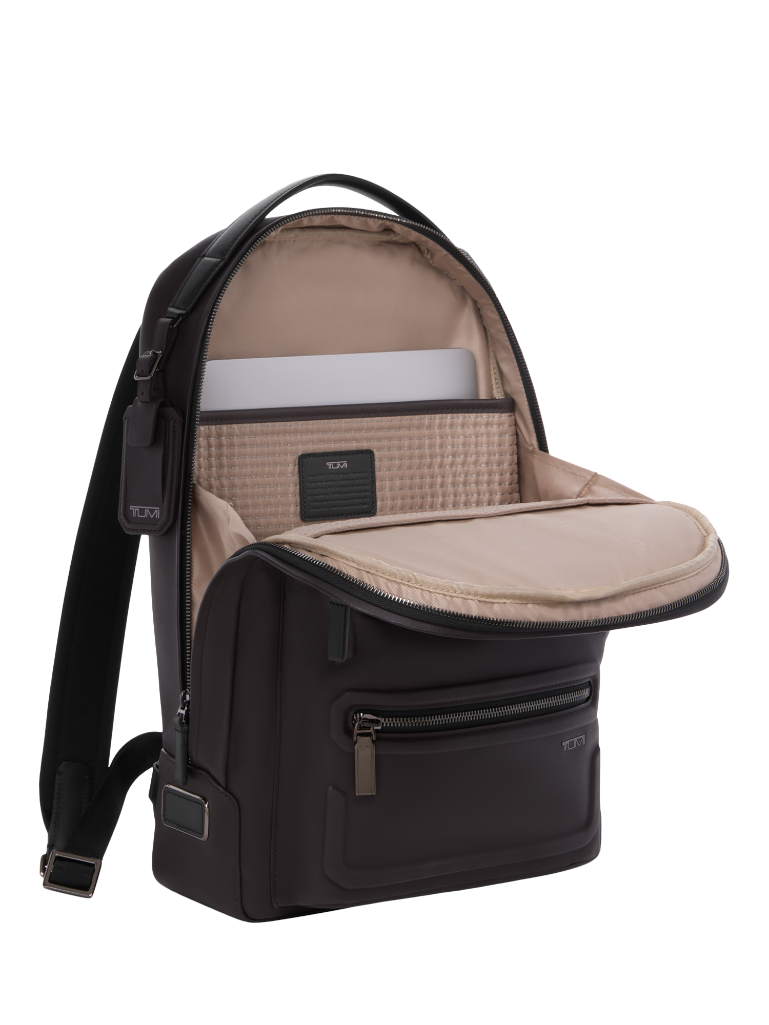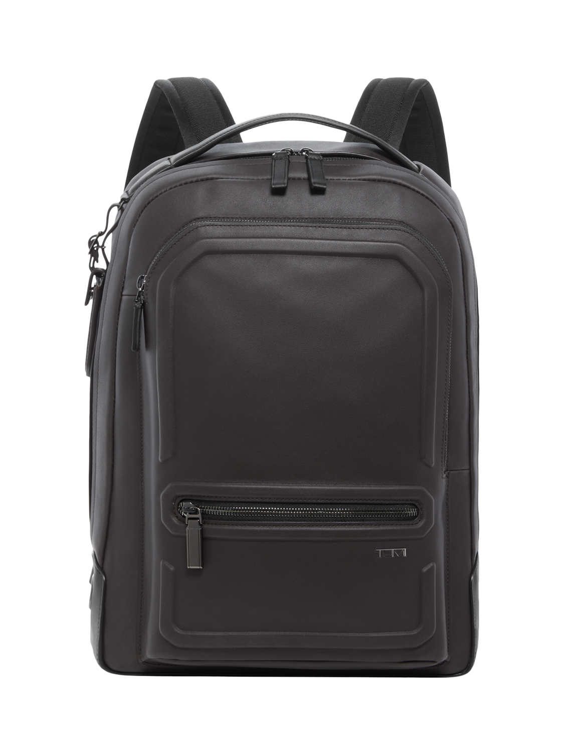 This refined backpack is suitable for work or the weekends. Toting an array of pockets inside and out, it has space for your laptop, documents, phone and more. Embossed leather accents frame the sleek silhouette.