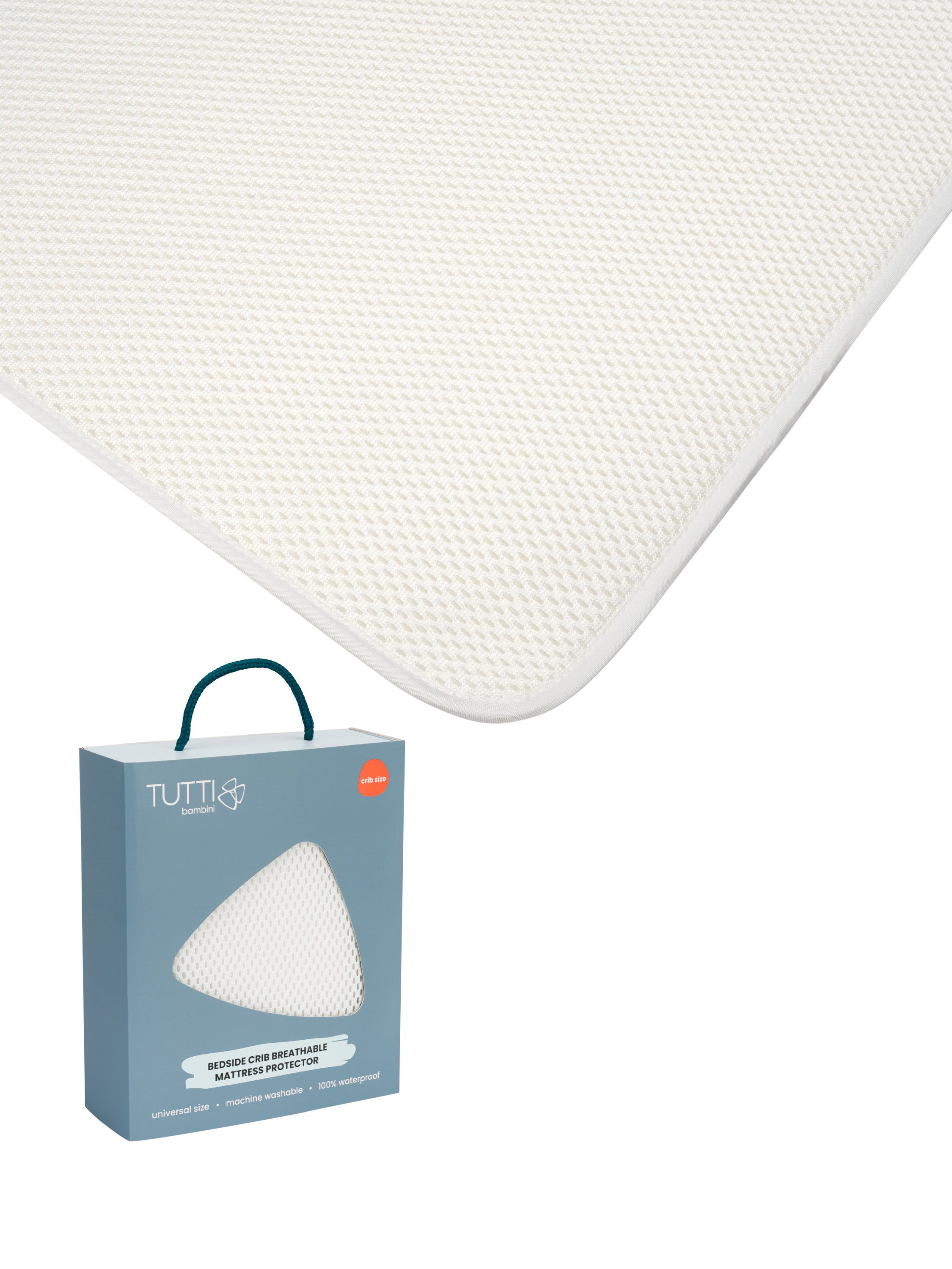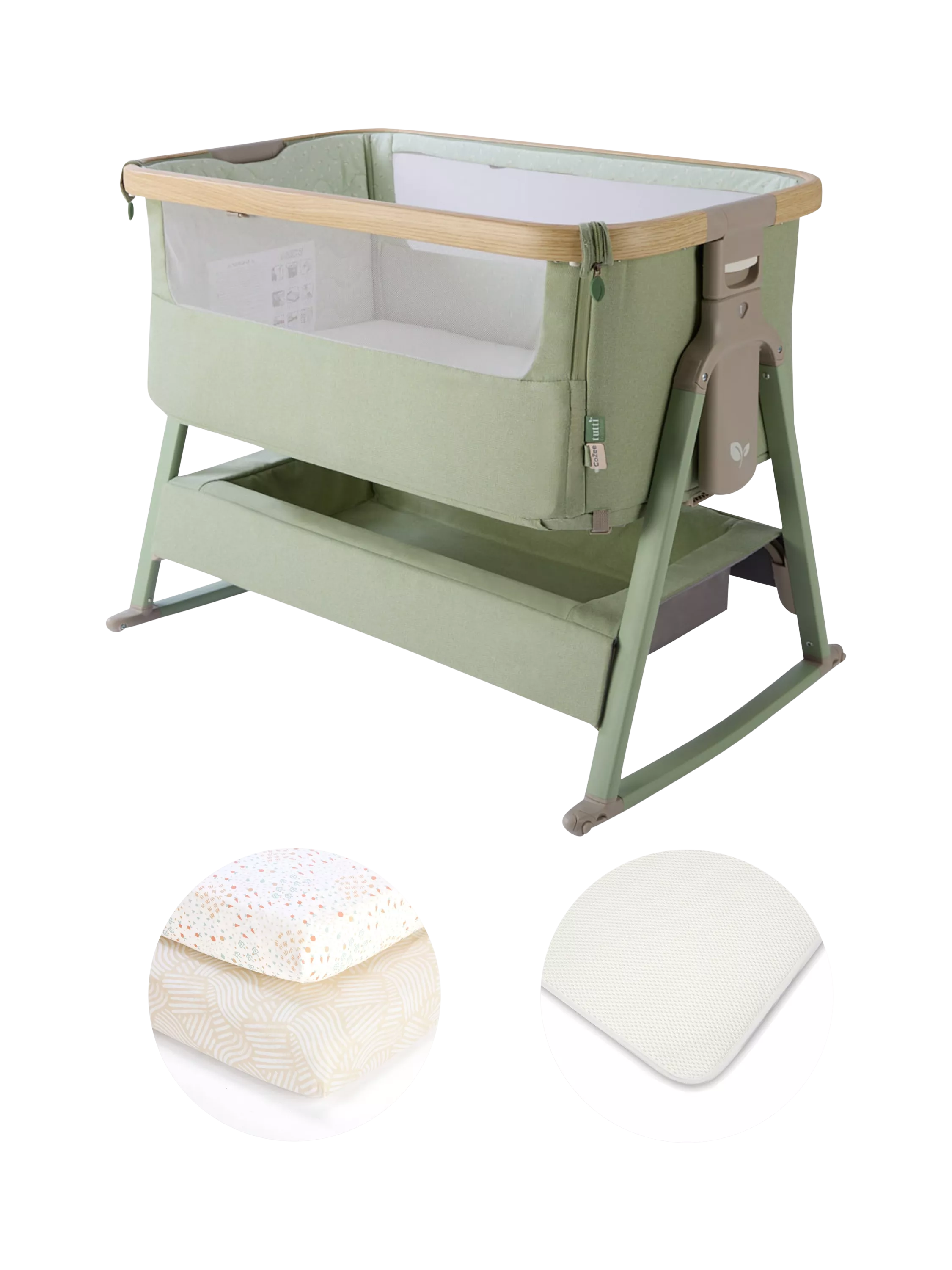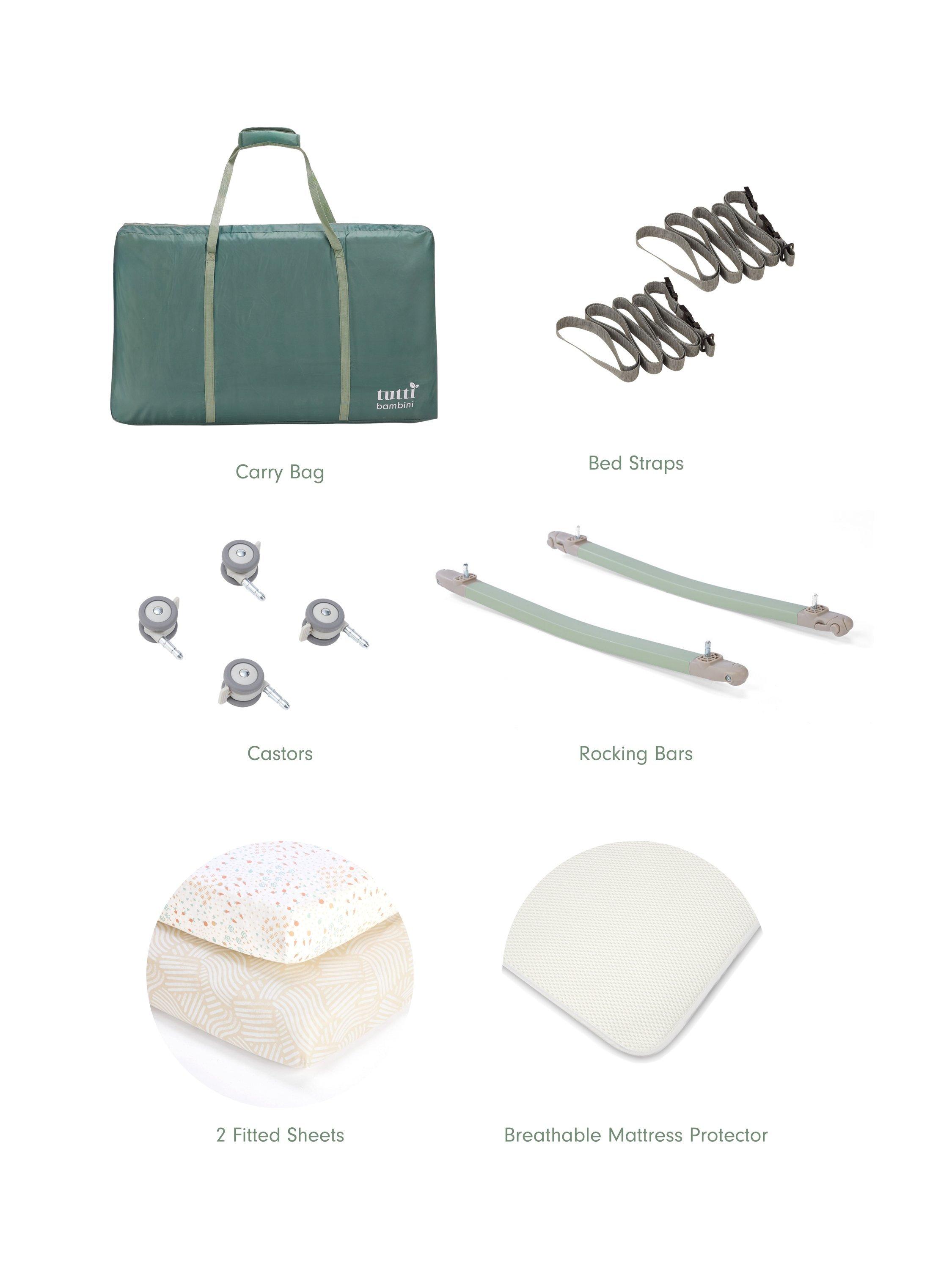 This starter bundle includes the CoZee Air2 bedside crib, a set of 2 fitted sheets, a breathable mattress protector, carry bag, mattress, rocking bars and castors.