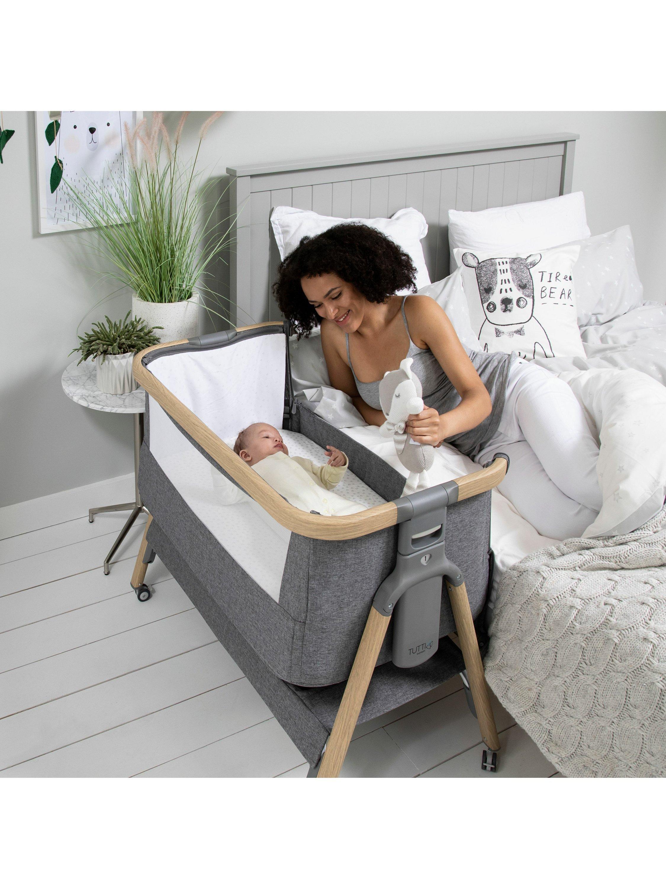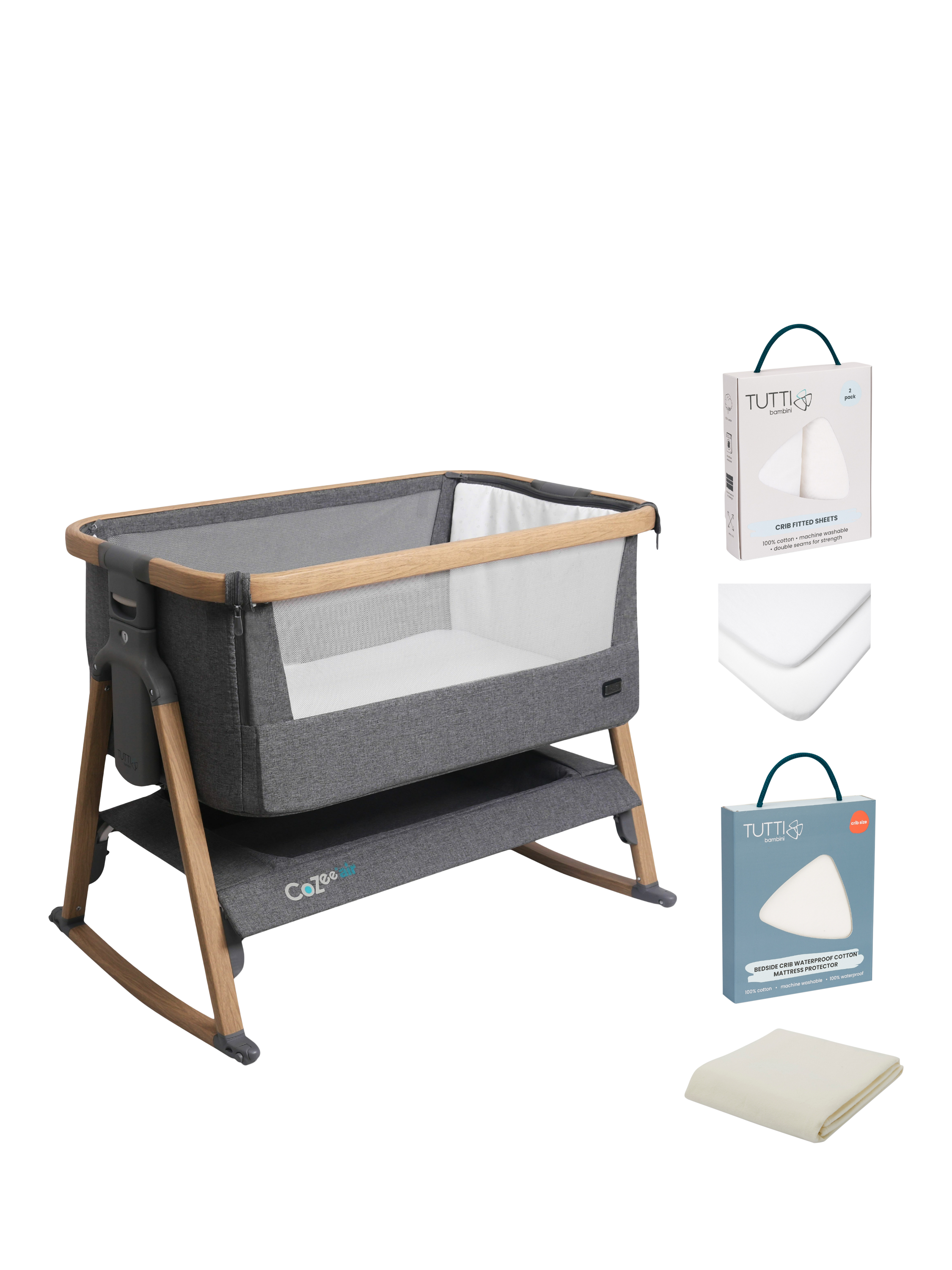 All the benefits of the Tutti Bambini CoZee Air bedside crib but in one essential starter bundle. This set includes the CoZee bedside crib, mattress, travel bag, breathable mattress protector and two fitted sheets.