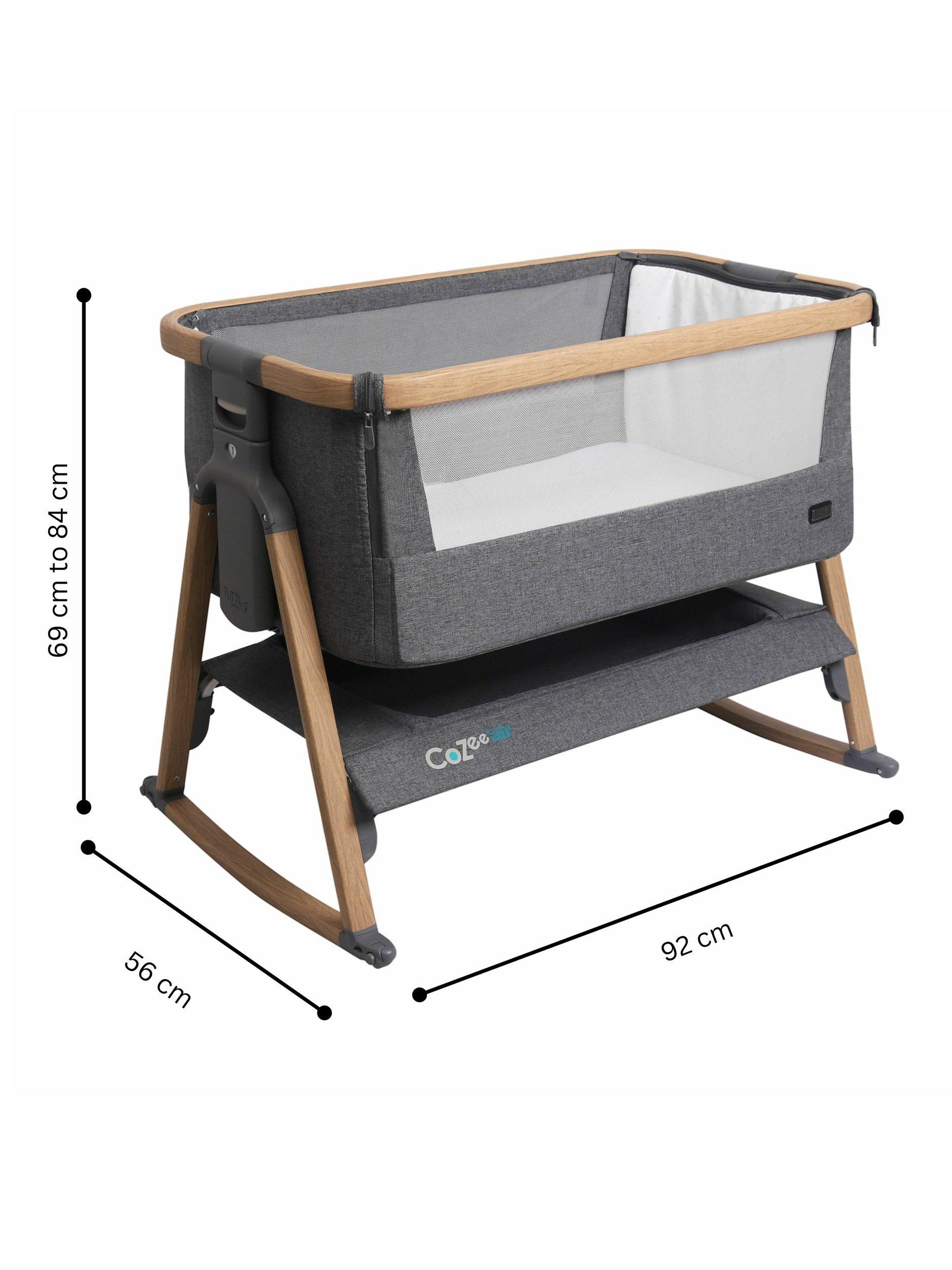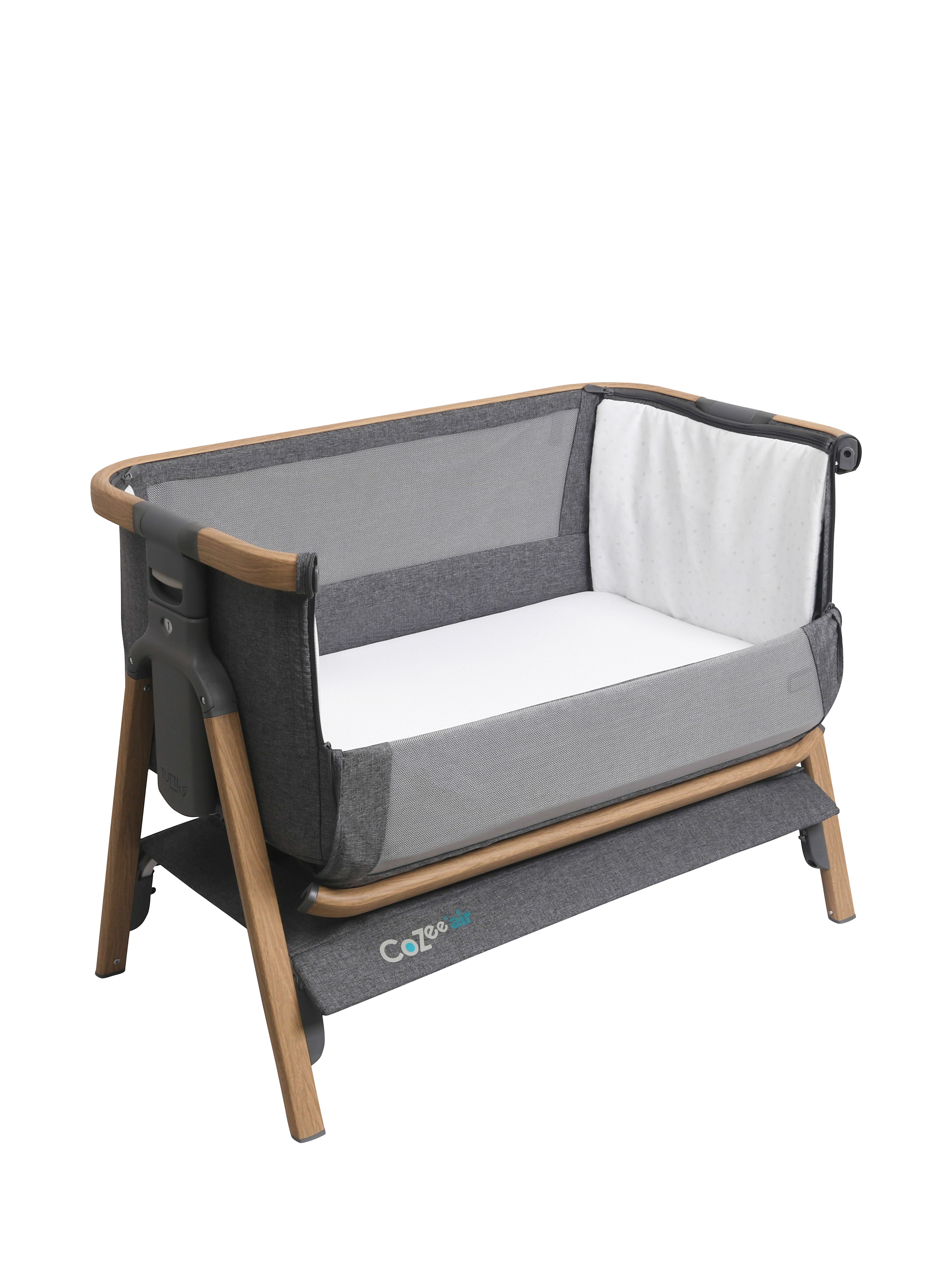 The CoZee Air bedside crib offers the functionality you need to sleep safely, side-by-side with your baby from birth until approximately six months. You can easily adjust the height with 6 different height positions and can even position one side higher than the other to help relieve the symptoms of reflux and congestion. The practical storage shelf gives you a handy place to stow essentials, right there, where you need them. When not using in bedside mode you can easily lock the drop-side into place and fasten the zips to create a standalone crib.