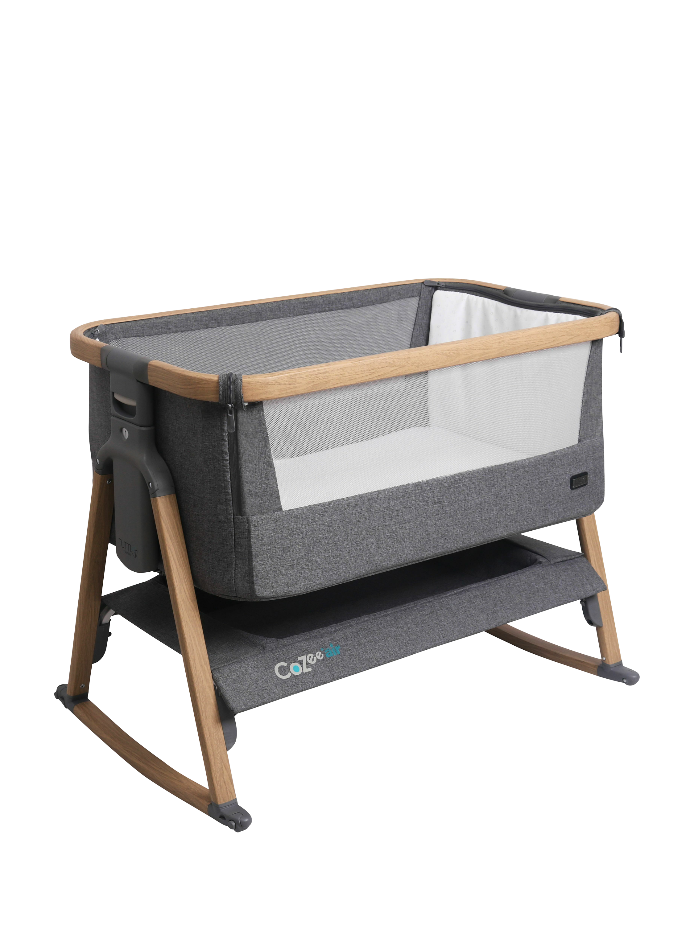 The CoZee Air bedside crib offers the functionality you need to sleep safely, side-by-side with your baby from birth until approximately six months. You can easily adjust the height with 6 different height positions and can even position one side higher than the other to help relieve the symptoms of reflux and congestion. The practical storage shelf gives you a handy place to stow essentials, right there, where you need them. When not using in bedside mode you can easily lock the drop-side into place and fasten the zips to create a standalone crib.