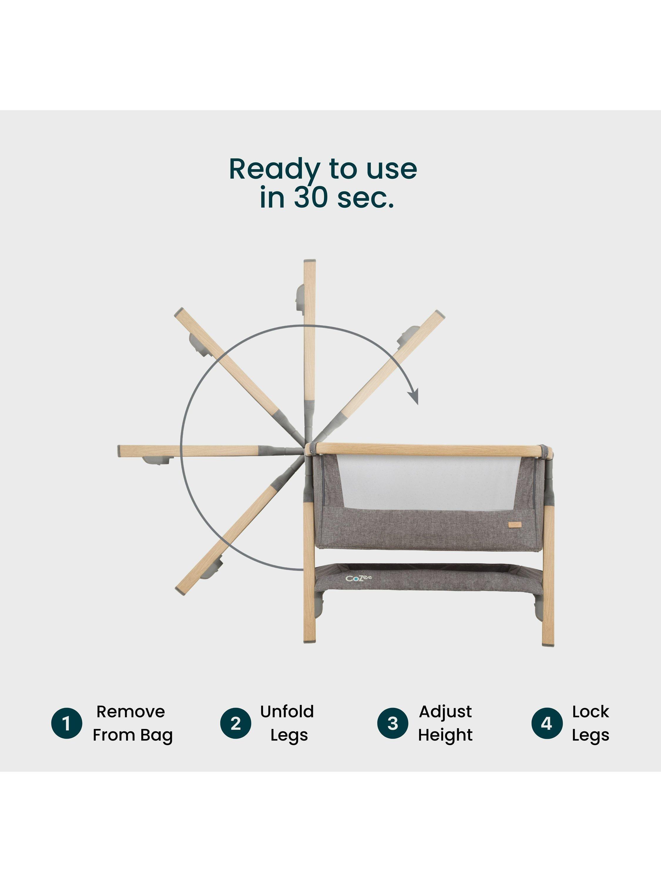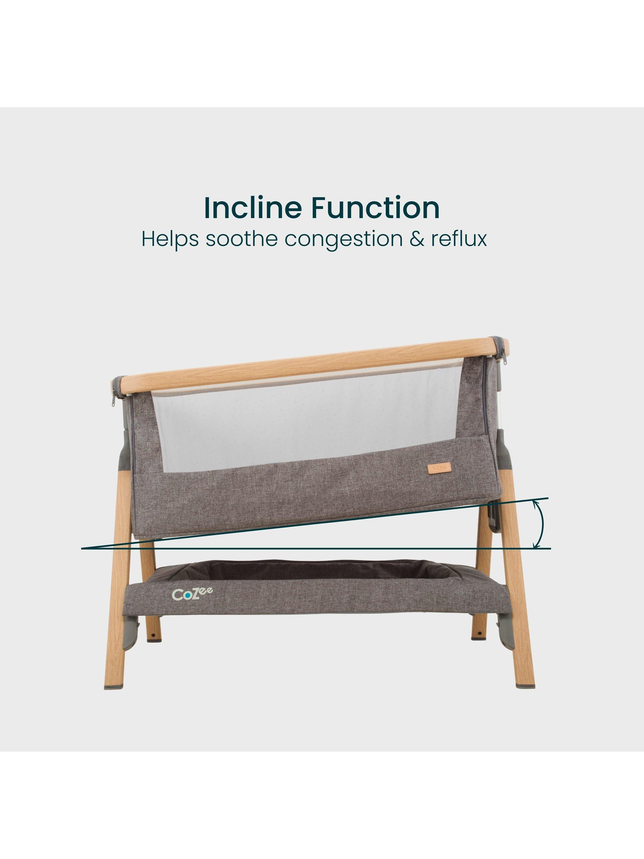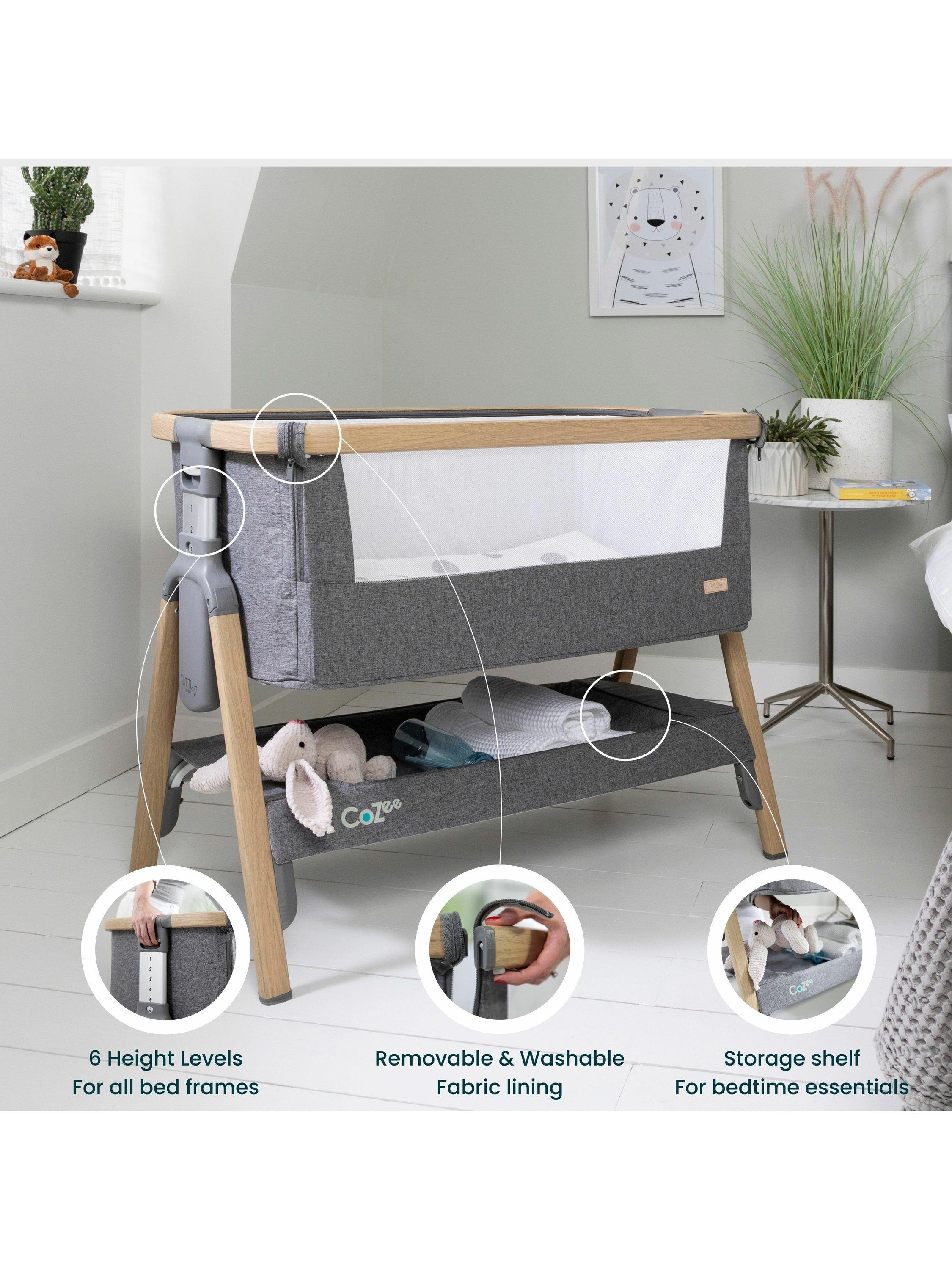 The CoZee bedside crib offers the functionality you need to sleep safely, side-by-side with your baby from birth until approximately six months. You can easily adjust the height with 6 different height positions and can even position one side higher than the other to help relieve the symptoms of reflux and congestion. The practical storage shelf gives you a handy place to stow essentials, right there, where you need them. When not using in bedside mode you can easily lock the drop-side into place and fasten the zips to create a standalone crib.