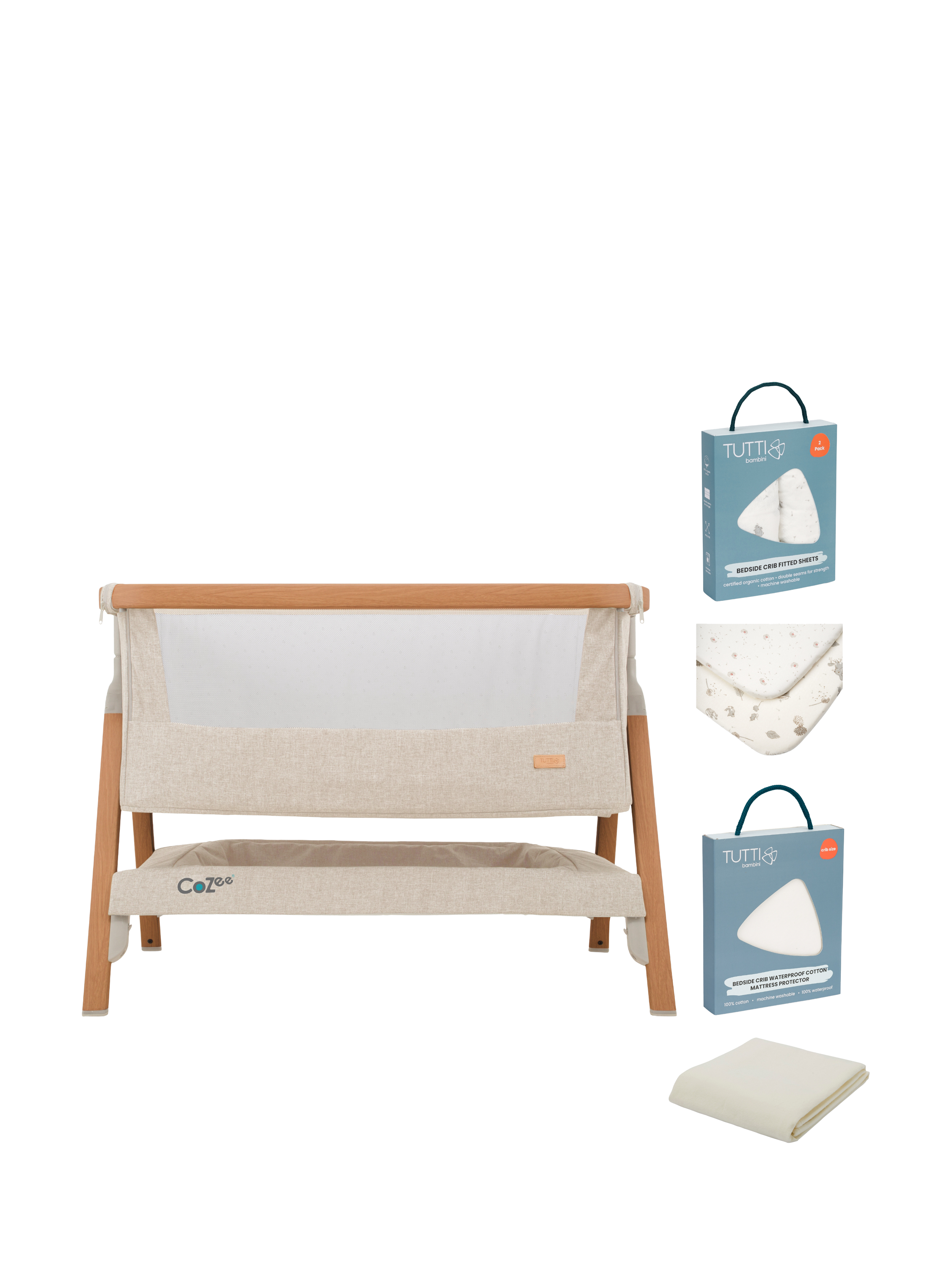 All the benefits of the Tutti Bambini CoZee bedside crib but in one essential starter bundle. This set includes the CoZee bedside crib, mattress, travel bag, breathable mattress protector and two fitted sheets.