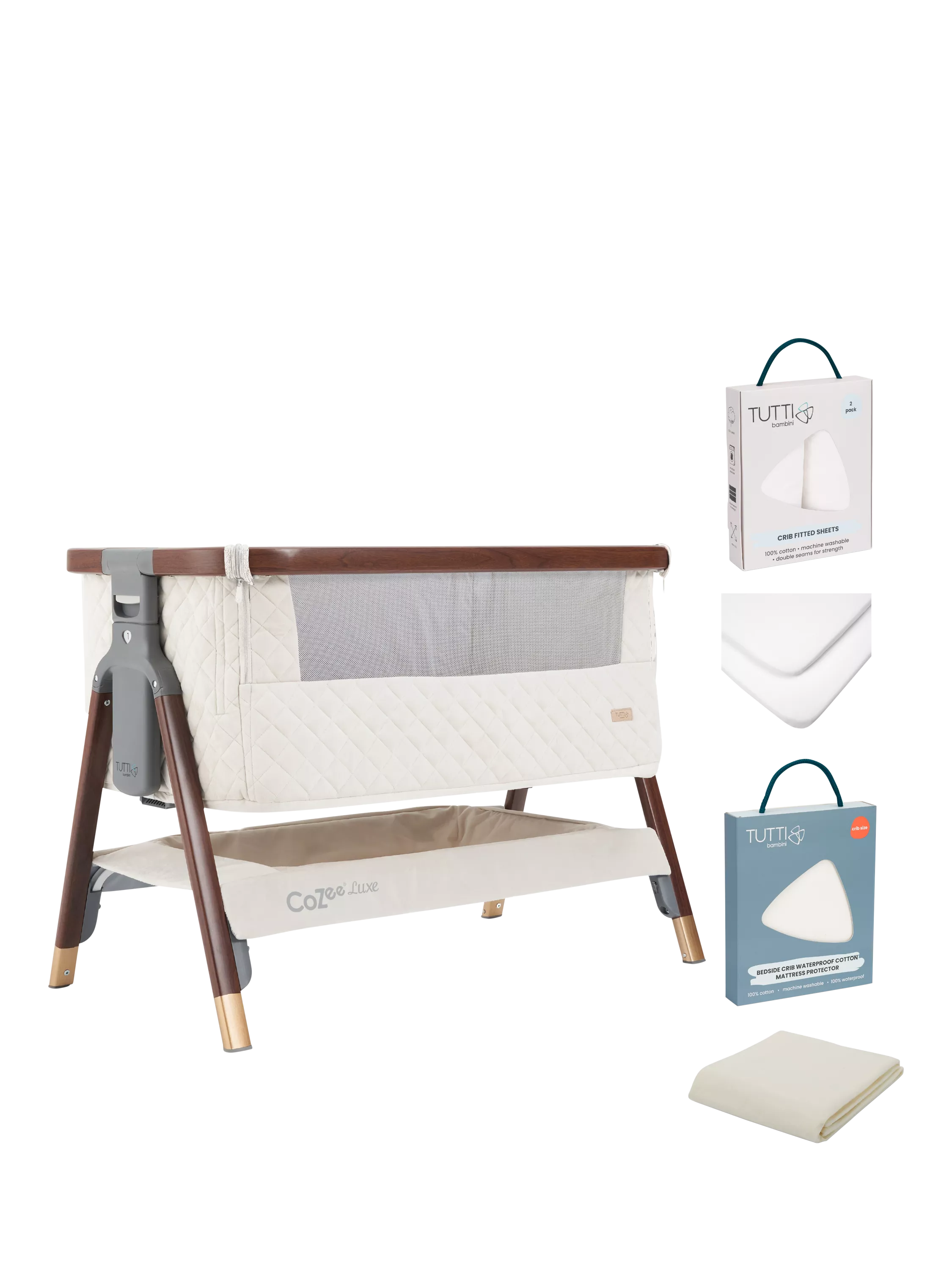 Tutti BambiniCoZee Luxe Bedside Crib Essential Bundle, Walnut/Cream