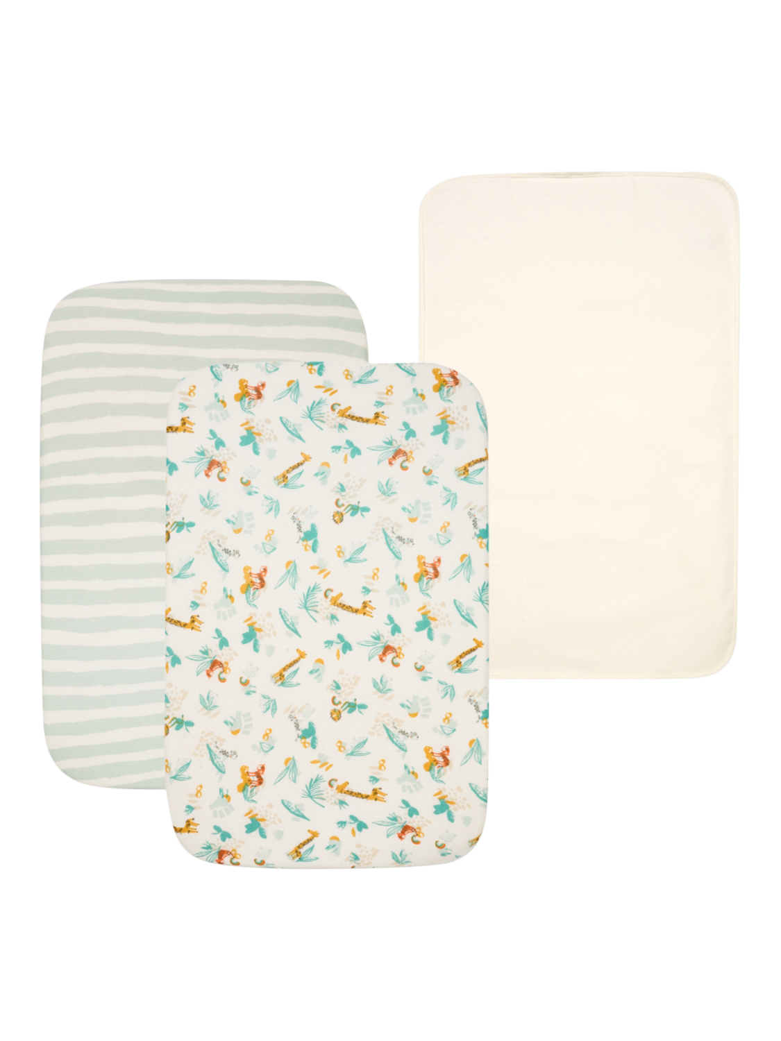 The bundle also includes one Waterproof Mattress Protector made from machine washable, absorbent cotton and designed to go under your crib fitted sheets.