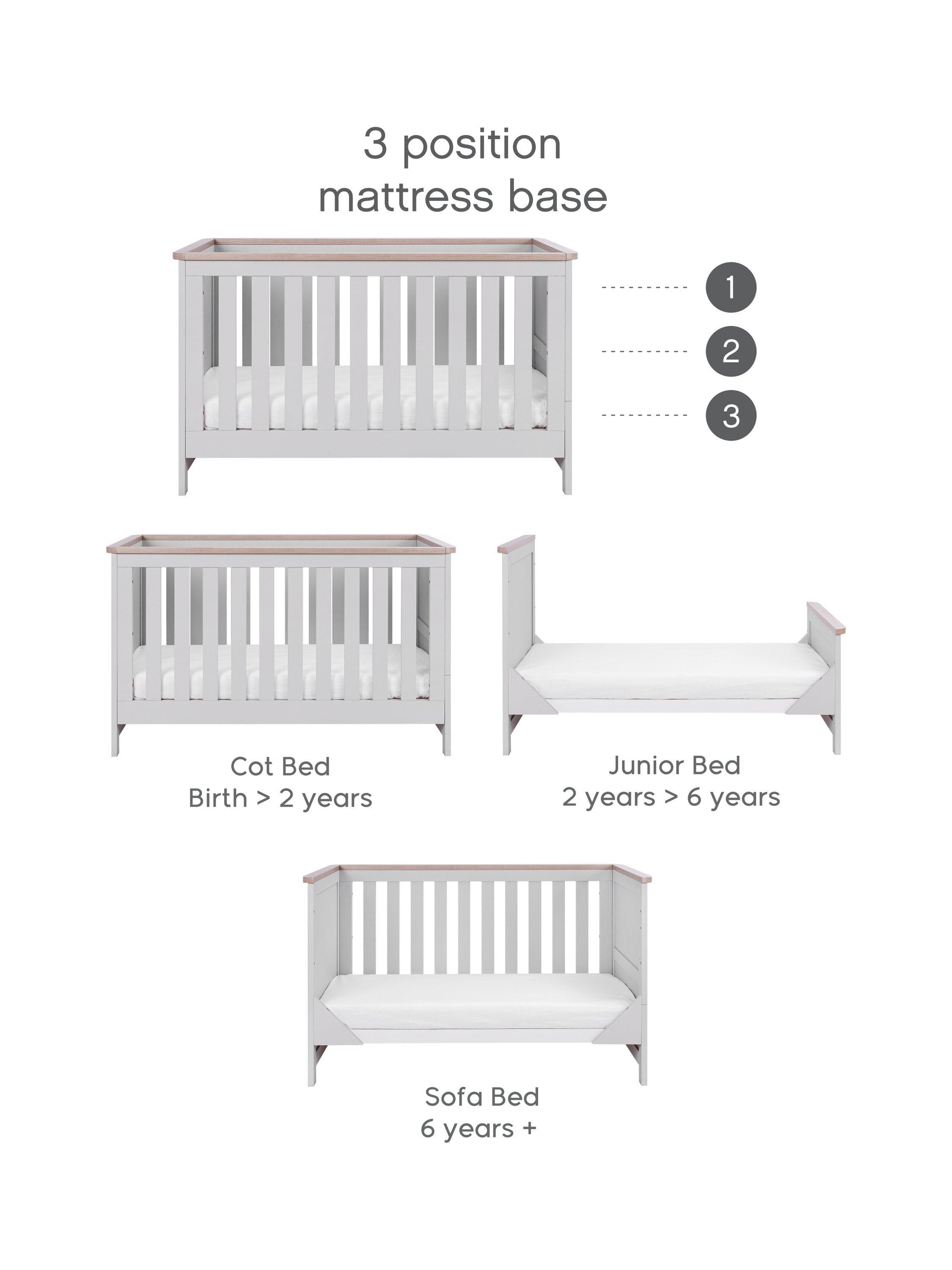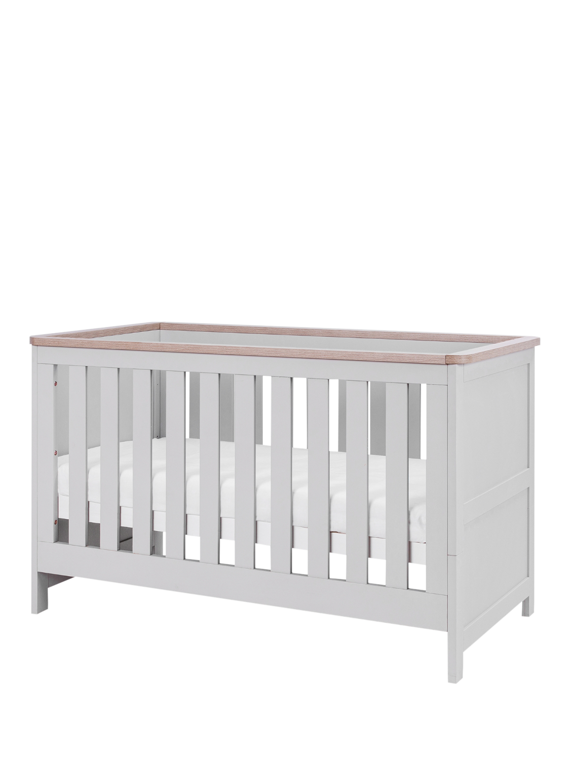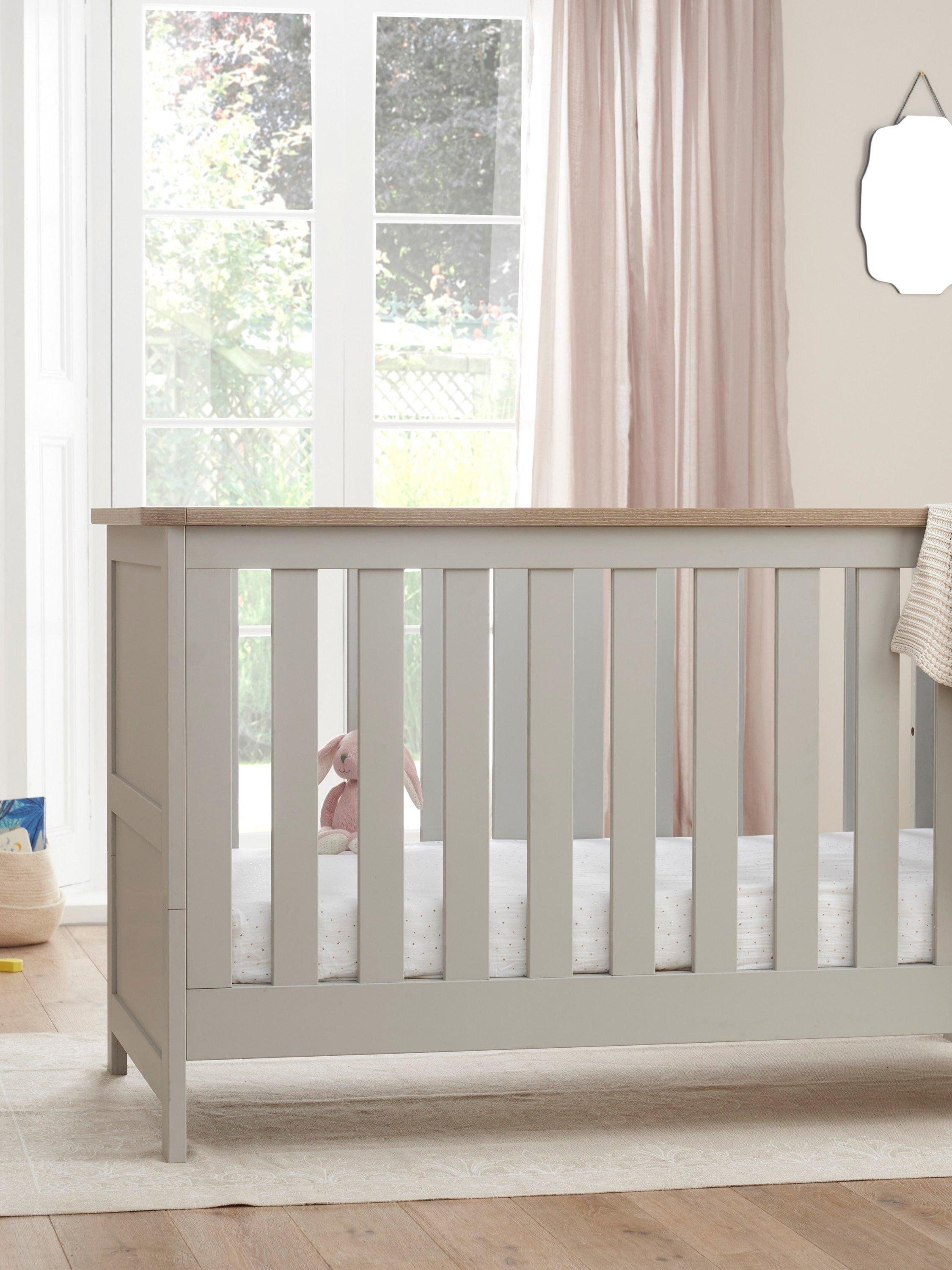 The Verona Cot Bed with a Pocket Sprung Mattress is a beautiful, clean-lined traditional style in a soft dove grey and oak or white and oak finish. The full size cot bed is suitable from birth and has 3 adjustable mattress heights. It easily converts in to a toddler bed and later a sofa.