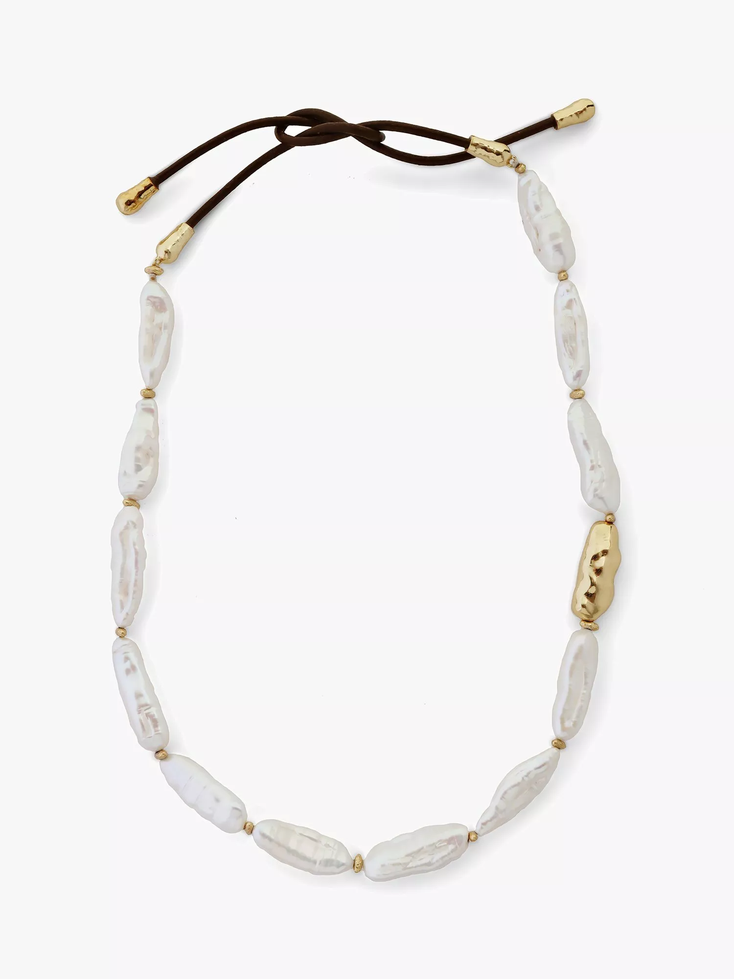 A modern take on traditional pearls, this necklace features naturally shaped freshwater pearls necklace spaced with metal beads and a single nugget to one side. All are strung on a leather chain that can be tied for a secure hold.