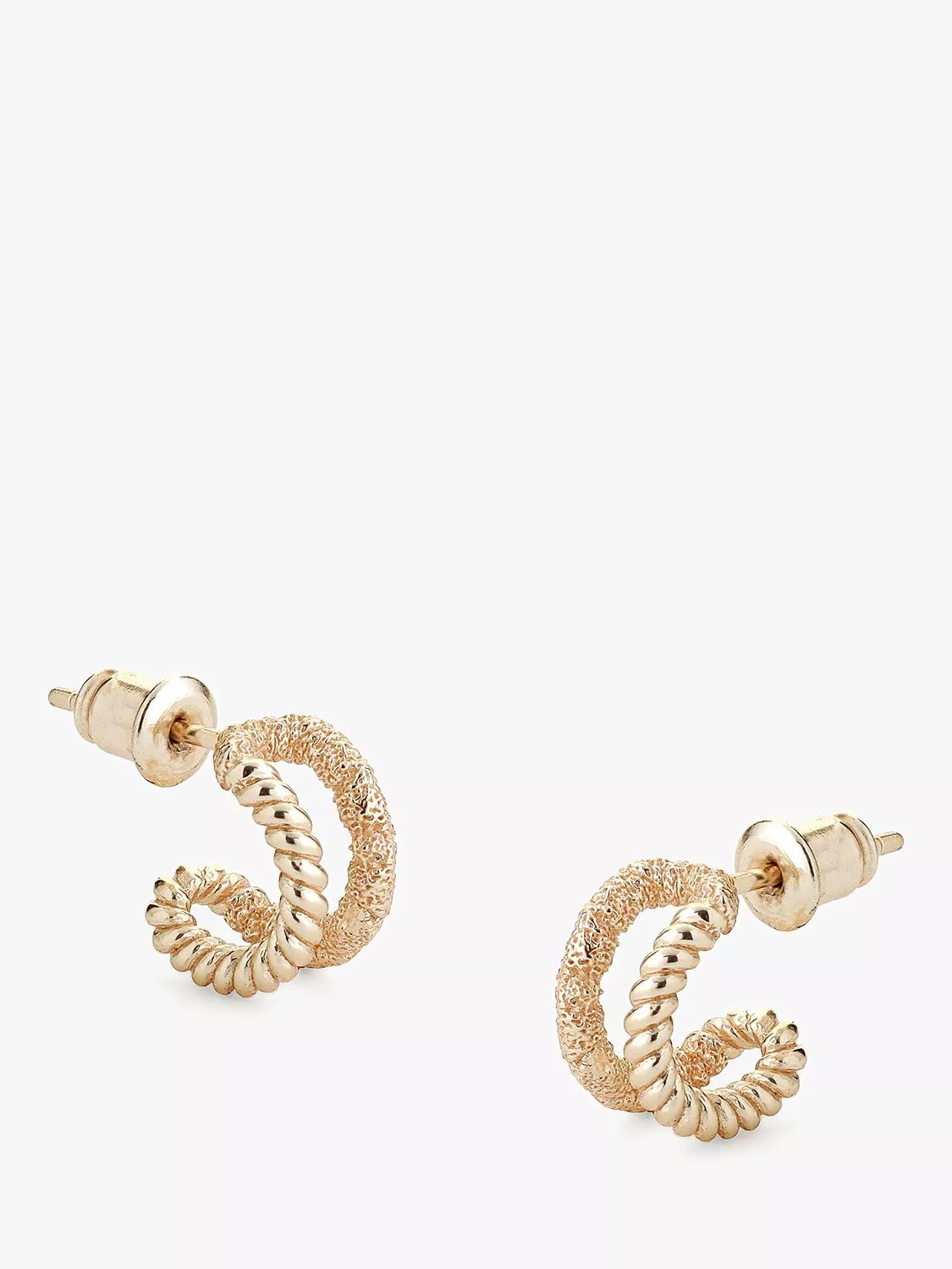 These double-row open hoop earrings have rope detail on one side and coastal-inspired textured detailing on the other. It is handcrafted from recycled material and finished with an anti-tarnish, water-resistant coating. For pierced ears only.