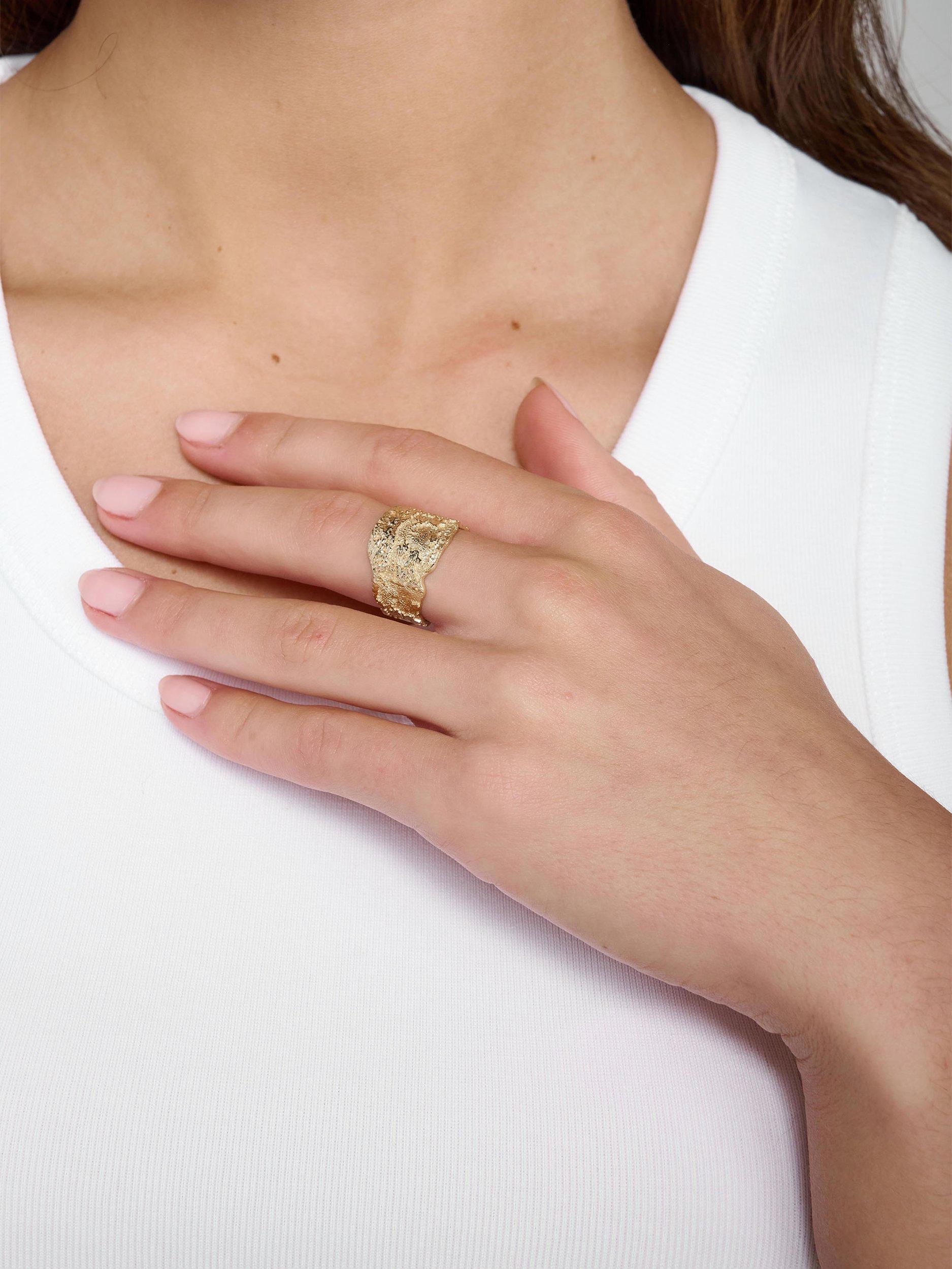 A statement textured Tutti & Co ring – handcrafted from recycled materials and finished with an anti-tarnish, water-resistant coating. Its unique form seamlessly blends style with comfort, perfect for everyday wear or memorable moments. Presented in a jewellery pouch.