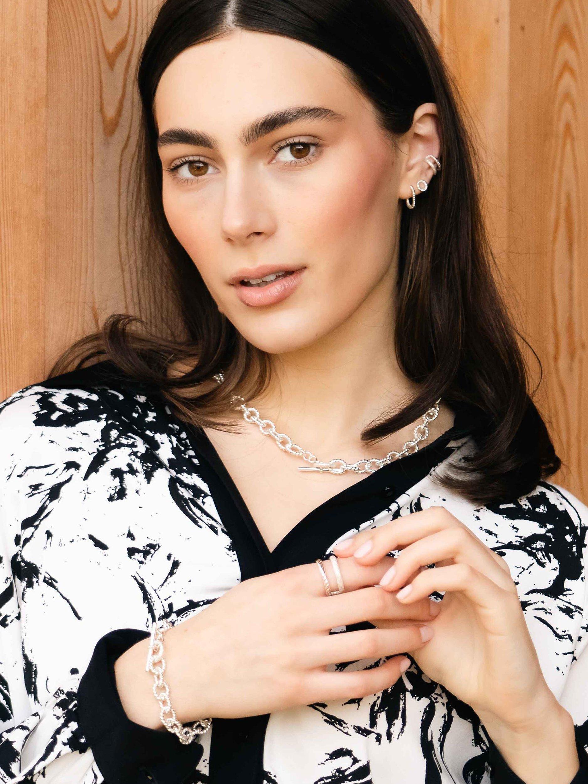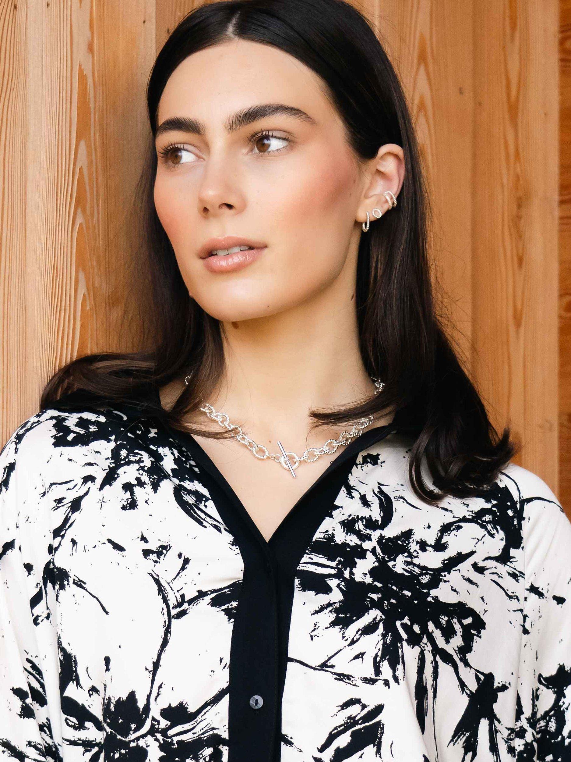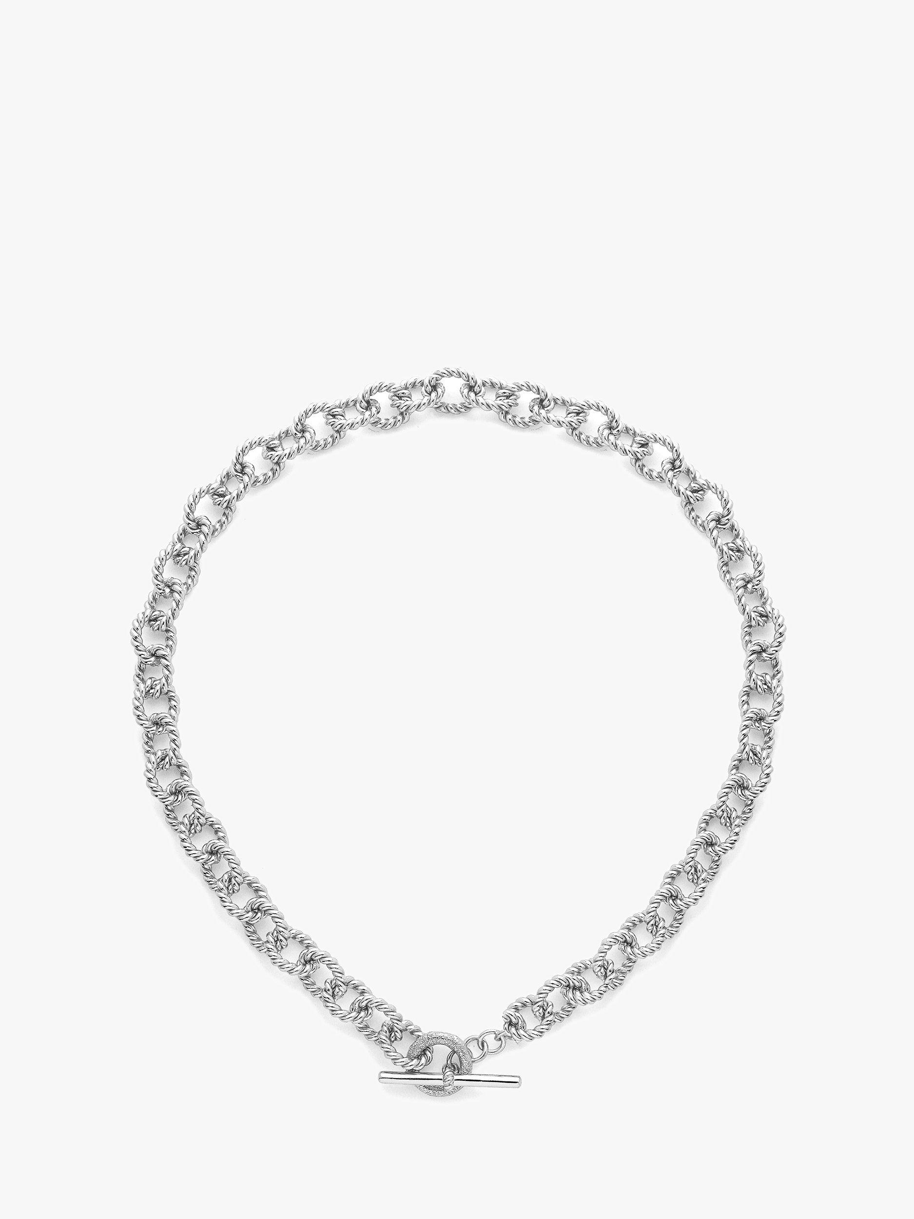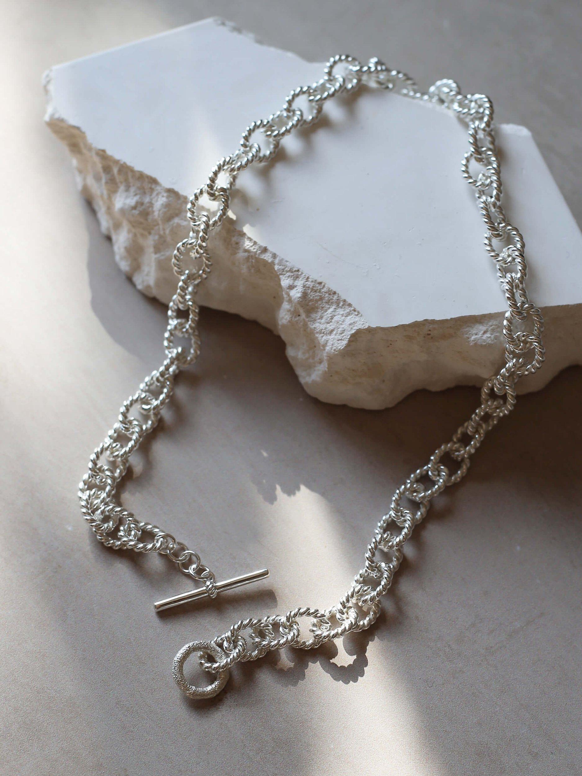 This chunky chain necklace has a rope-inspired texture and a t-bar fastening. Wear T-bar at front or back for the desired look. It is handcrafted from recycled material and finished with an anti-tarnish, water-resistant coating.