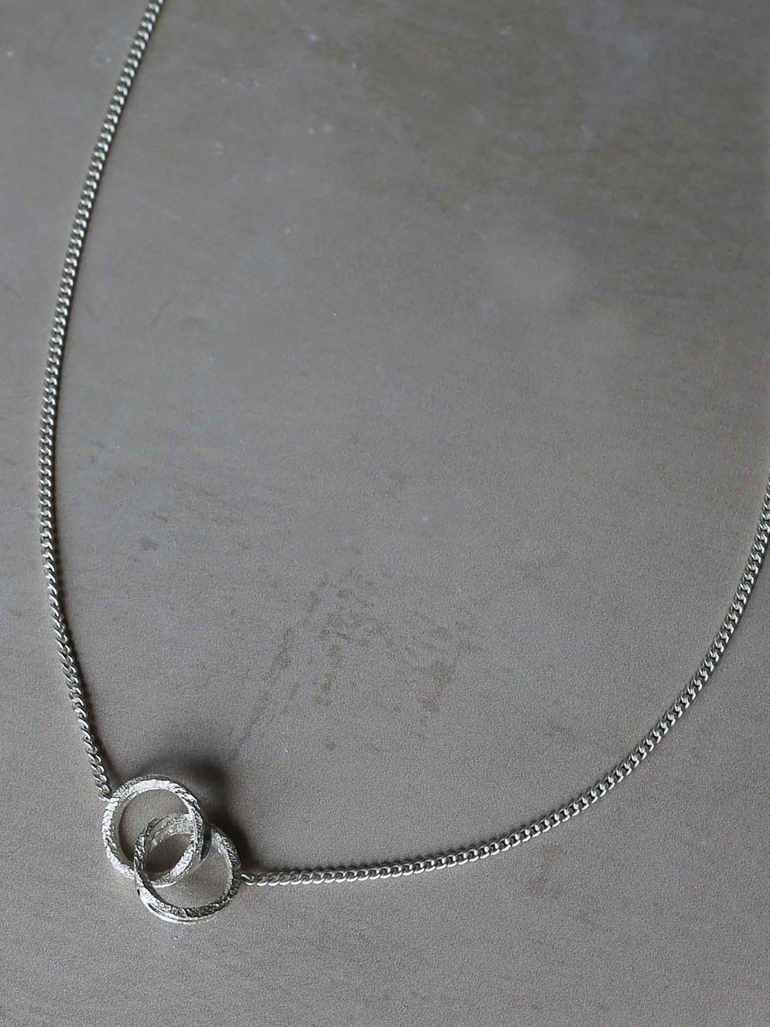 This necklace features interlocking circles with textured surfaces. Adjust to the desired length with the slider bead. Style with the matching Coast Bracelet.