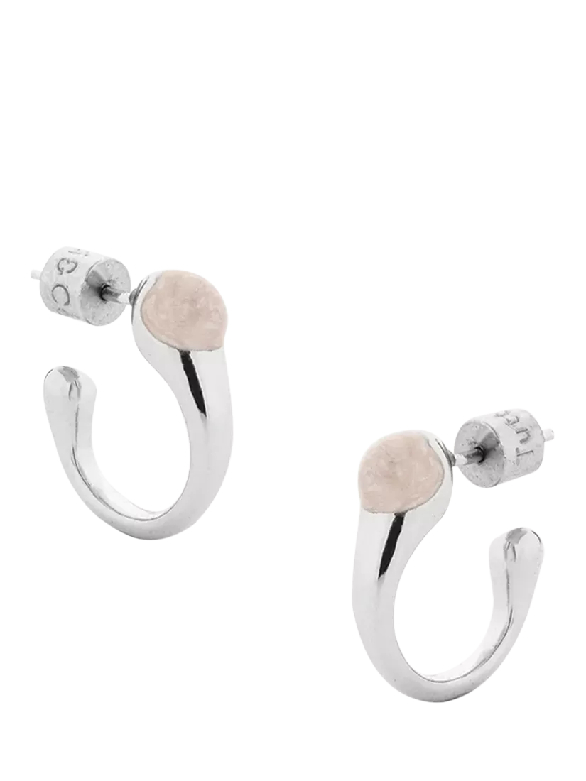 Crafted in silver-plated brass, these hoop earrings are designed with a pearl enamel inset and secured with a bullet back. Suitable for pierced ears only.