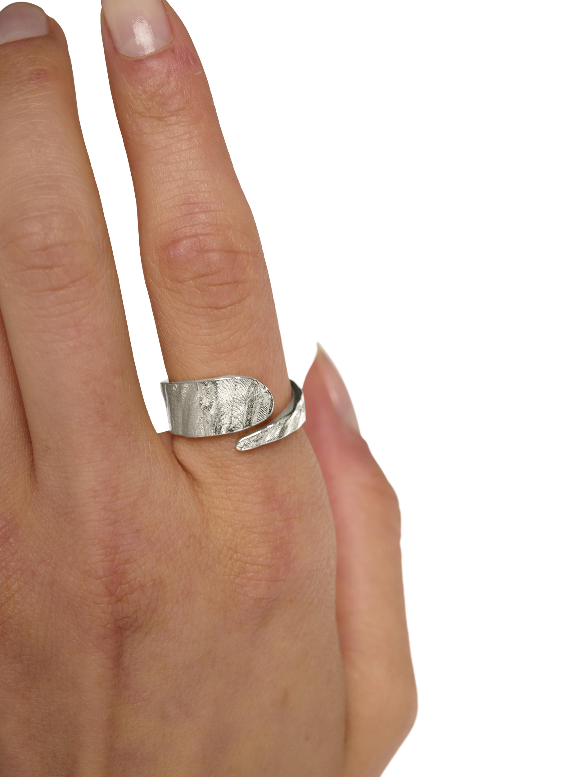 This elegant wrap ring features a contemporary ripple texture that mimics the movement of water. Designed for versatility, the open silhouette can be gently squeezed or opened for a custom fit. A sophisticated one-size essential.