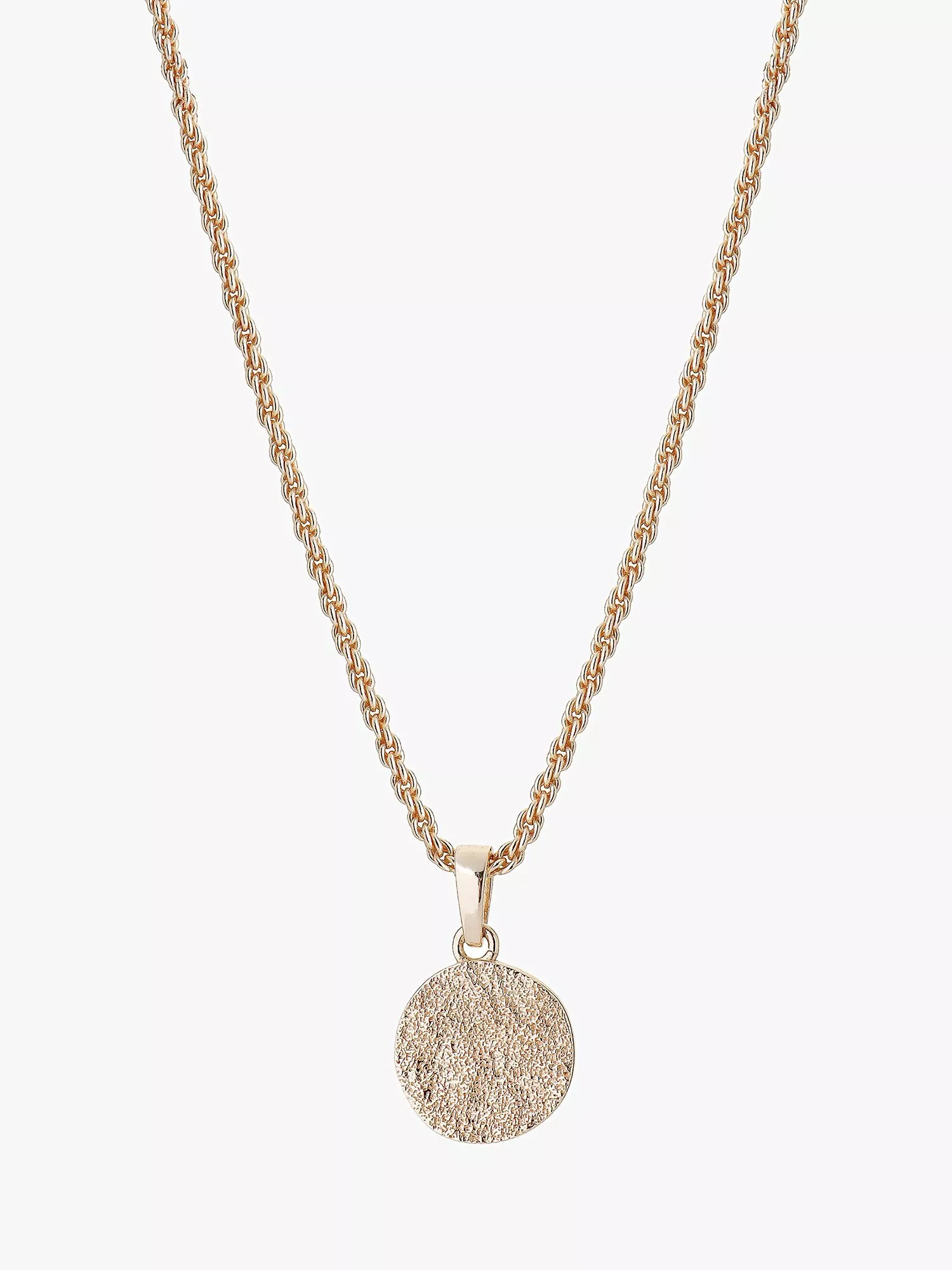 A textured disc hangs from a fine chain in this pendant necklace. It is finished with an anti-tarnish, water resistant coating.