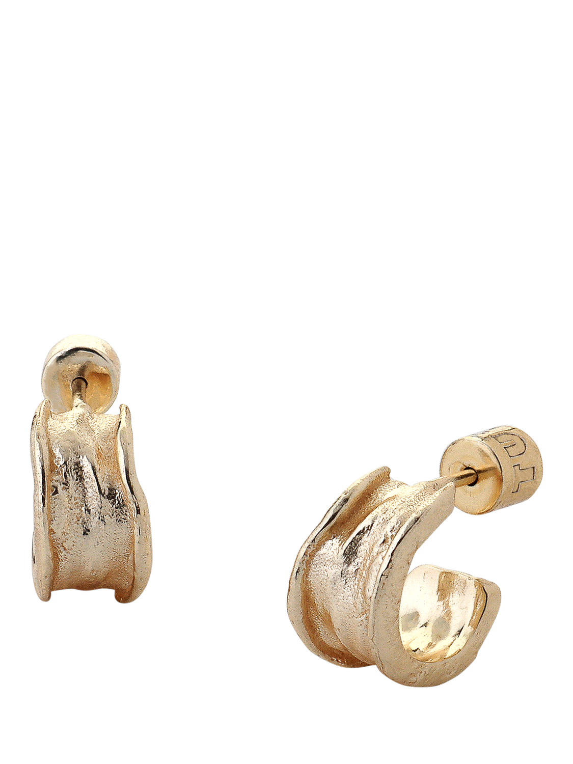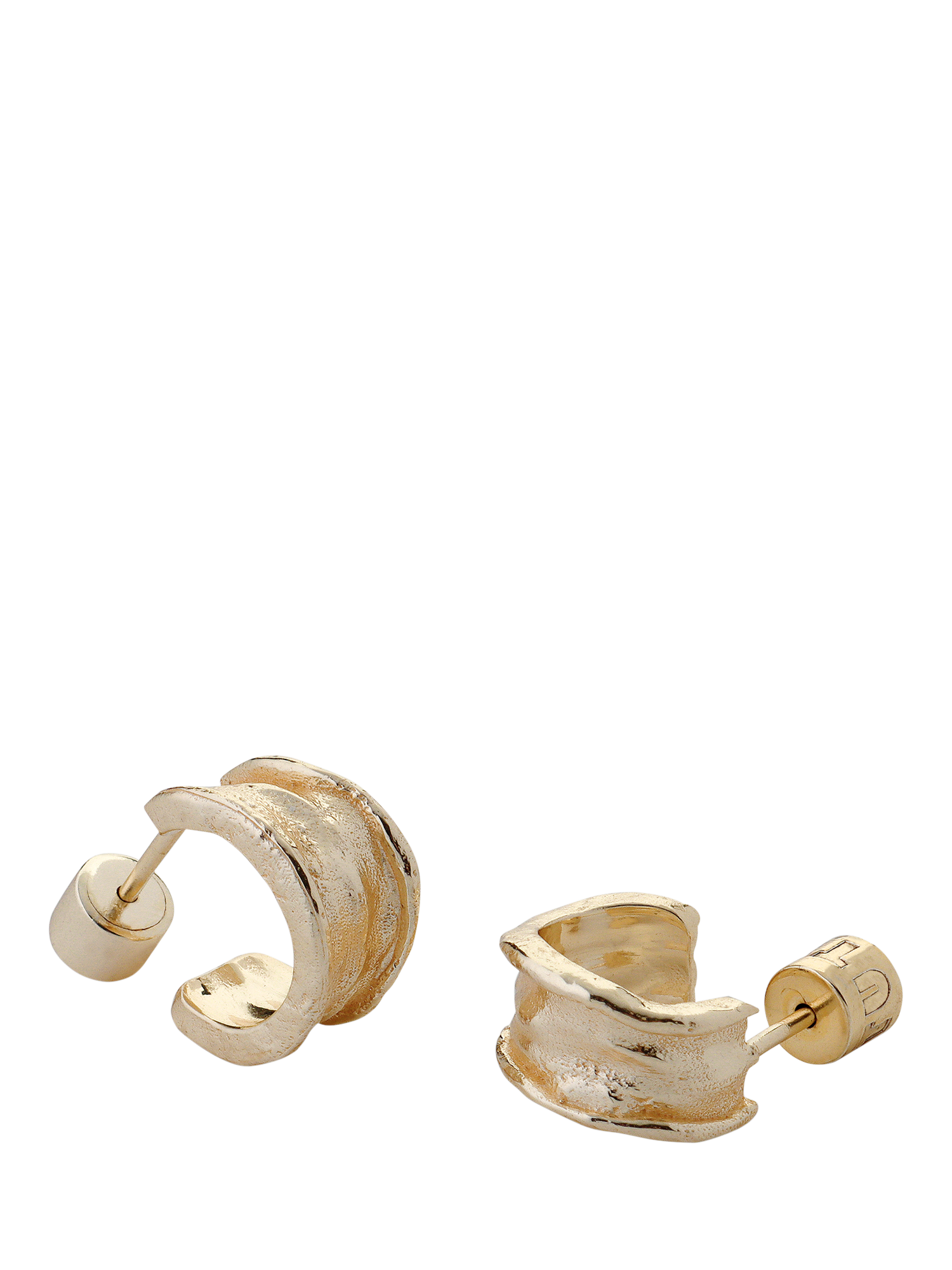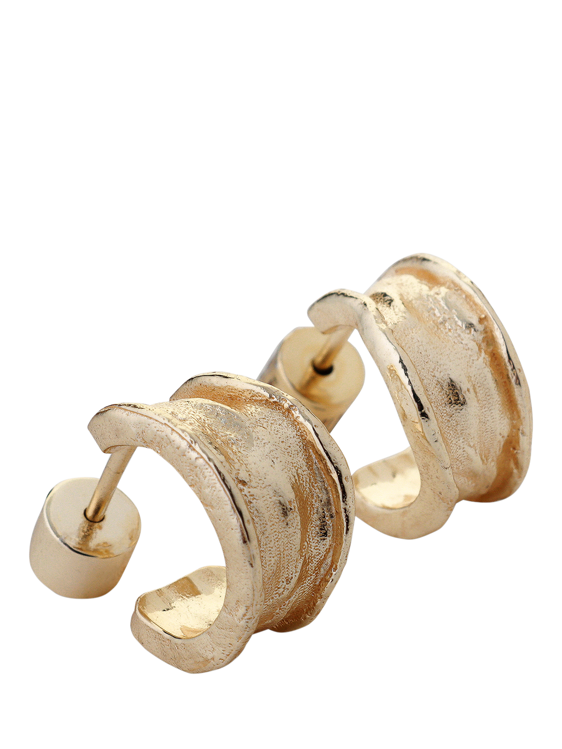 Small hoop earrings with stud backs in an uneven textured finish. Height: 1.3cm.